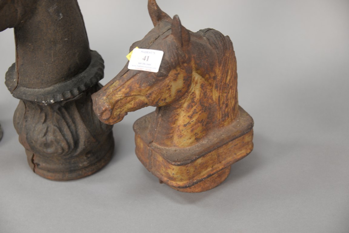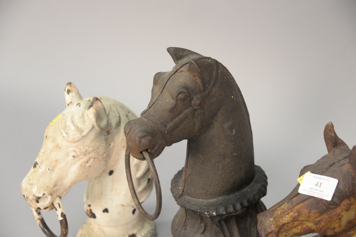 Lot 41: Three piece lot with three iron horsehead hitching post tops. ht. 9 3/4in. to 13in. Provenance: Estate of Arthur C. Pinto, MD