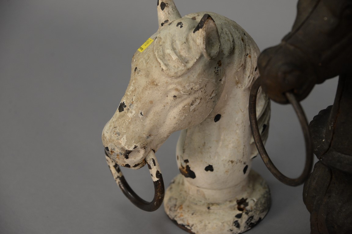 Three piece lot with three iron horsehead hitching post tops. ht. 9 3/4in. to 13in. Provenance: Estate of Arthur C. Pinto, MD