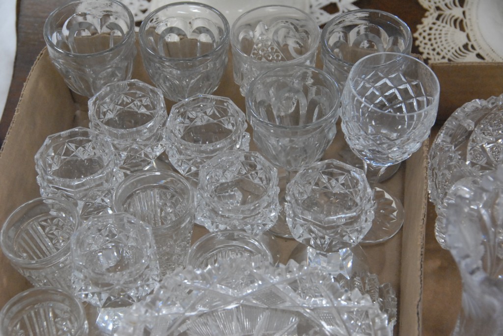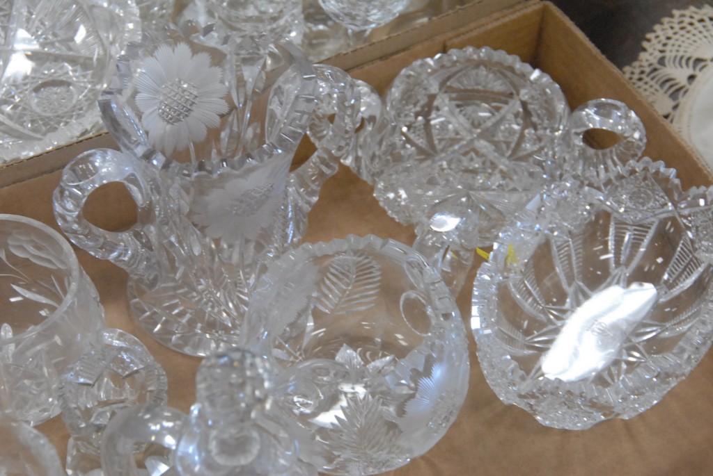 Two boxes of cut glass crystal shot glasses, small stems, creamers sugars, salts signed Val St. Lambert, bowl signed Hawks, and small pitcher signed Corning, etc.