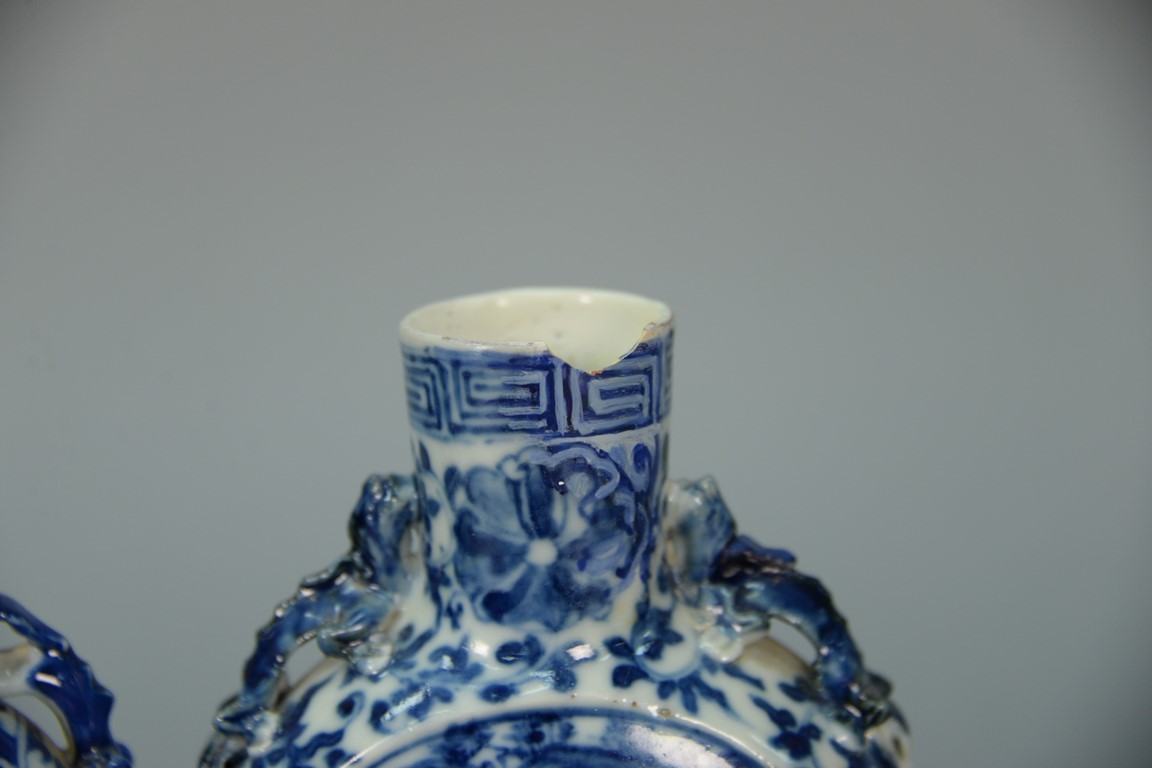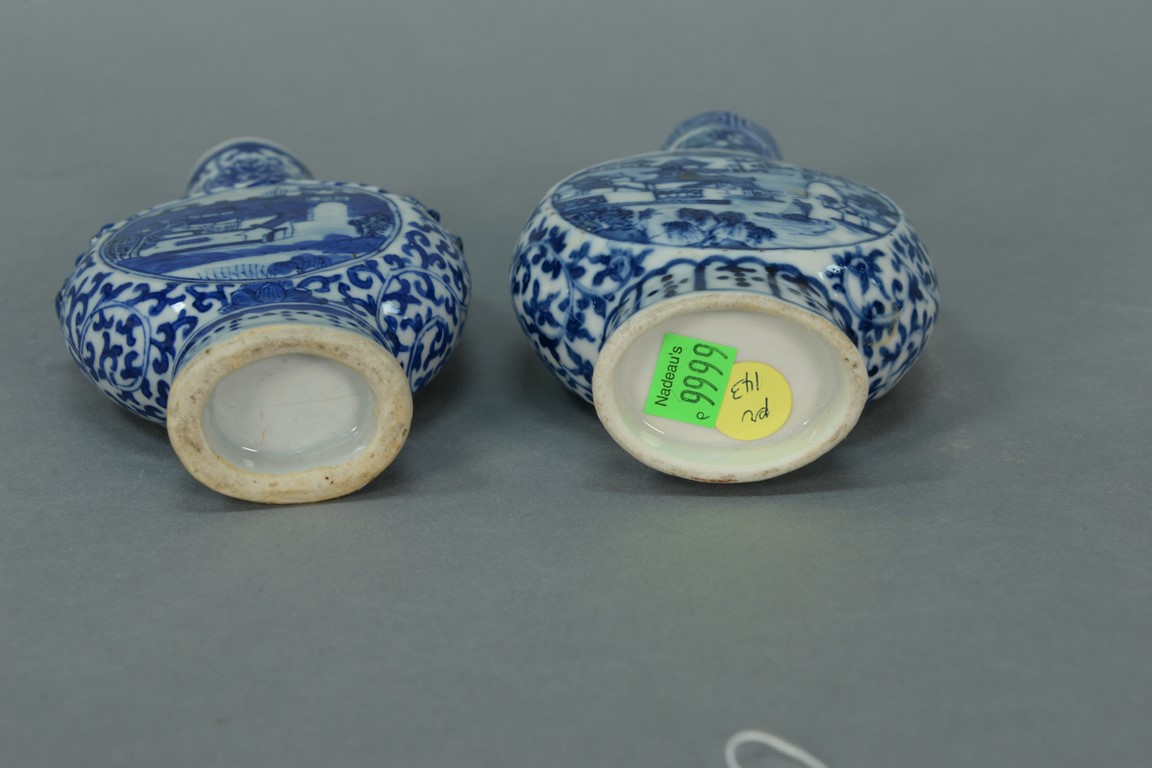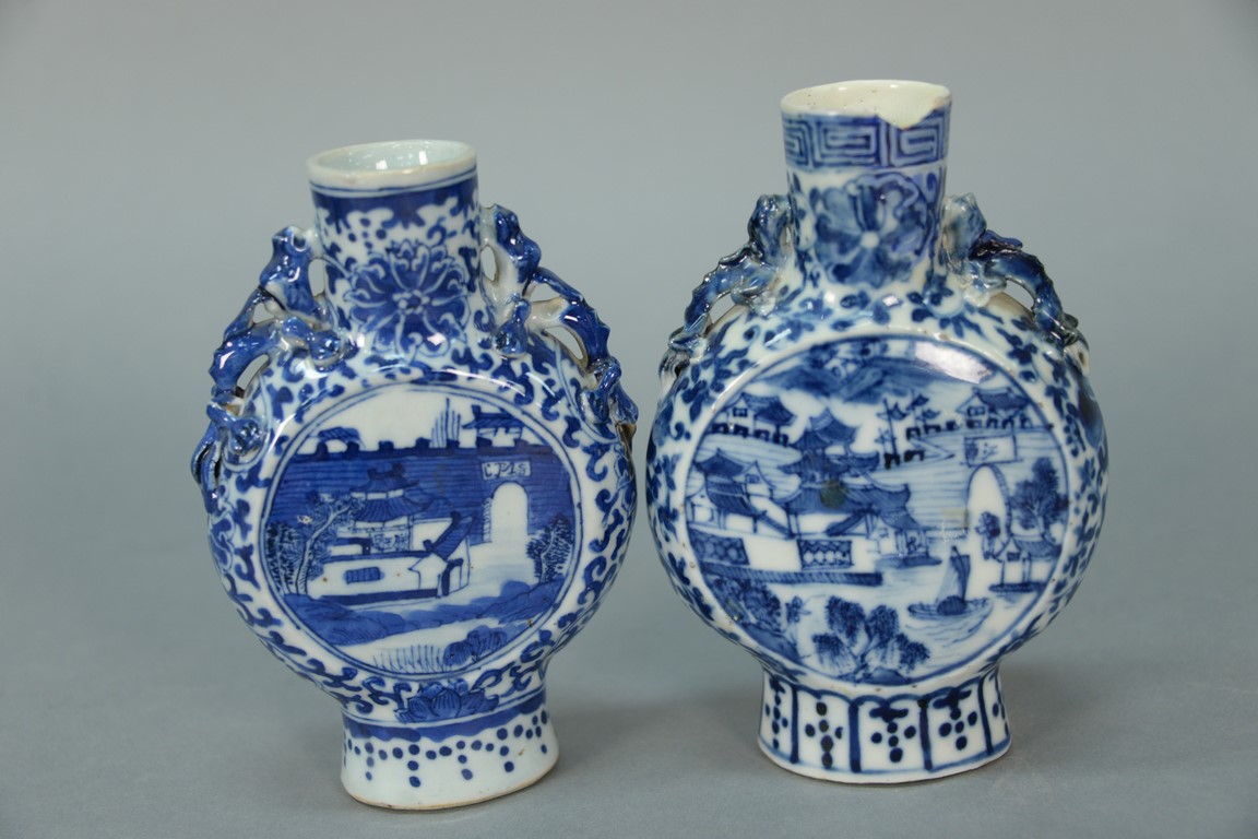 Lot 41: Two Chinese moon shaped vases on footed base, each with circular blue scenes. one top chipped and repaired, one chipped dragon on …