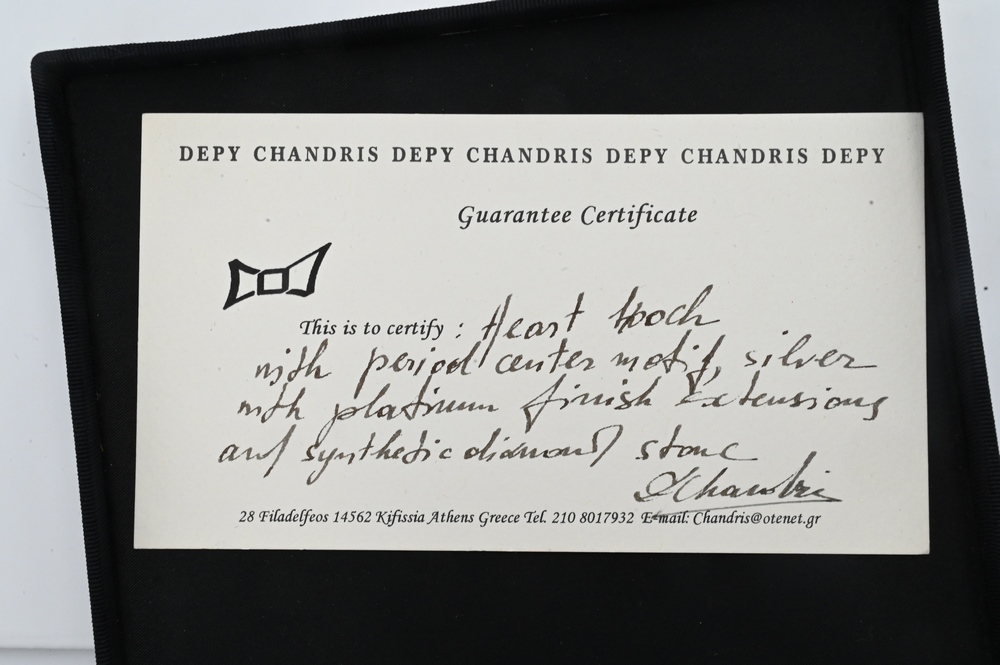 Lot 41: Two Depy Chandris Brooches, to include a heart shaped, having Depy Chandris guarantee certification; along with a silver brooch, sig…