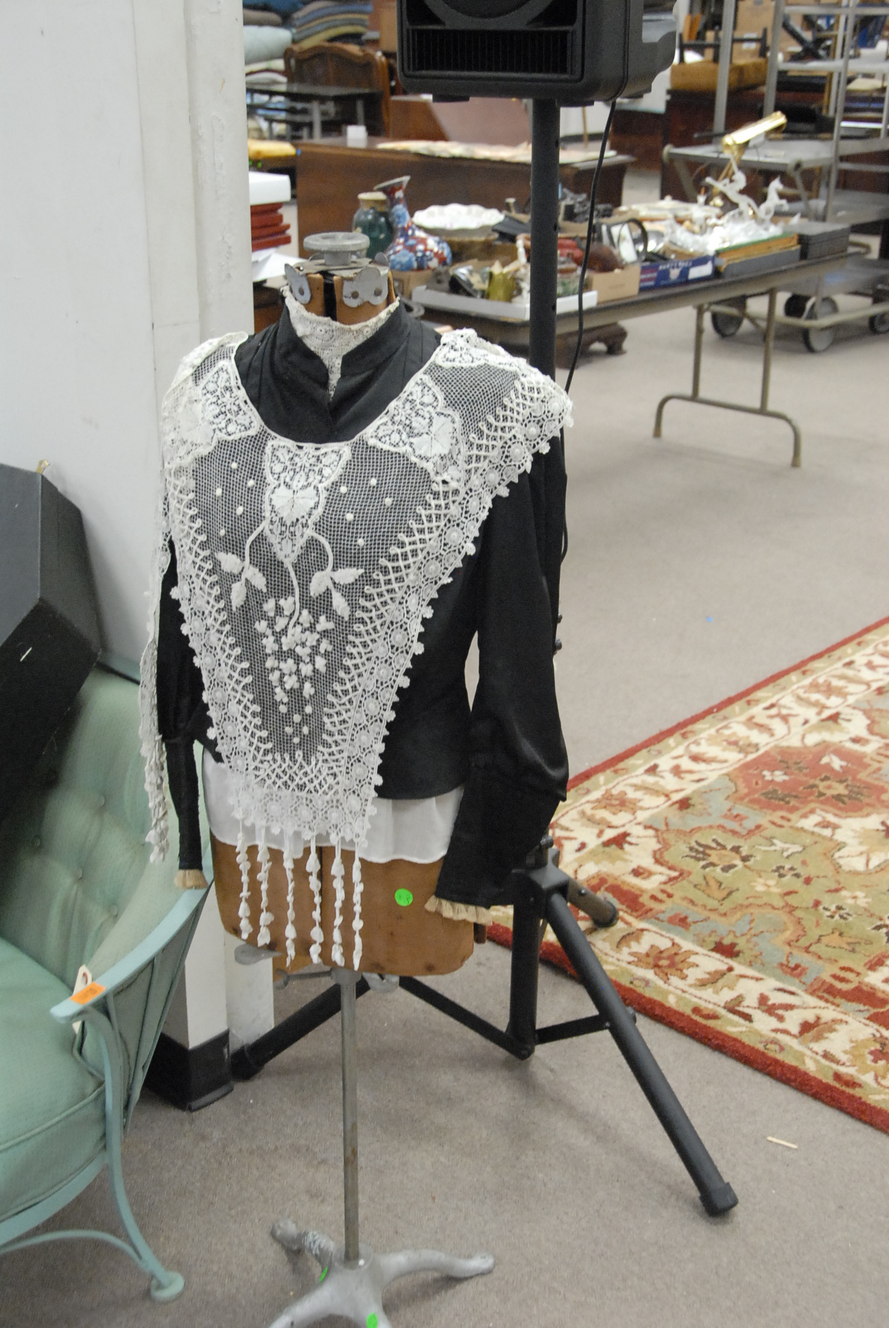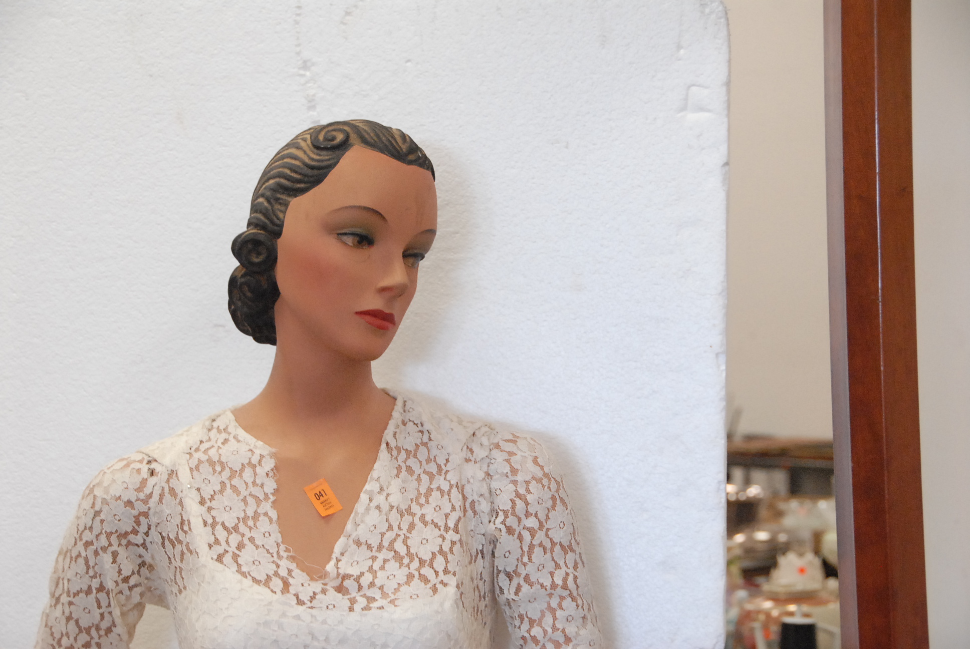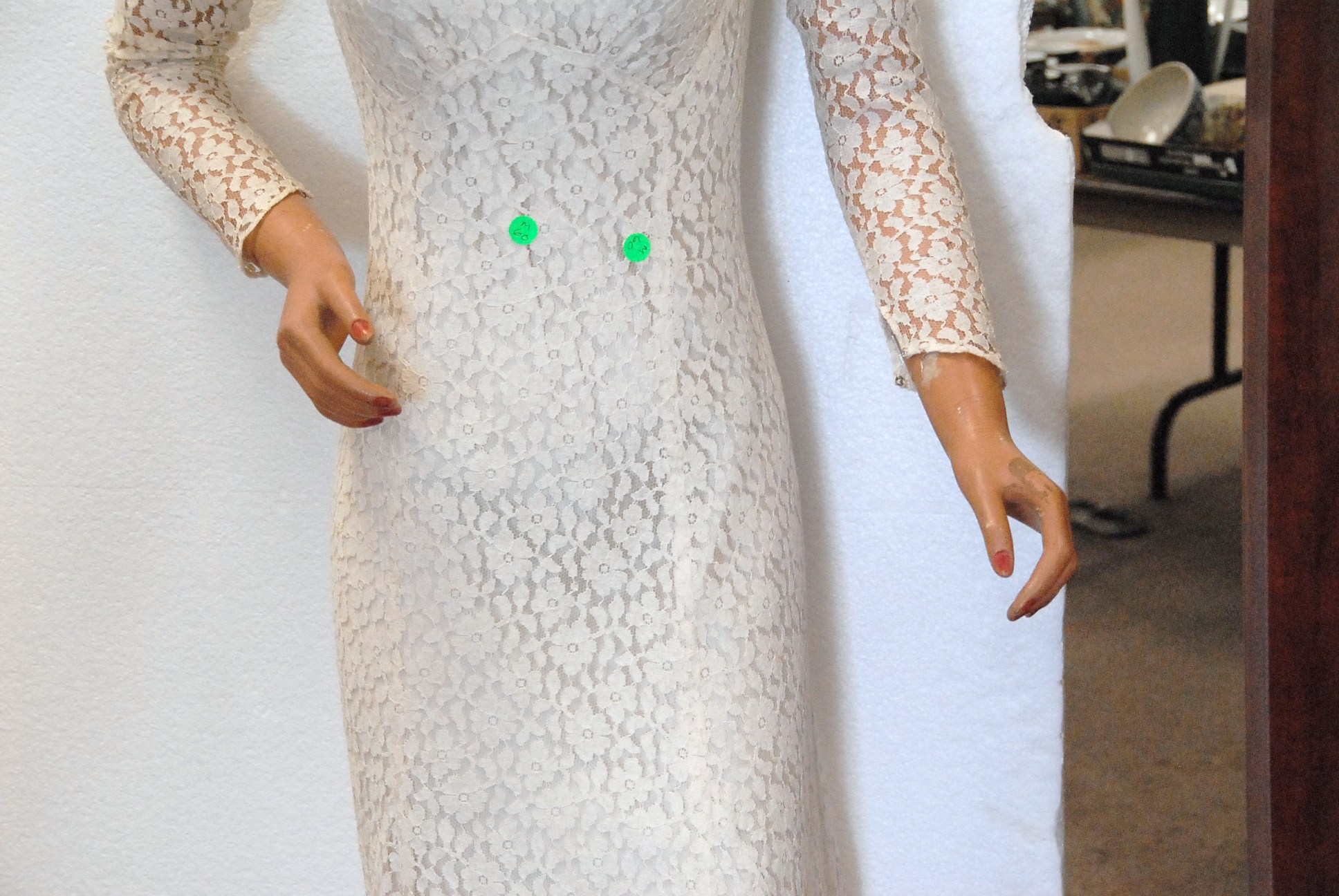Vintage mannequin with wedding dress along with a dressmaker mannequin with vintage clothing.
