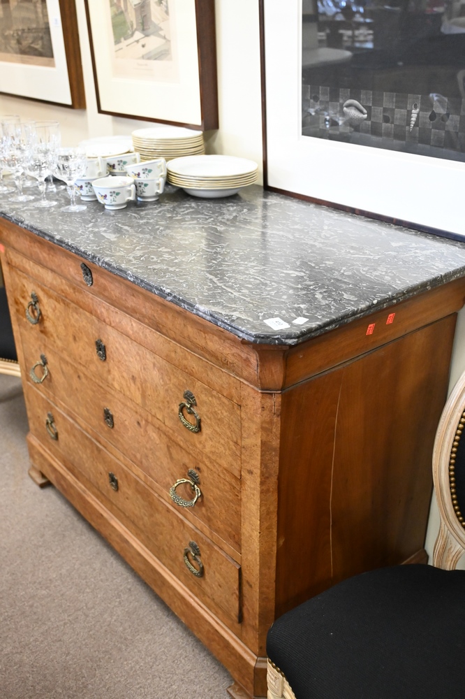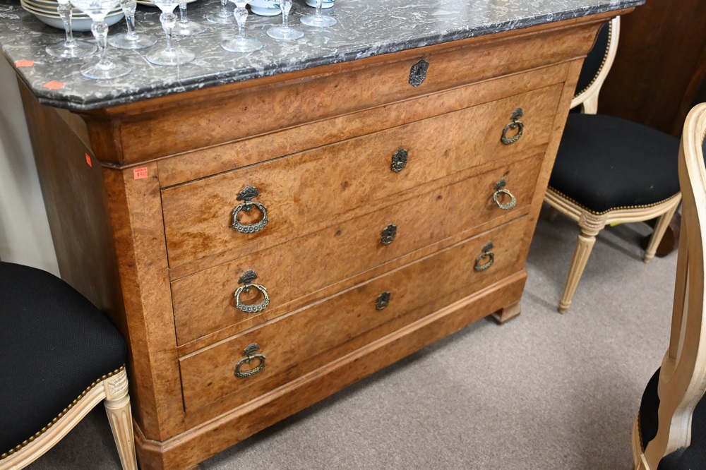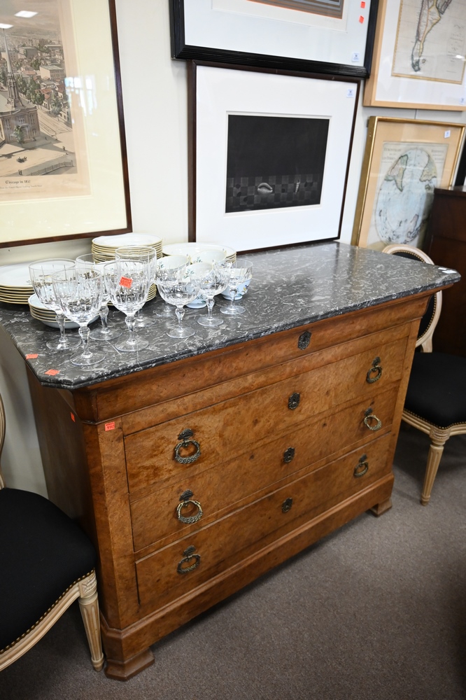Lot 410: Burlwood Server, having marble top and three drawers over bracket base, height 38 inches, width 51 inches, depth 24 inches.