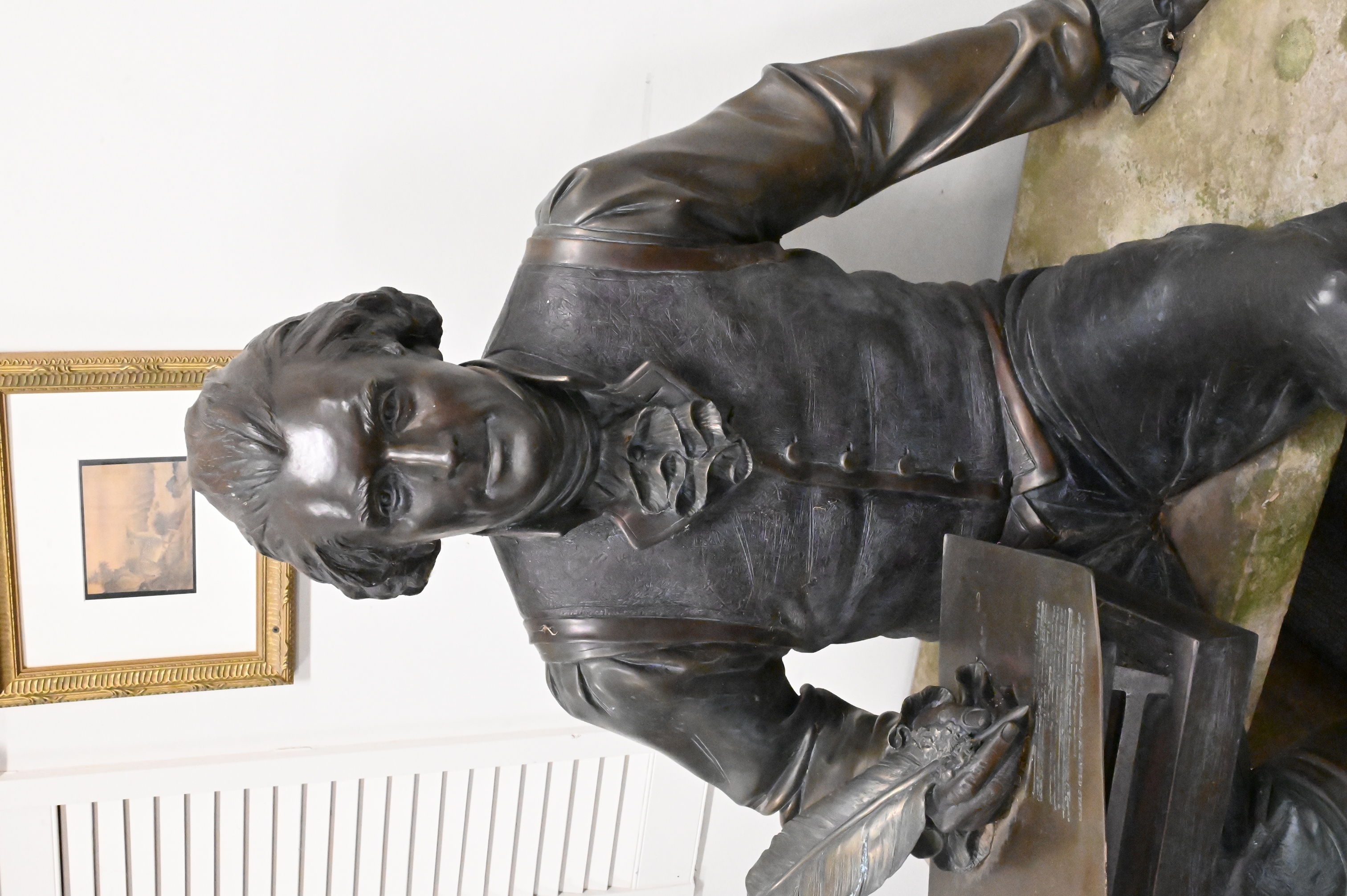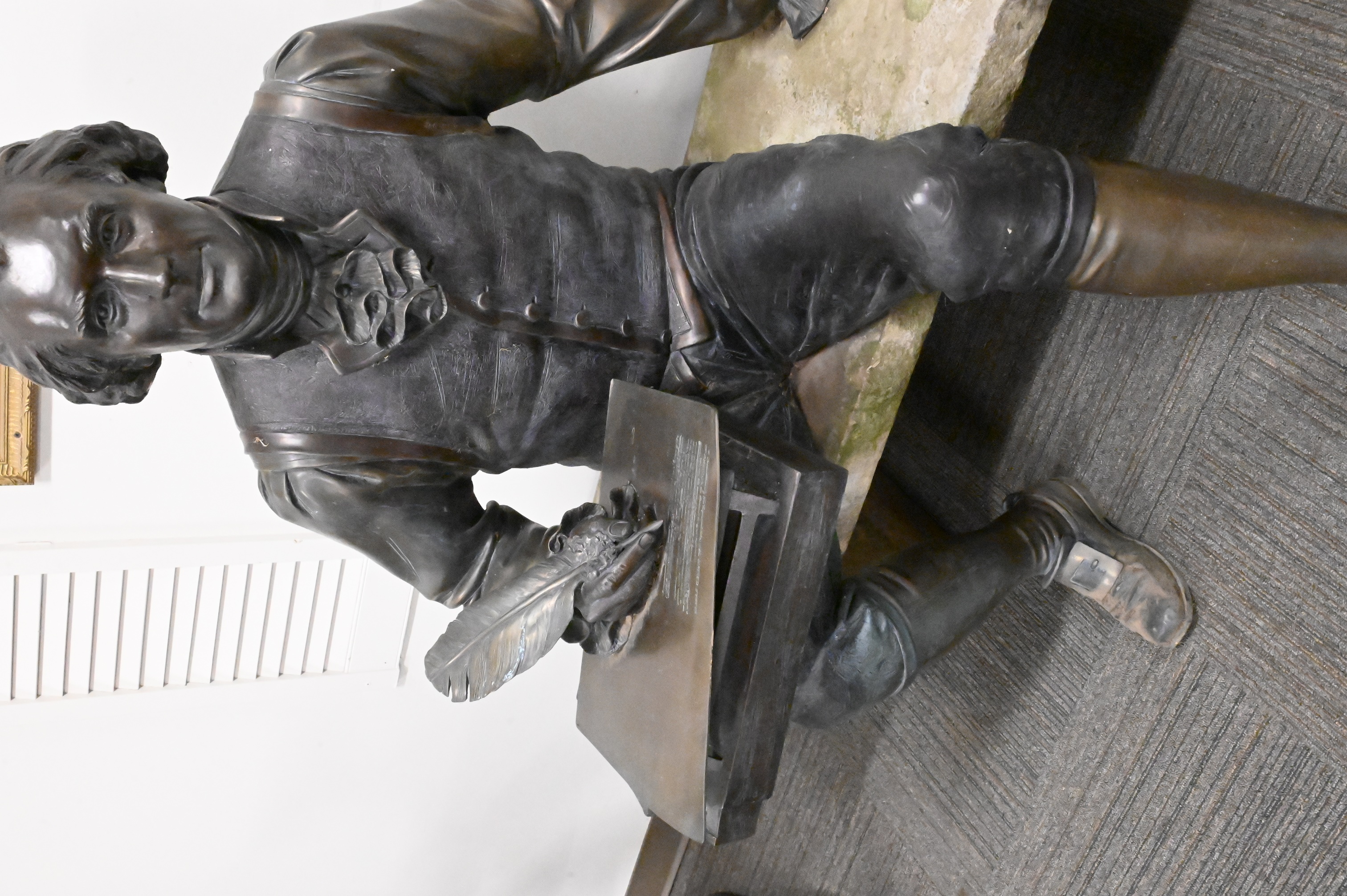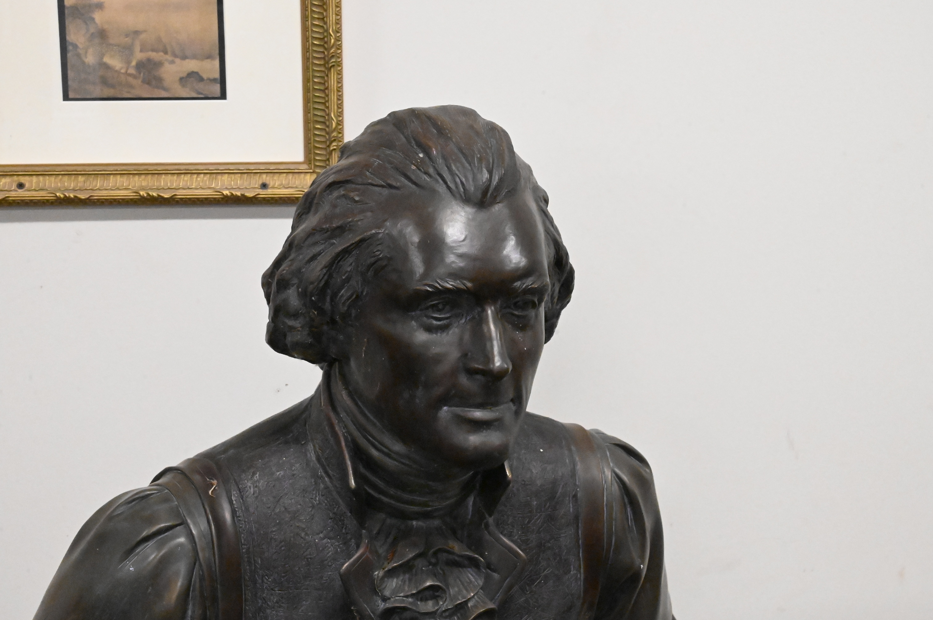 Lifesize bronze statue depicting the third president of the United States writing the Declaration of Independence while sitting on a bench, other editions of this sculpture include one featured at Sorrel Sky Gallery with an asking price of $90,000, one located at the University of Missouri next to the David R. Francis Quadrangle, as well as one located at Booth Western Art Museum, Georgia