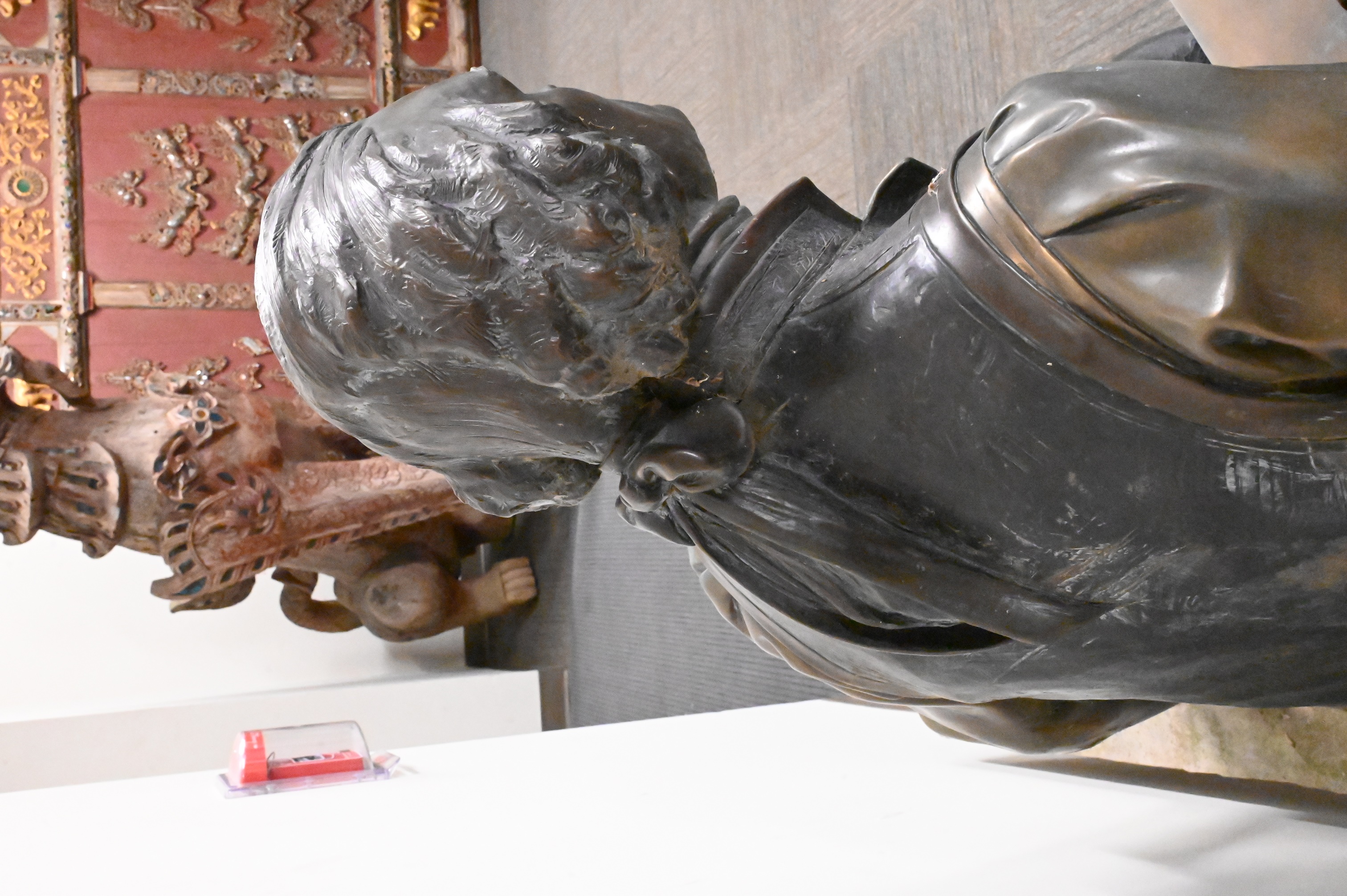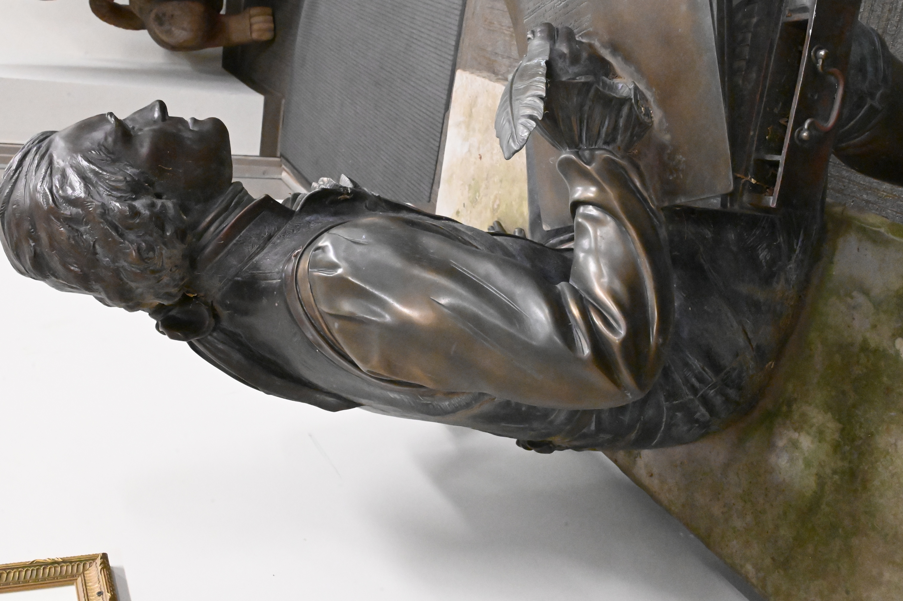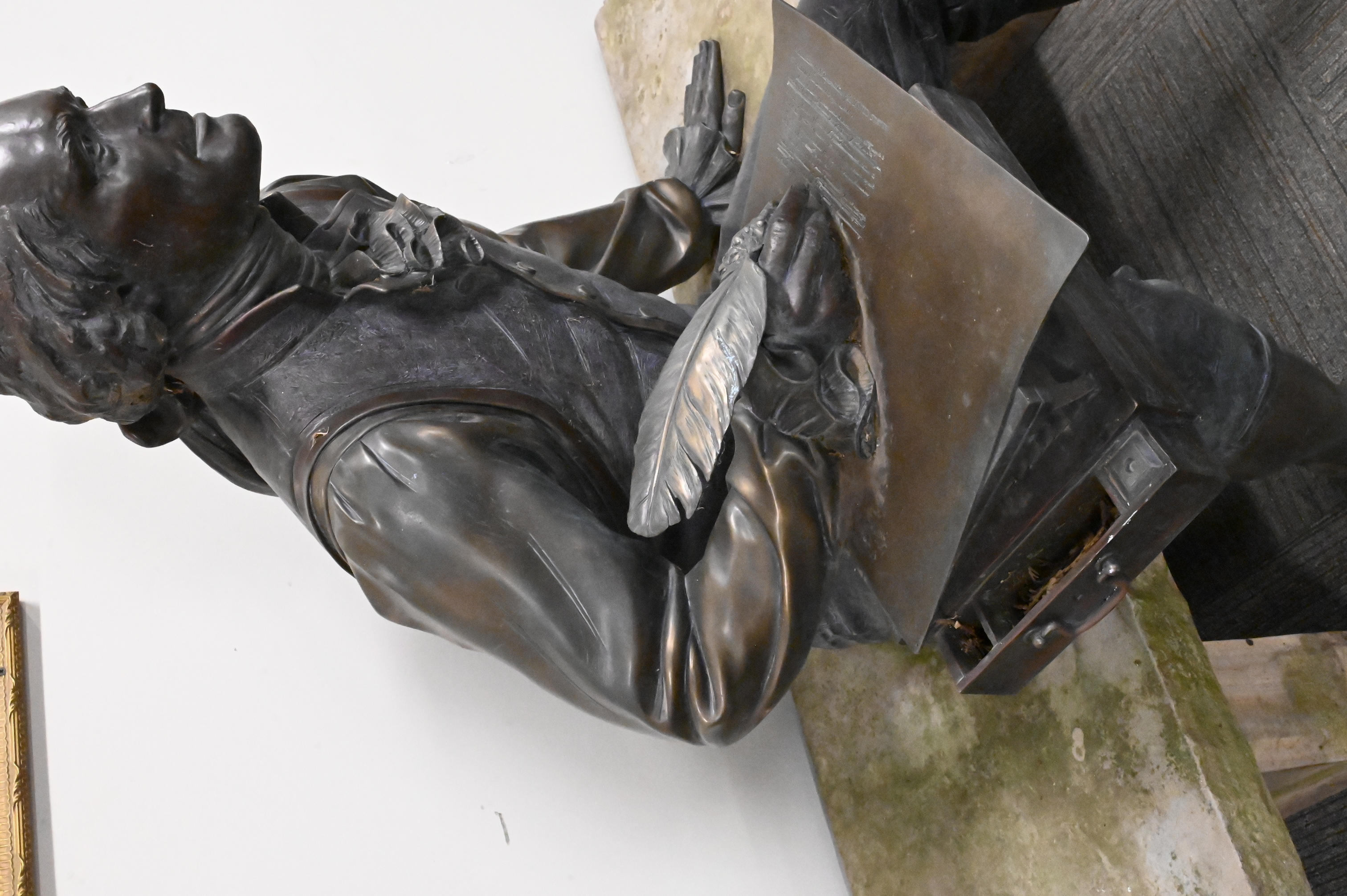 Lifesize bronze statue depicting the third president of the United States writing the Declaration of Independence while sitting on a bench, other editions of this sculpture include one featured at Sorrel Sky Gallery with an asking price of $90,000, one located at the University of Missouri next to the David R. Francis Quadrangle, as well as one located at Booth Western Art Museum, Georgia
