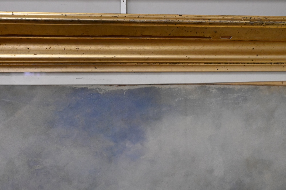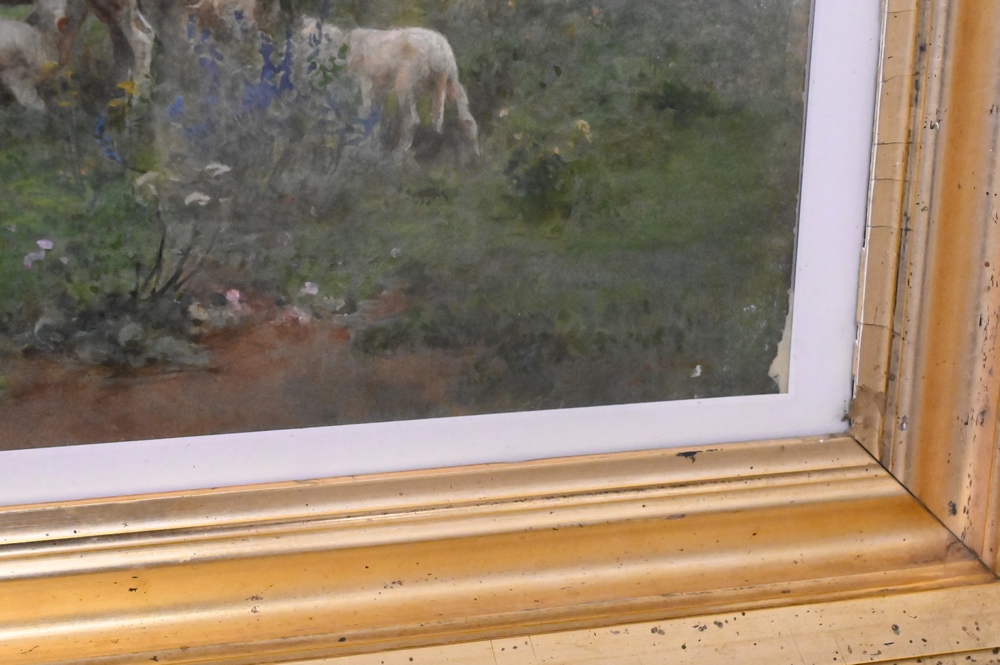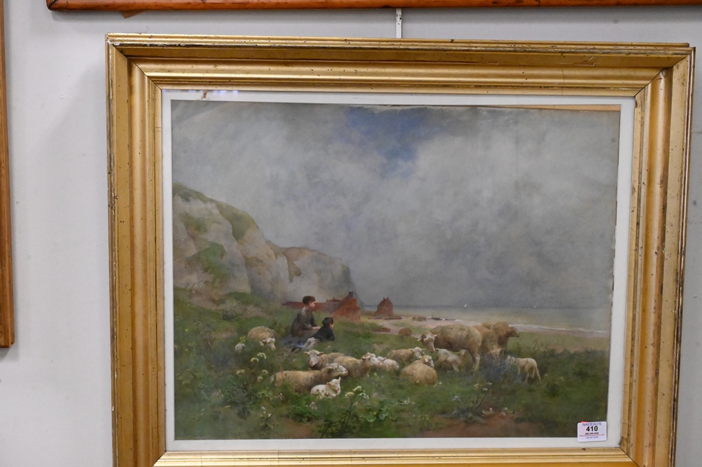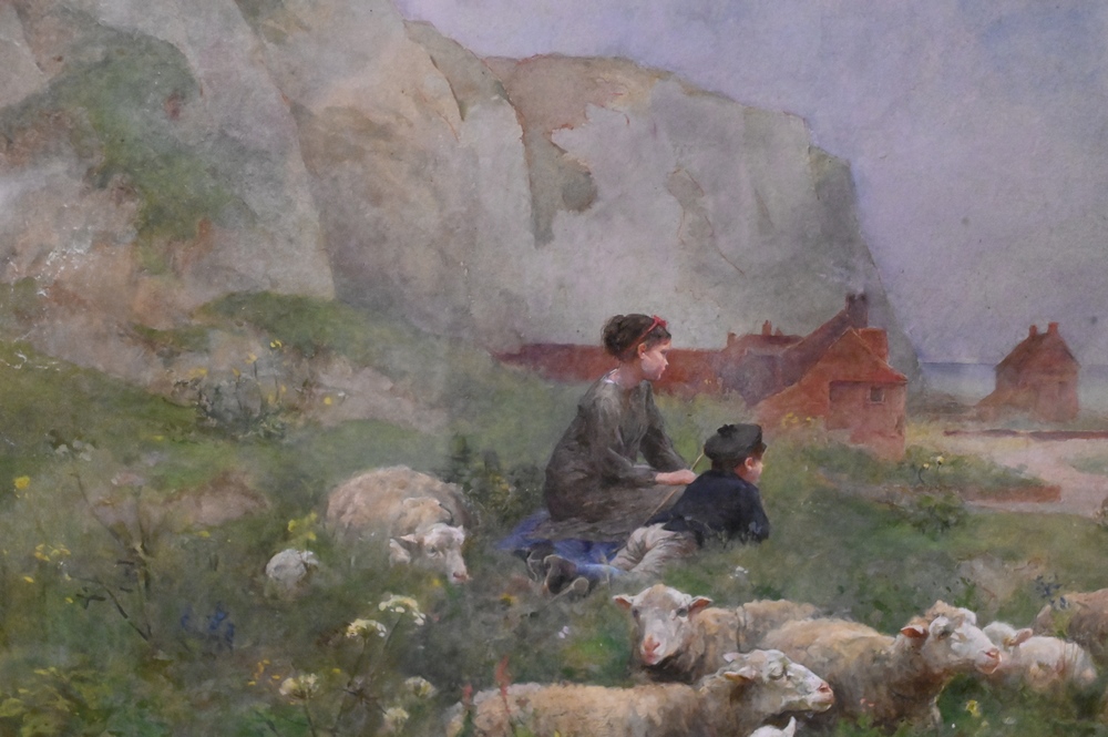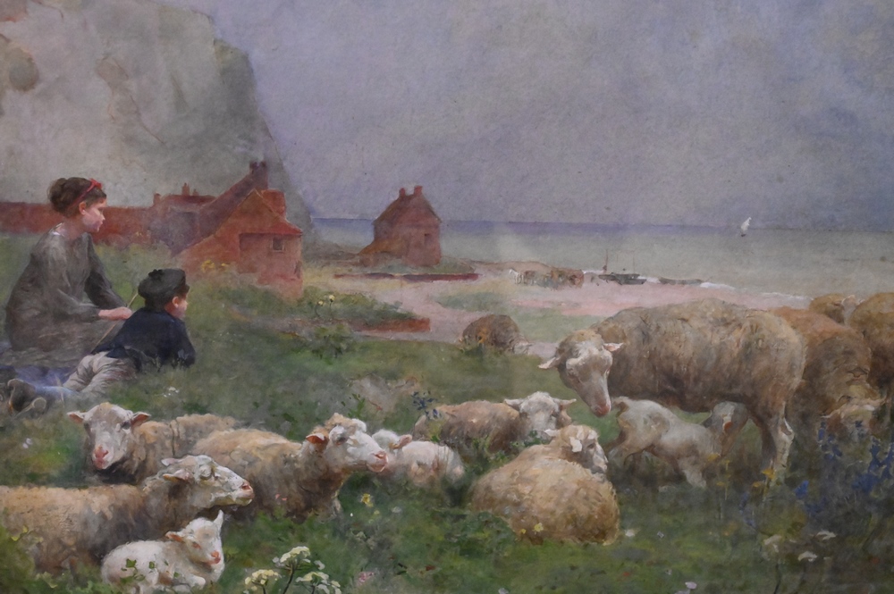 Luigi Chialiva (France, 1842 – 1914), watercolor, boy and girl with sheep on shoreline, signed lower right, 16 1/2″ x 21 1/2″.