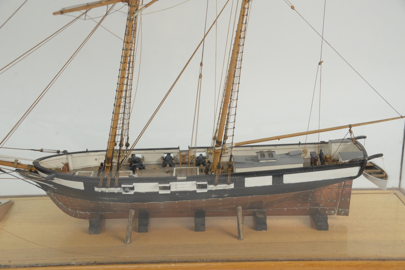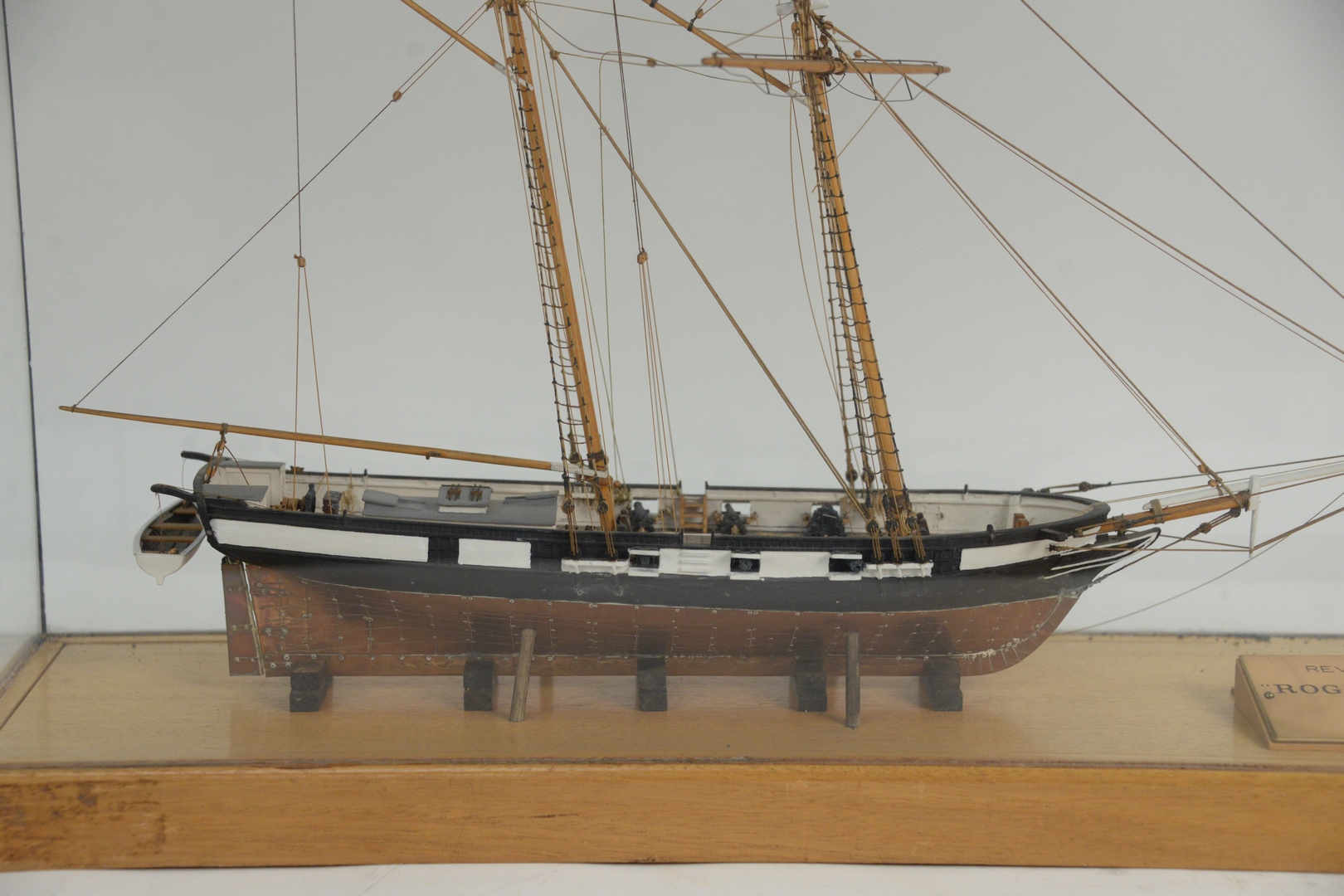 Roger B. Taney Wood and Copper Model Sailing Ship, in glass case, having wood body, with copper plated hull, original was built in 1833, 1/8 inch 1 foot scale, height 14 inches, width 19 1/2 inches, depth 3 1/2 inches.