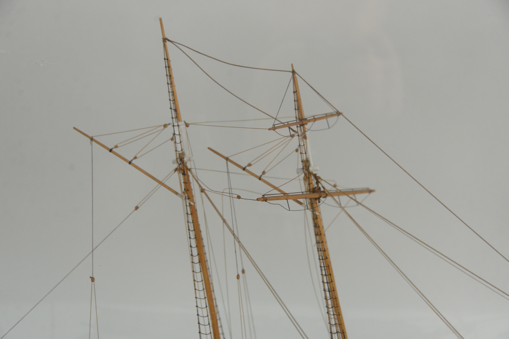 Lot 410: Roger B. Taney Wood and Copper Model Sailing Ship, in glass case, having wood body, with copper plated hull, original was built in 1833, 1/8 inch 1 foot scale, height 14 inches, width 19 1/2 inches, depth 3 1/2 inches.