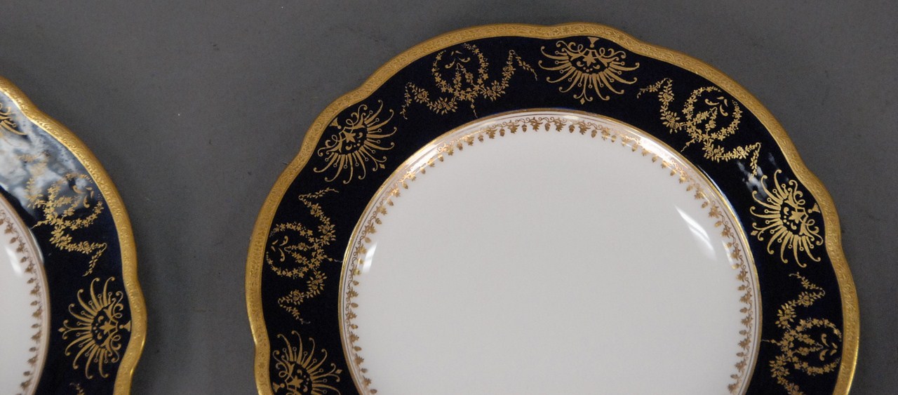 Set of eleven Coalport service plates with cobalt borders with raised gold. dia. 10 1/4in.