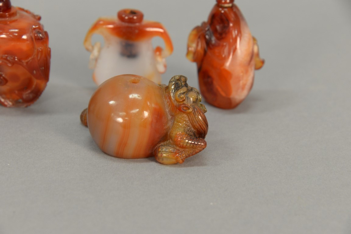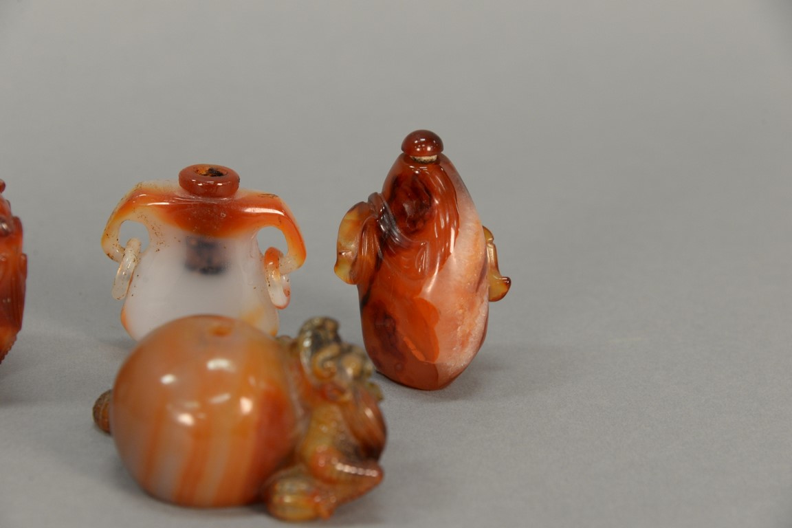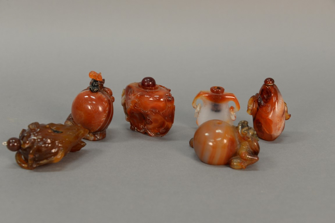 Lot 410: Six carved agate and hardstone snuff bottles, three in the form of a gourd or fruit, one with carved dragon, and one with carved foo…