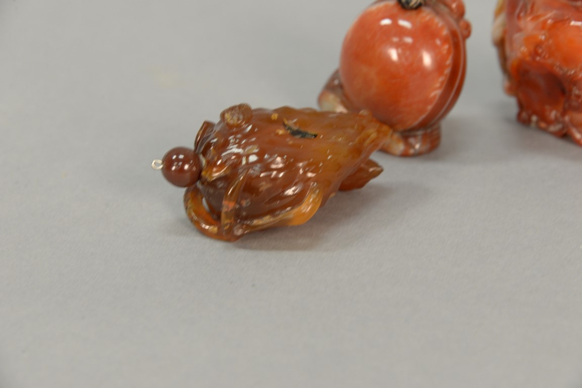 Six carved agate and hardstone snuff bottles, three in the form of a gourd or fruit, one with carved dragon, and one with carved foo lion. ht. 1 1/2in. to 2 3/4in.