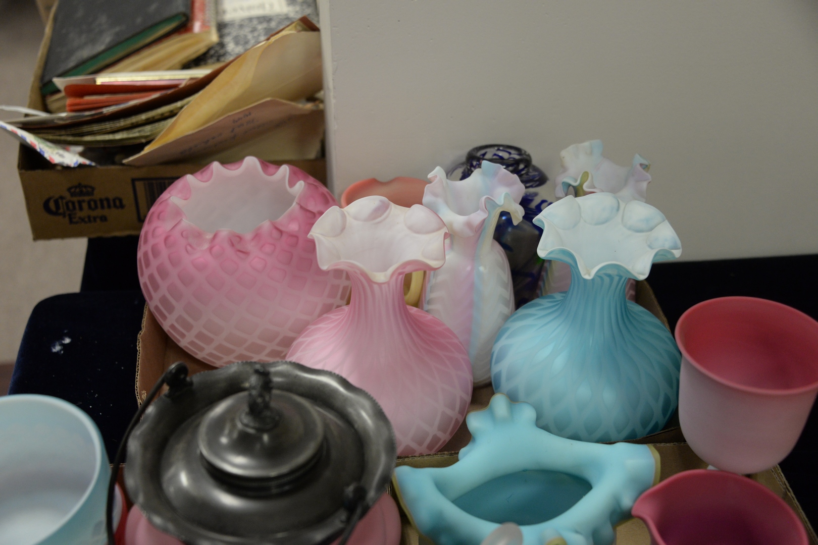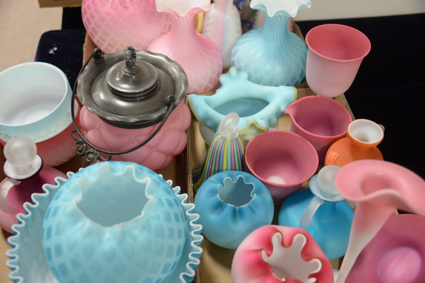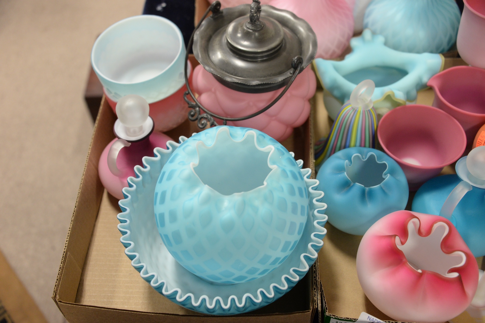 Lot 410: Three Box Lots of Satin Glass, to include a Burmese cup and creamer, a pink saucer, two decanters, a pink candle stick, a quilt pattern, pink biscuit jar, pair of multicolored quilt pattern vases, pair of pink and blue vases, along with several other pieces, height of candlestick 9 inches. Provenance: Estate of James Wadhams