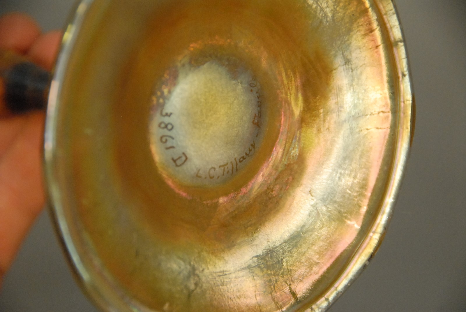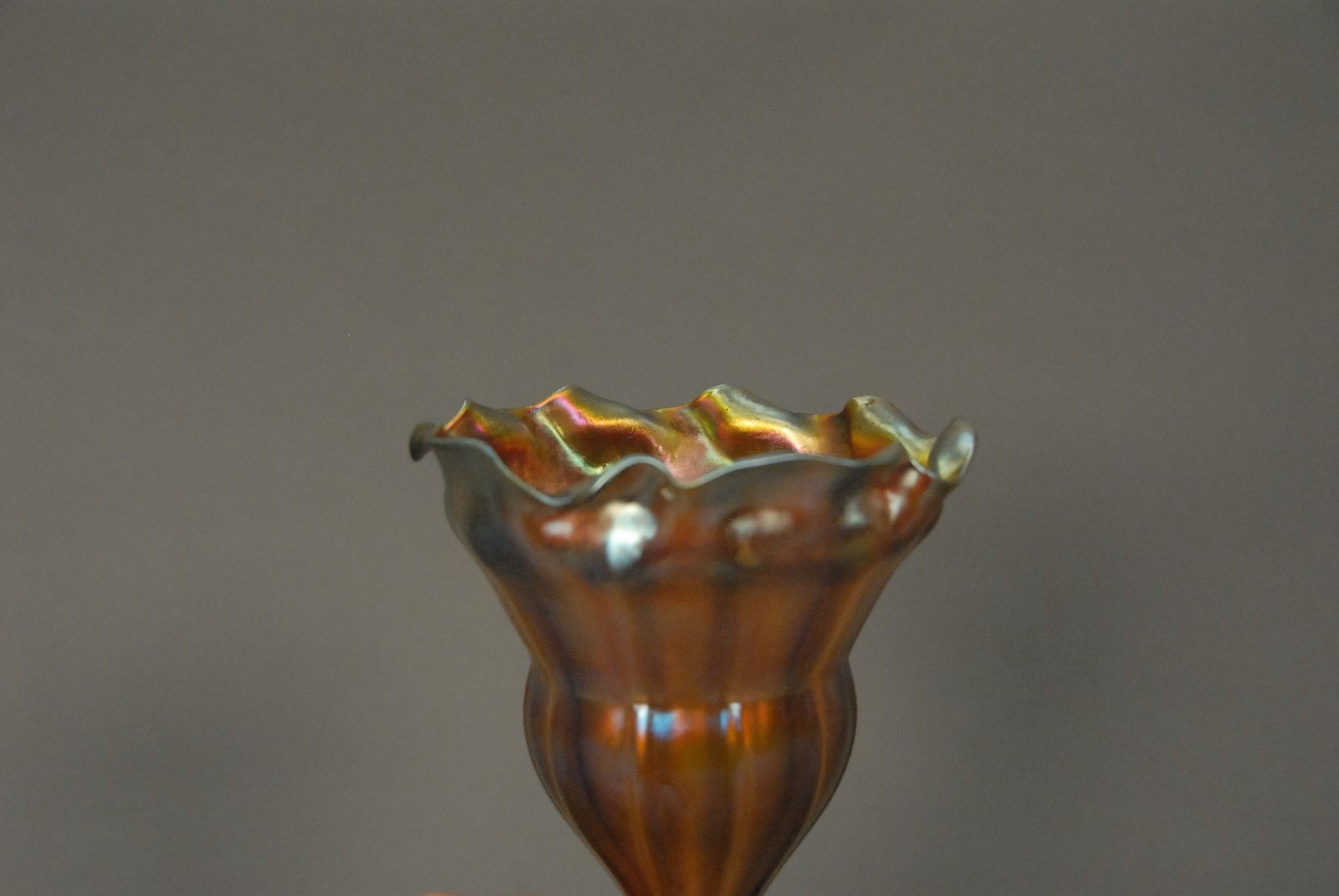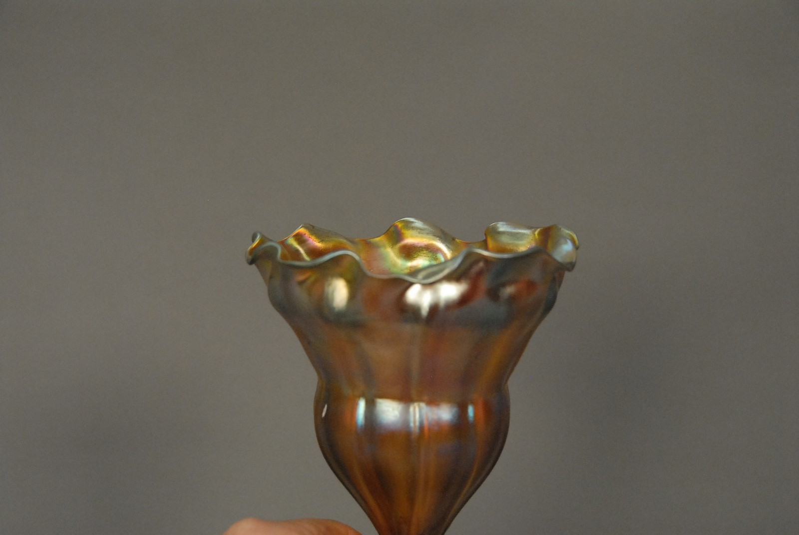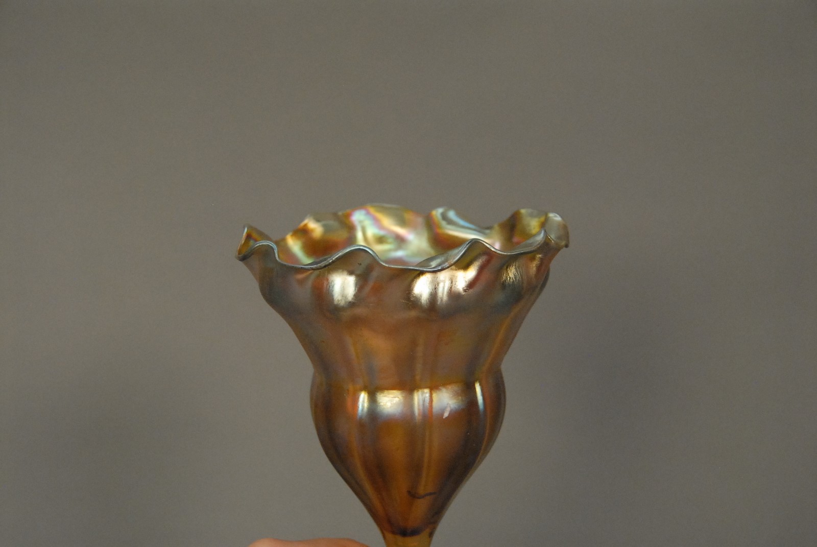 Lot 410: Tiffany gold iridescent Favrile glass flower form vase set on plain stem in gold transparent glass raised on a circular foot, inscribed on bottom L .C. Tiffany Favrile 3861D crack at bottom of stem. ht. 13 1/4 in.