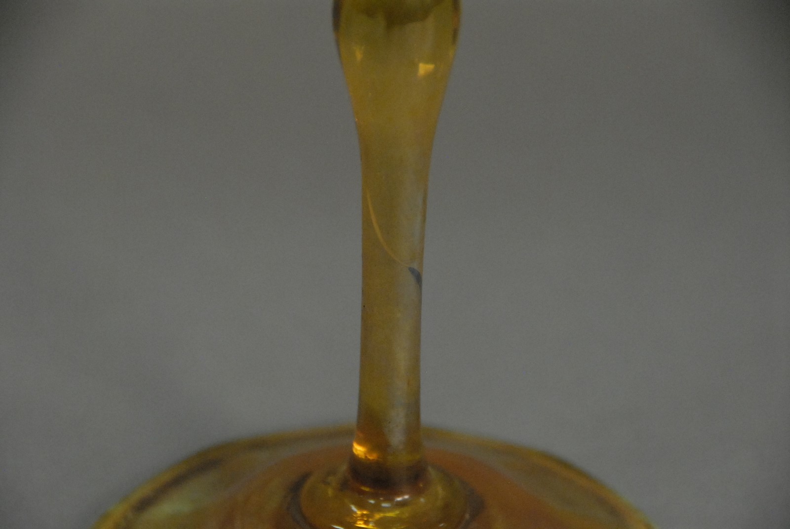 Tiffany gold iridescent Favrile glass flower form vase set on plain stem in gold transparent glass raised on a circular foot, inscribed on bottom L .C. Tiffany Favrile 3861D crack at bottom of stem. ht. 13 1/4 in.
