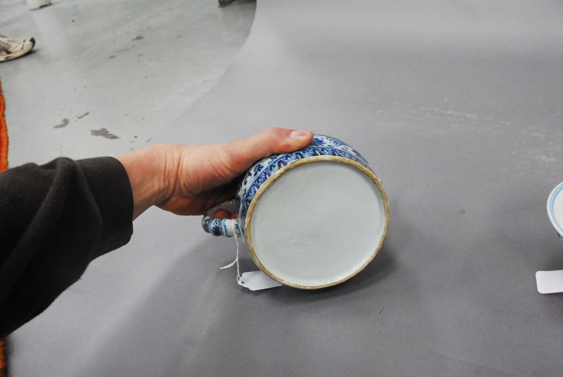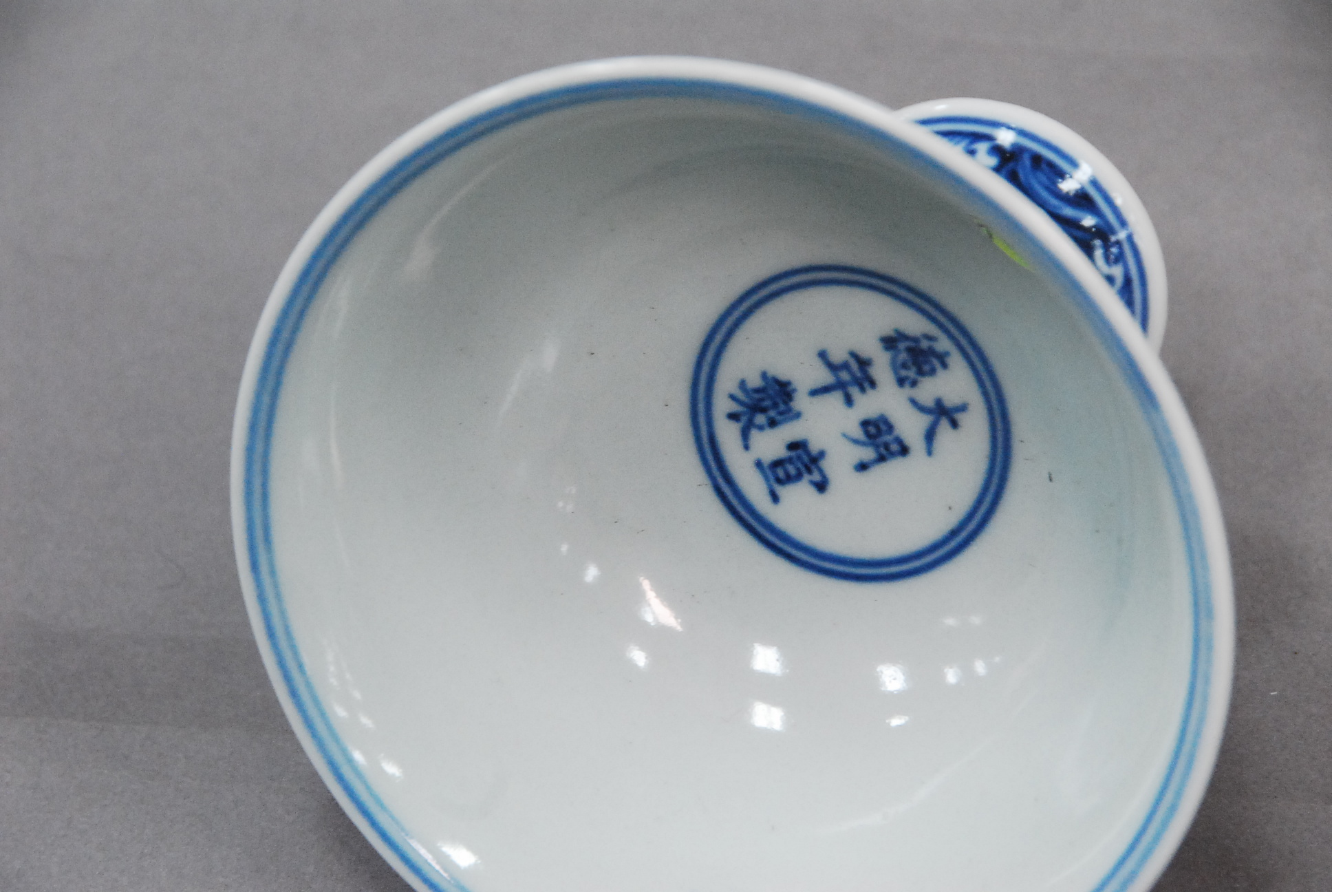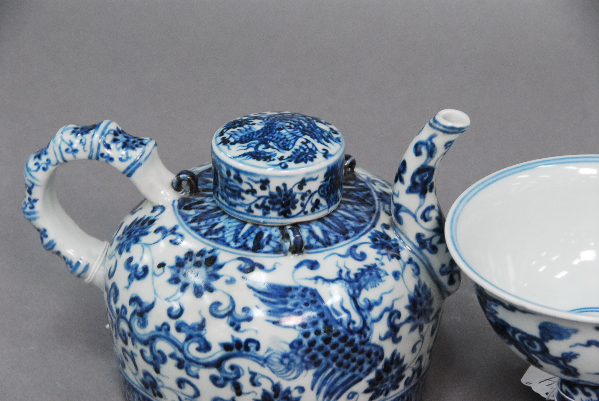 Lot 410: Two blue and white pieces stem foo elephant cup with flaming clouds and a blue and white phoenix bird teapot, teapot: ht. 5, stem…