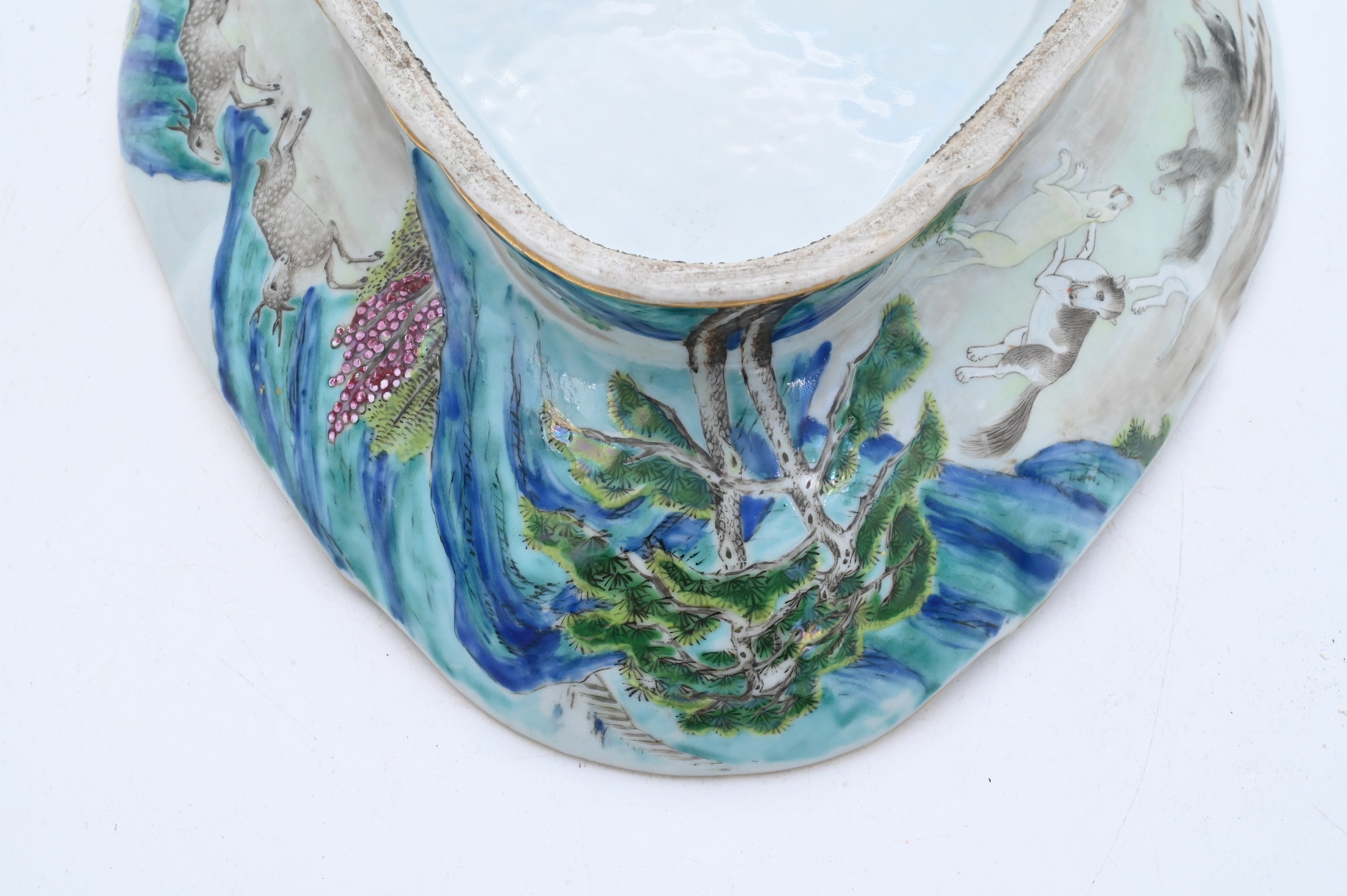 Decorated in the famille rose palette with floral sprays and butterflies to the interior within a colorful border, the exterior with a unique continuous landscape of turquoise mountains, deer, and other animals