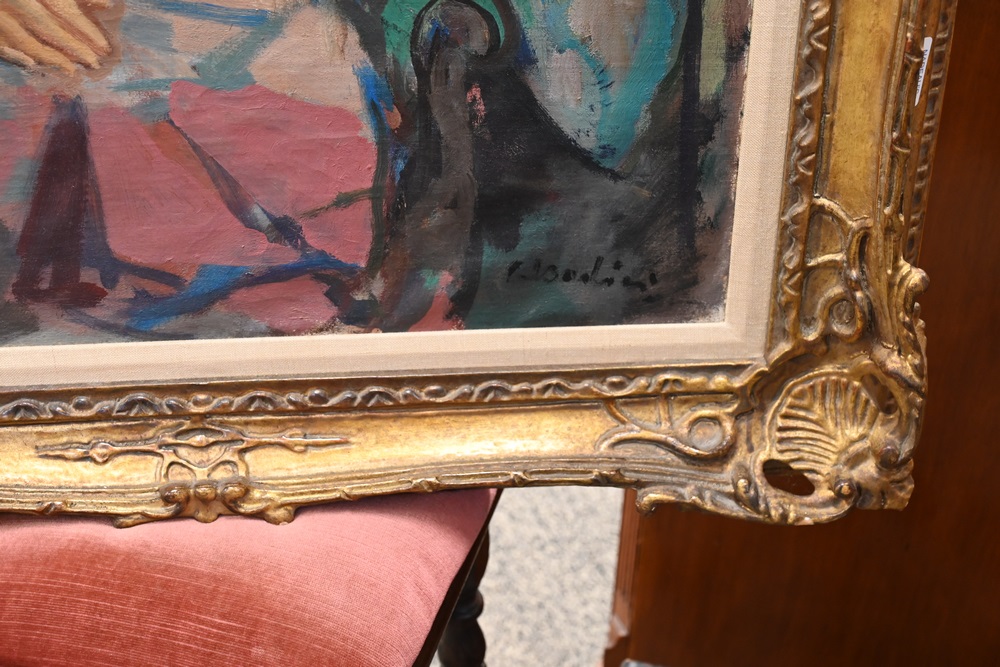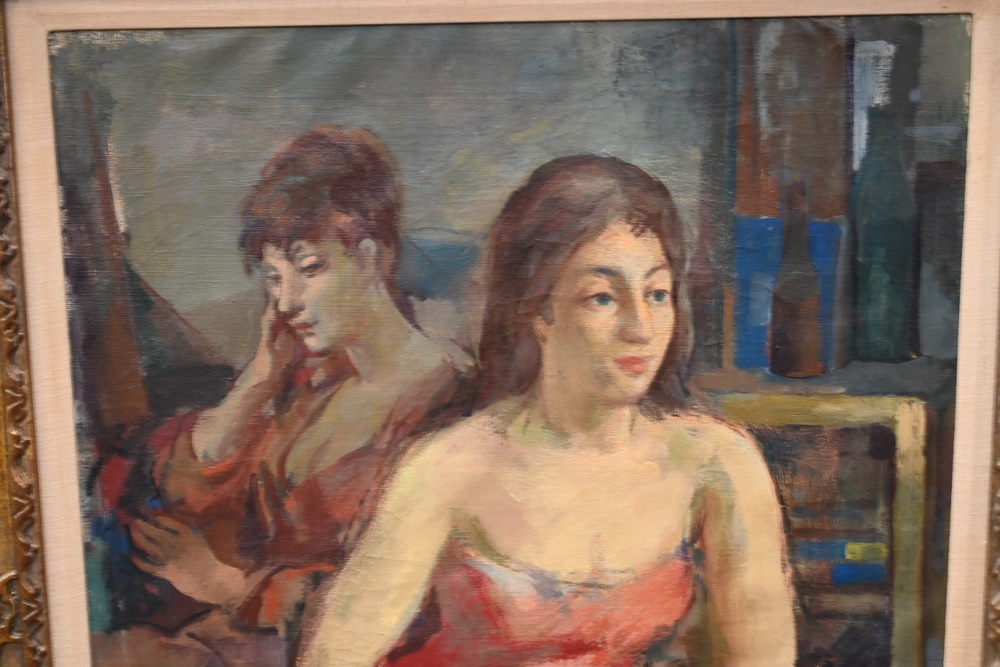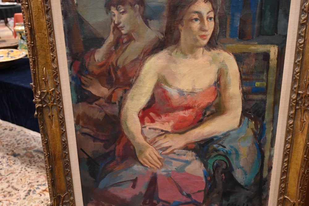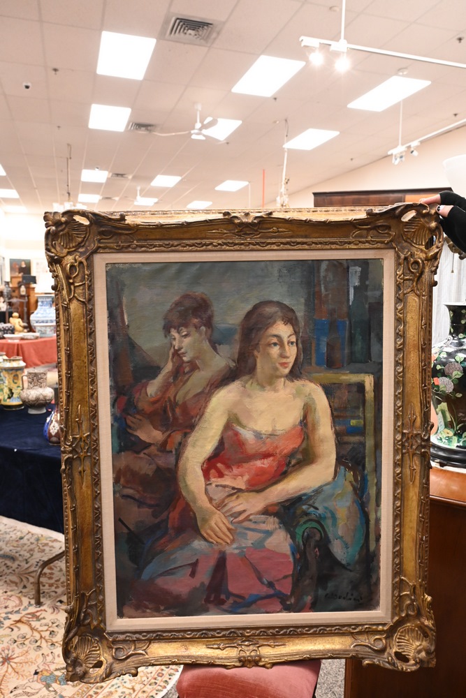 Lot 411: Contardo Barbieri Italian, 1900 – 1966 depicts two seated women in red oil on canvas signed lower right and verso C. Barbieri 31 1/2 x 23 1/2 inches