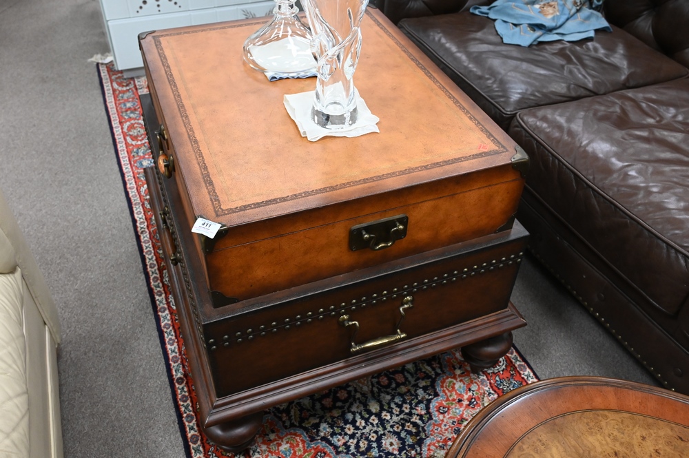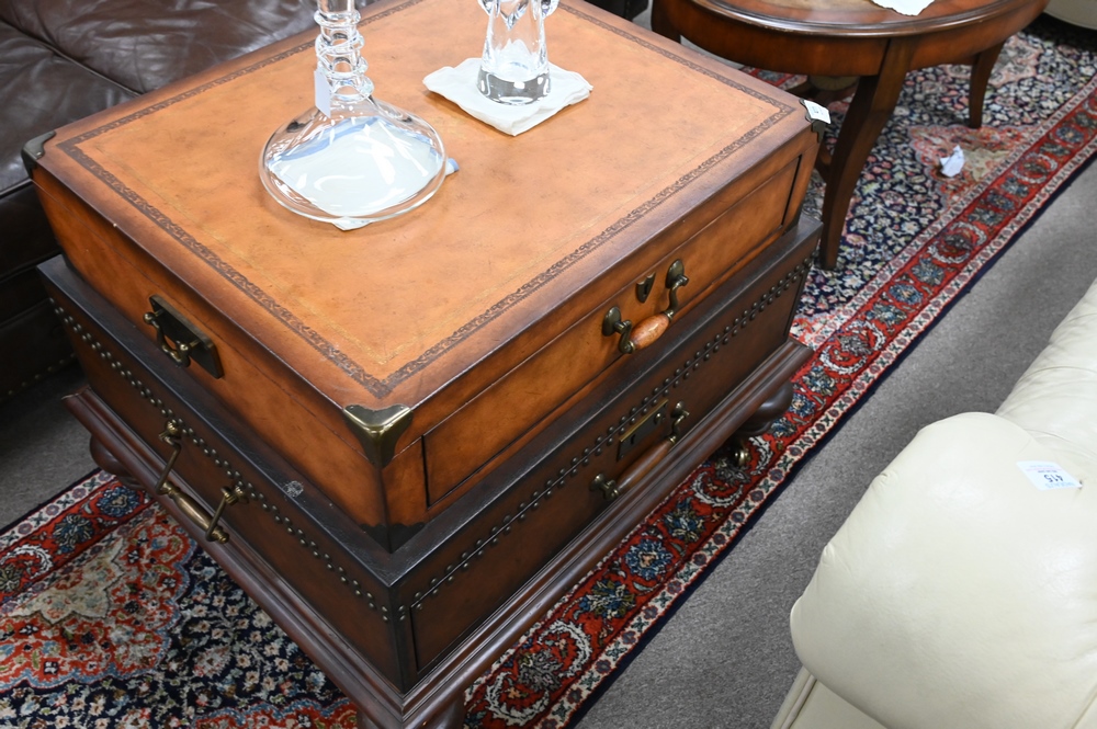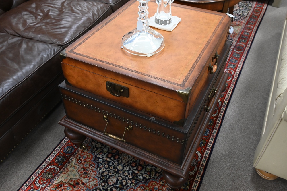 Lot 411: Contemporary Coffee Table, in the style of two faux suitcases with two drawers, height 24.5 inches, top 22″ x 27″.