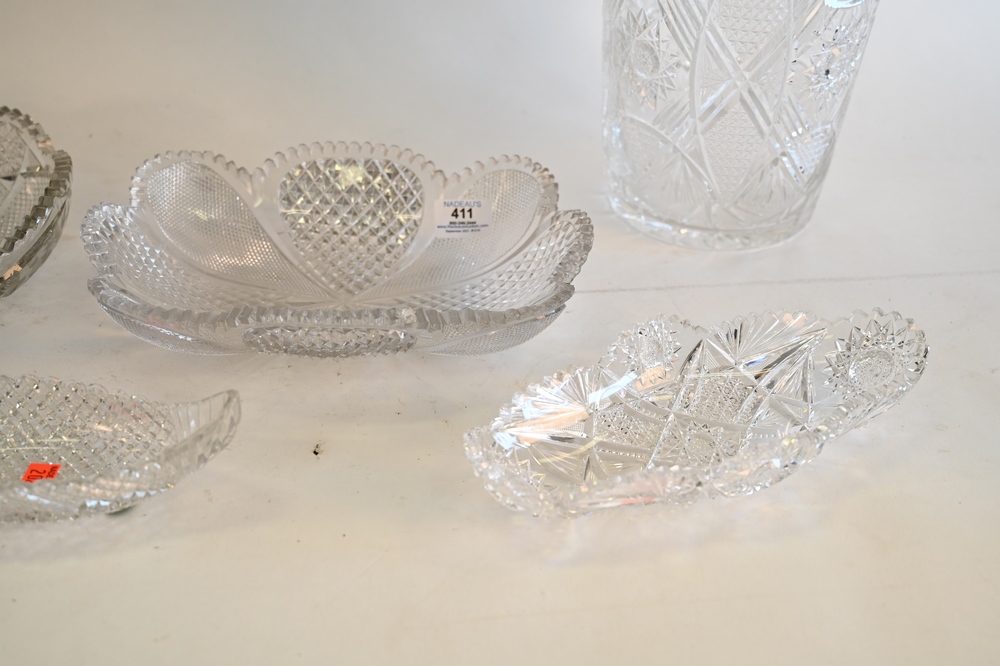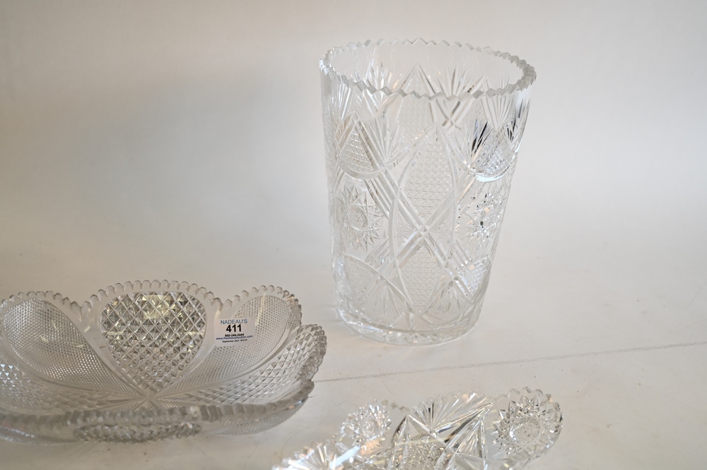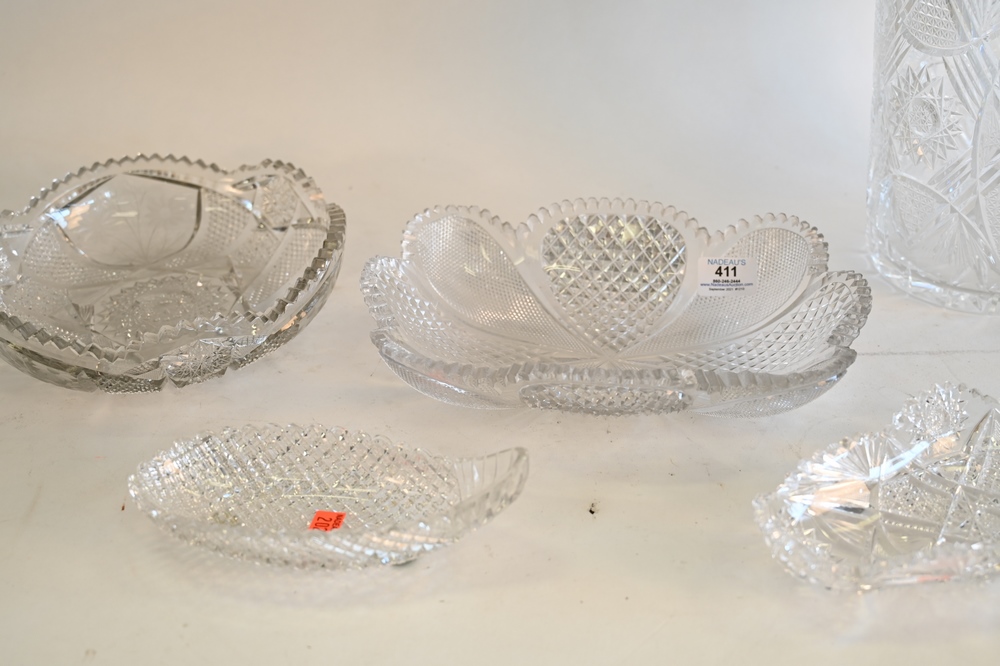 Lot 411: Five Piece Lot of Cut Glass, to include a large vase, an ice cream bowl, a dish having sunflower motif, along with two dishes, height of vase 10 1/2 inches. Provenance: Waterfront Estate, Stamford, CT.