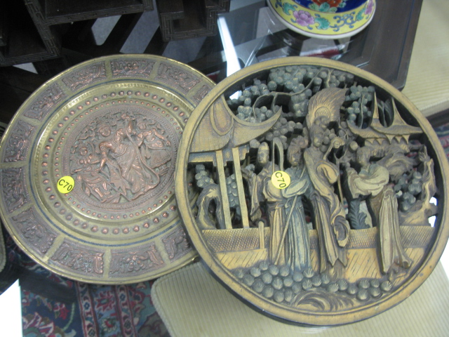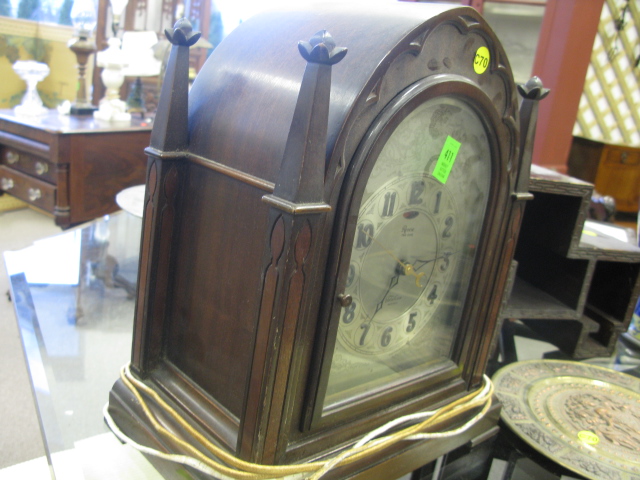 Group lot to include gothic style clock, Chinese shelf and Chinese wall hanging, brass plaque and covered jar with drilled holes