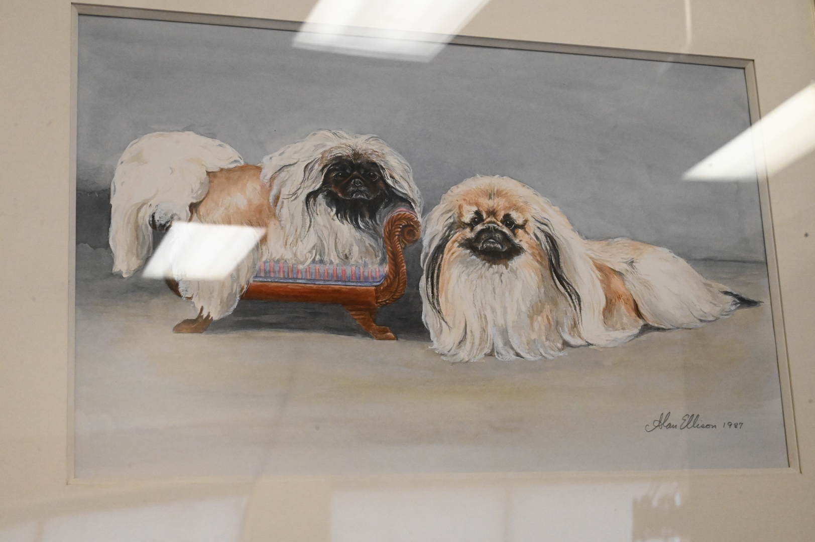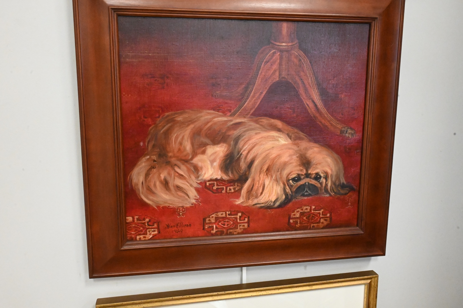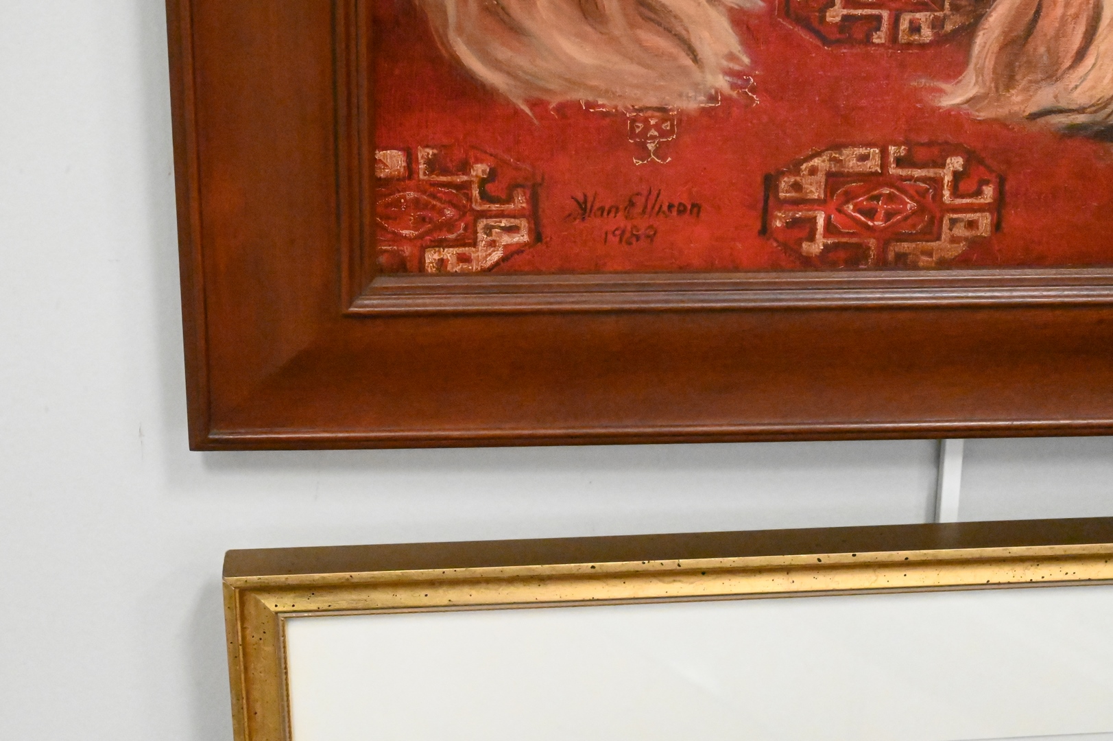 Group of Four Alan Ellison 20th Century Pieces, to include “Puck and Simba” 1987, 11 1/2″ x 18 1/2″, “Tinkerbelle on Red Carpet” 1989, oil on canvas, “Simba” 1990, watercolor 11″ x 141/2″, “Puck, Simba and Tinkerbelle” 1990, watercolor, 14″ x 12 1/2″, all signed and dated.