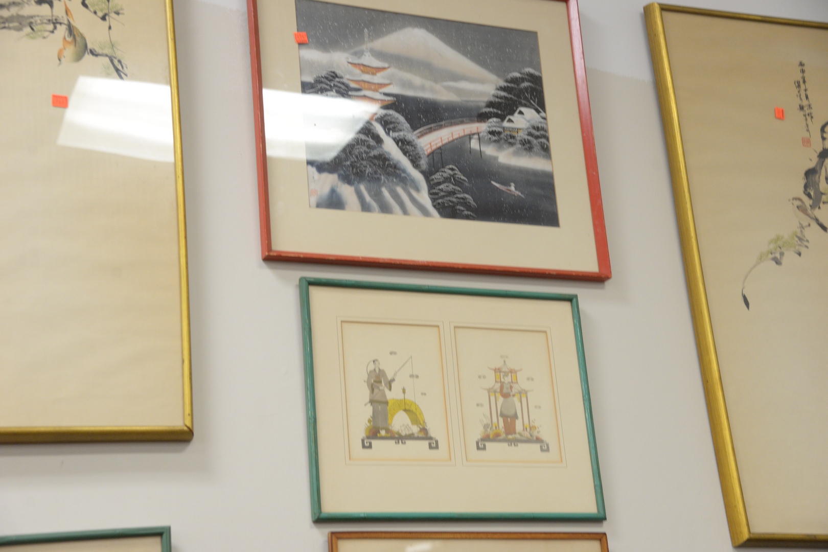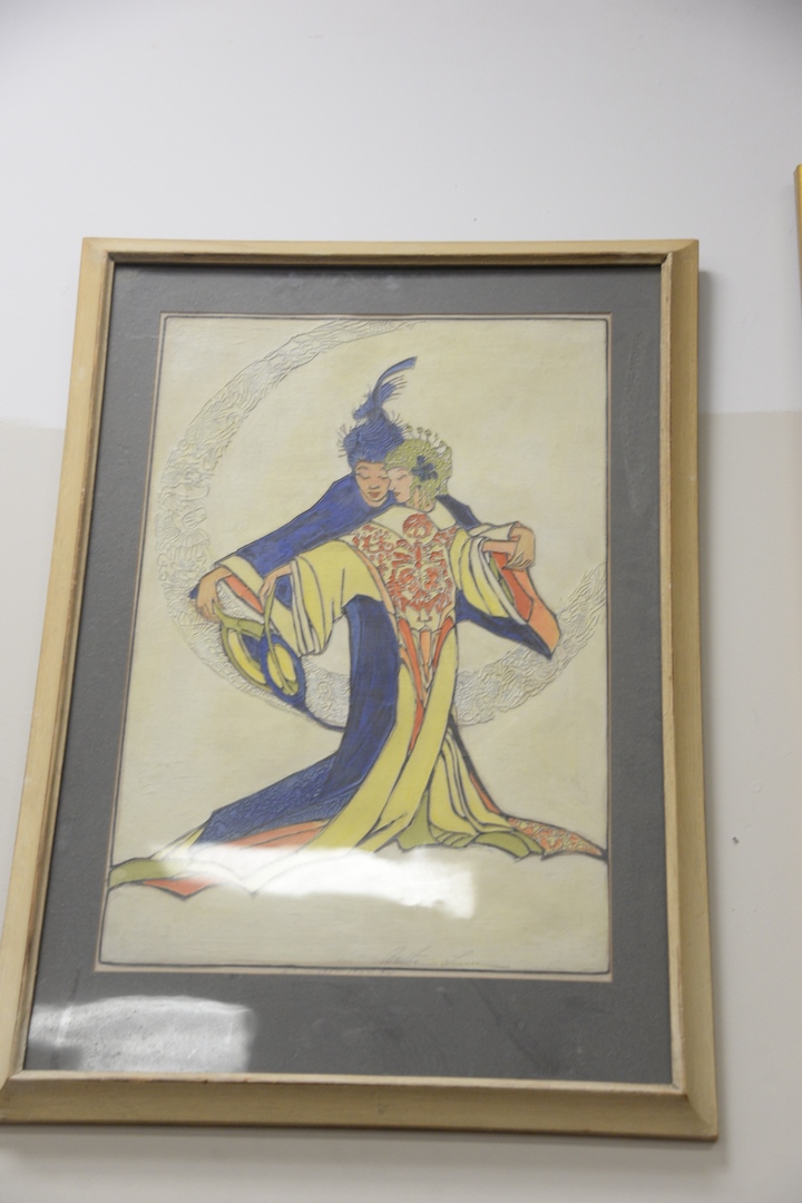 to include pair of woodblock prints pair of watercolor on paper of birds oil on silk, pagoda winter scene along with ten woodcut of two figures dancing, pencil signed illegibly