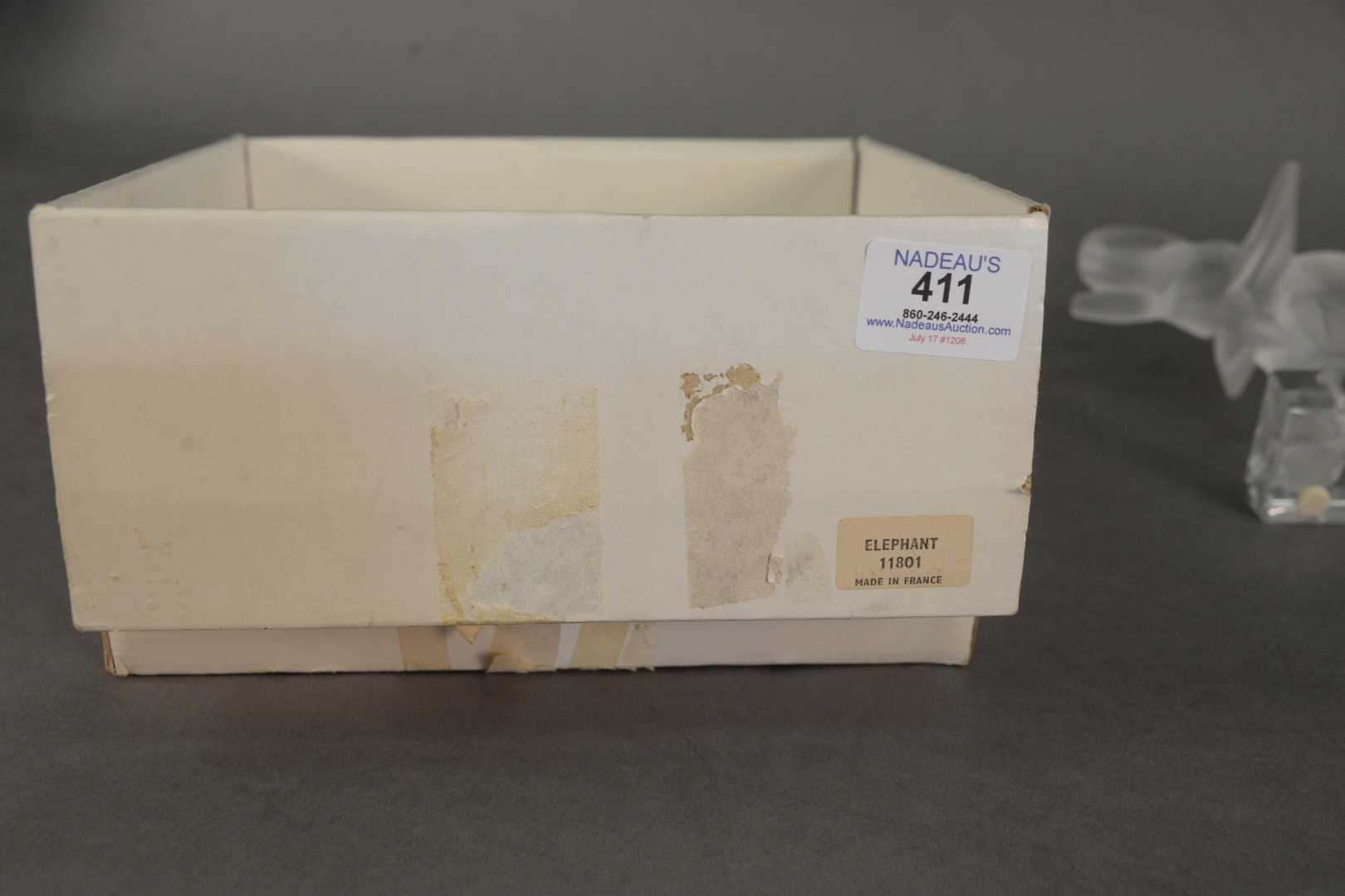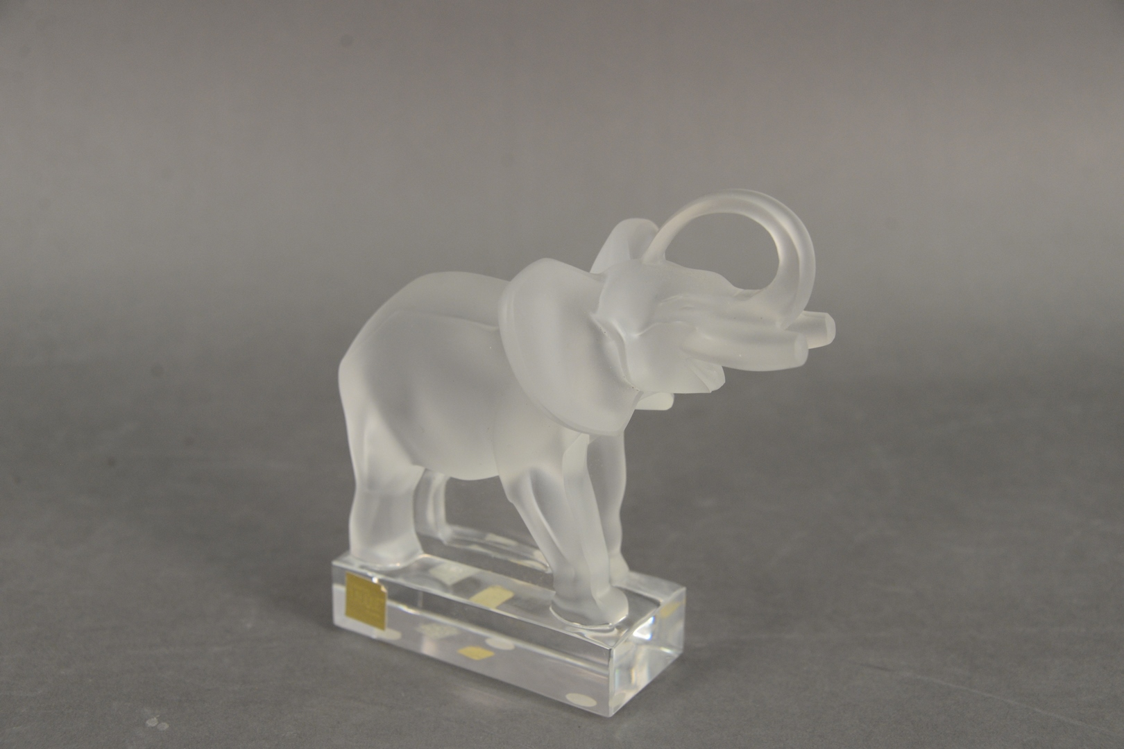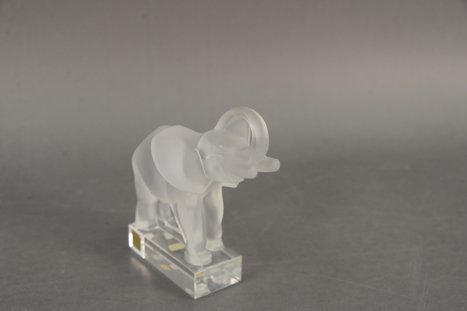 Lot 411: Lalique Frosted Glass Elephant Paperweight, signed to the underside, in original fitted box, height 6 1/4 inches.