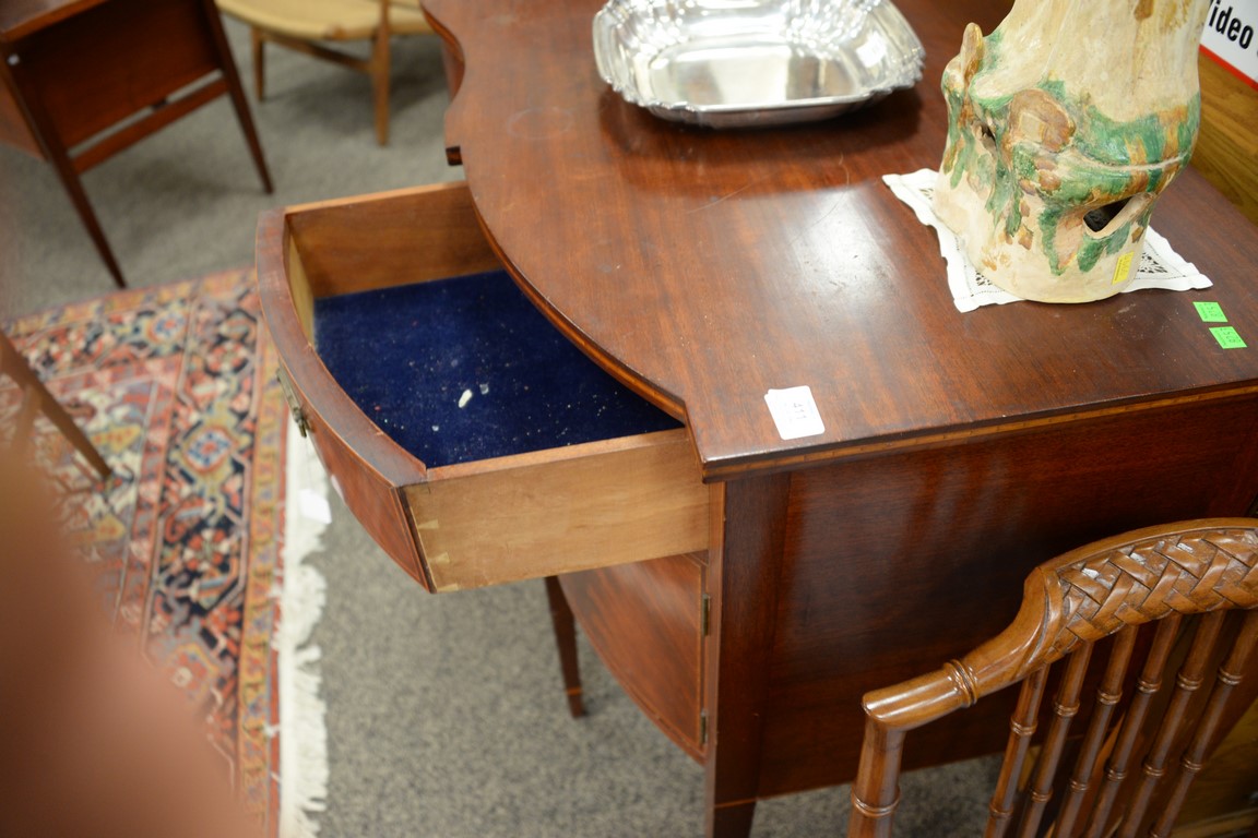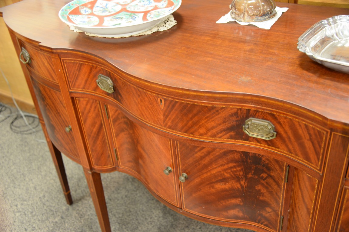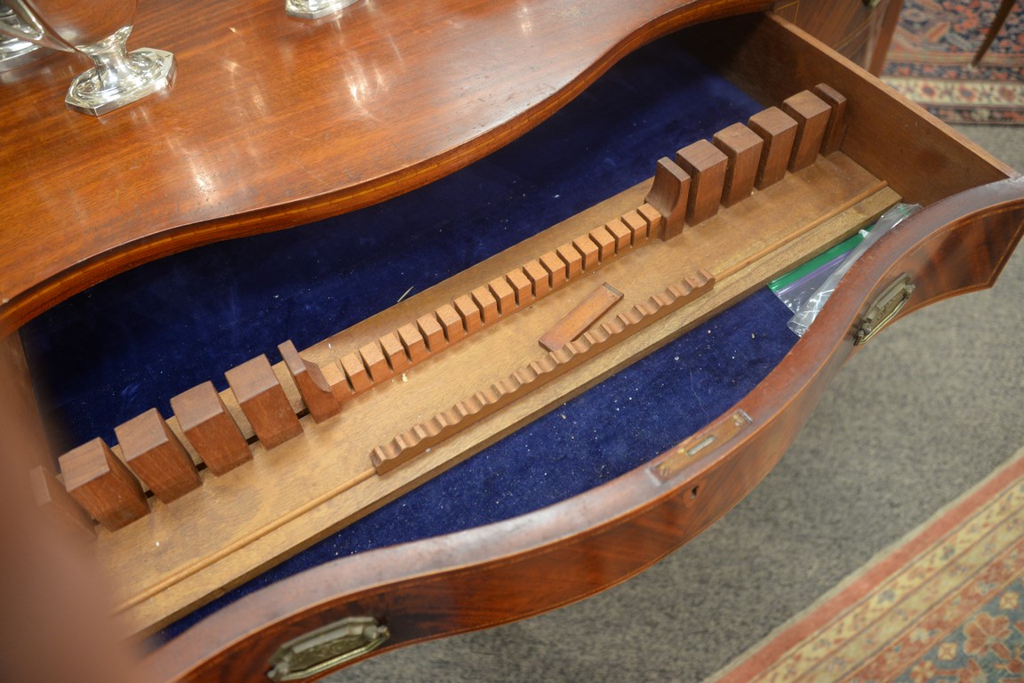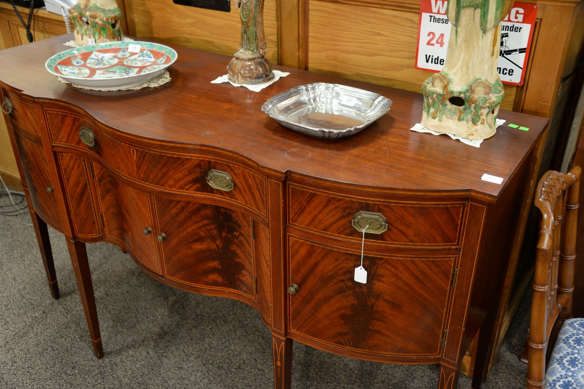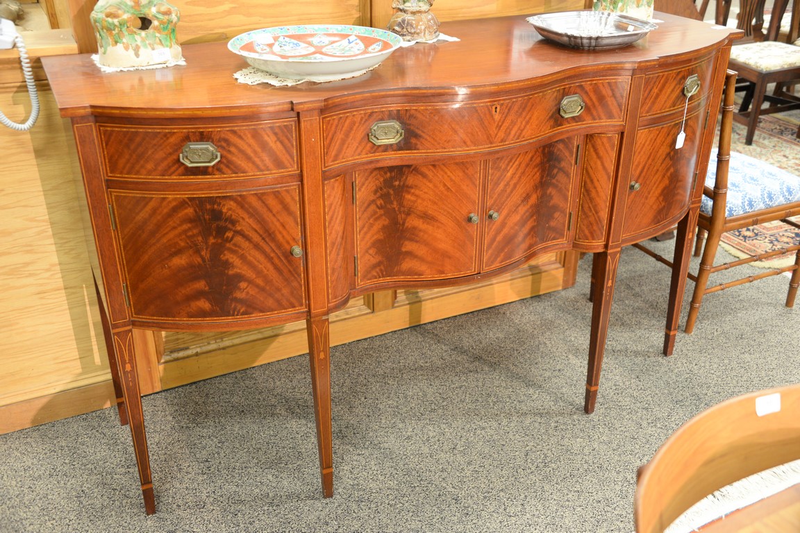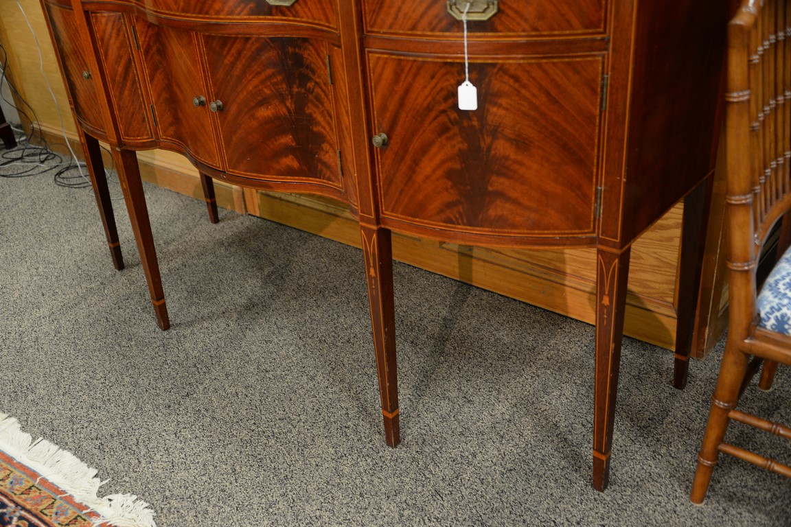 Lot 411: Margolis mahogany sideboard having serpentine top over conforming case with three drawers over four doors all set on square tapered …