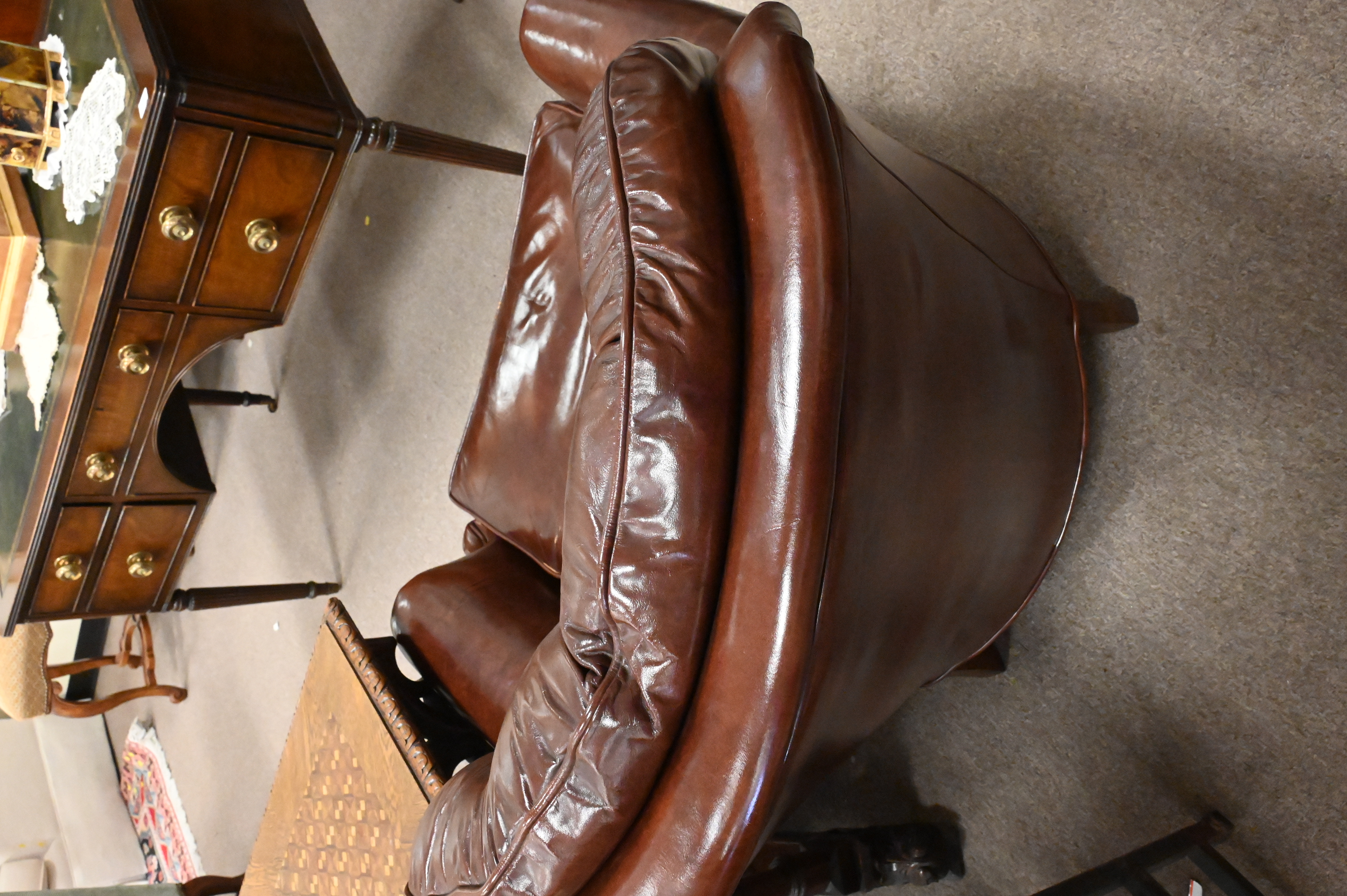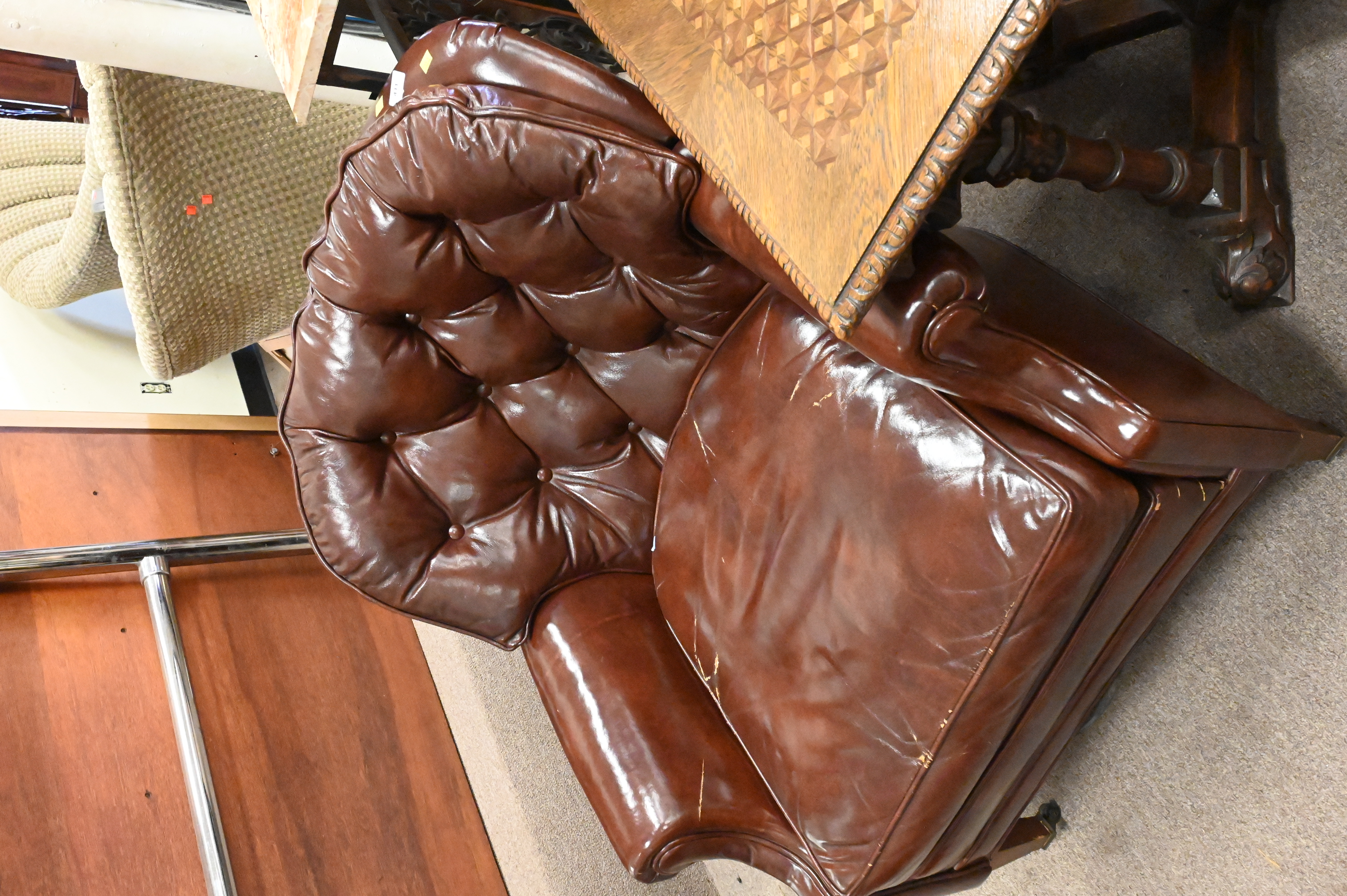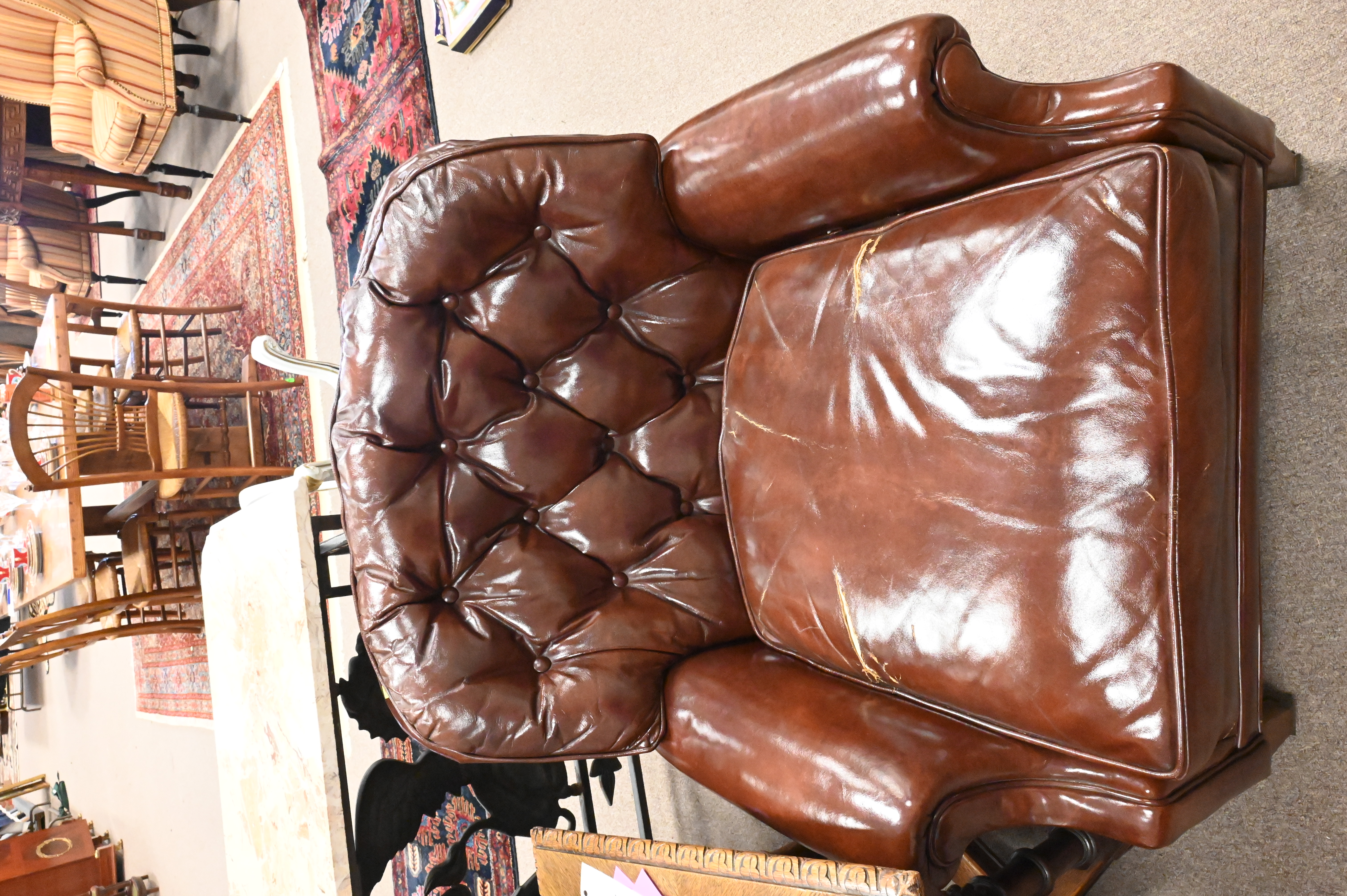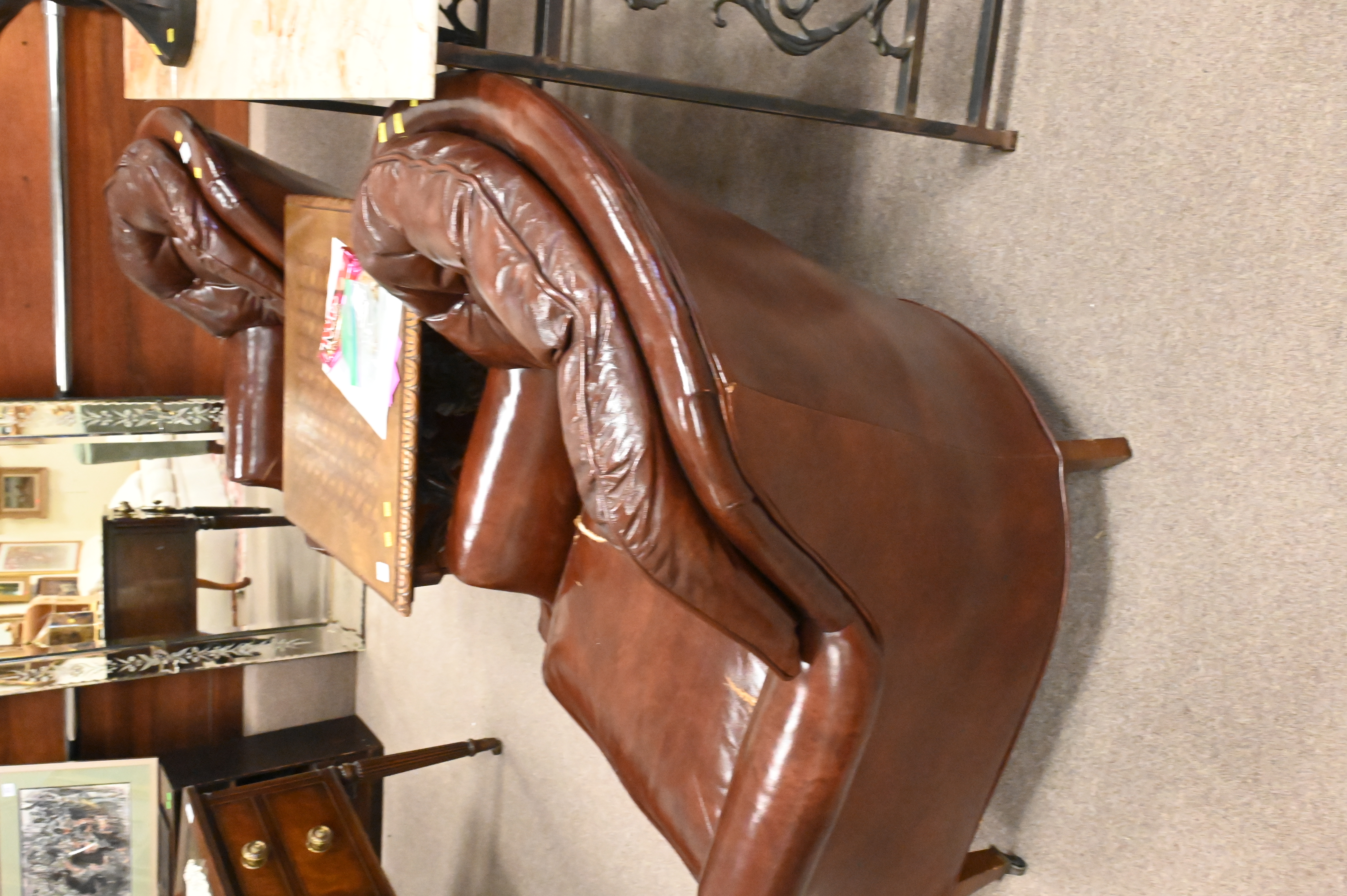 Pair of Bloomingdale Leather Easy Chairs, having cracks in leather seats, height 31 inches, width 31 inches.