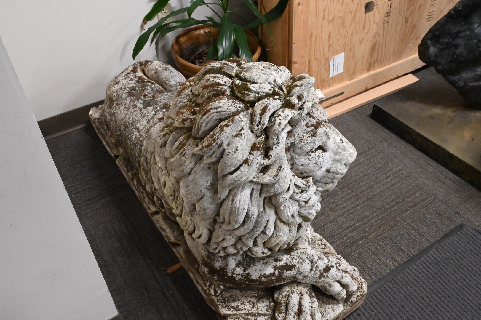 Pair of Recumbent Lion Outdoor Cement Figures, height 30 inches, length 52 inches.