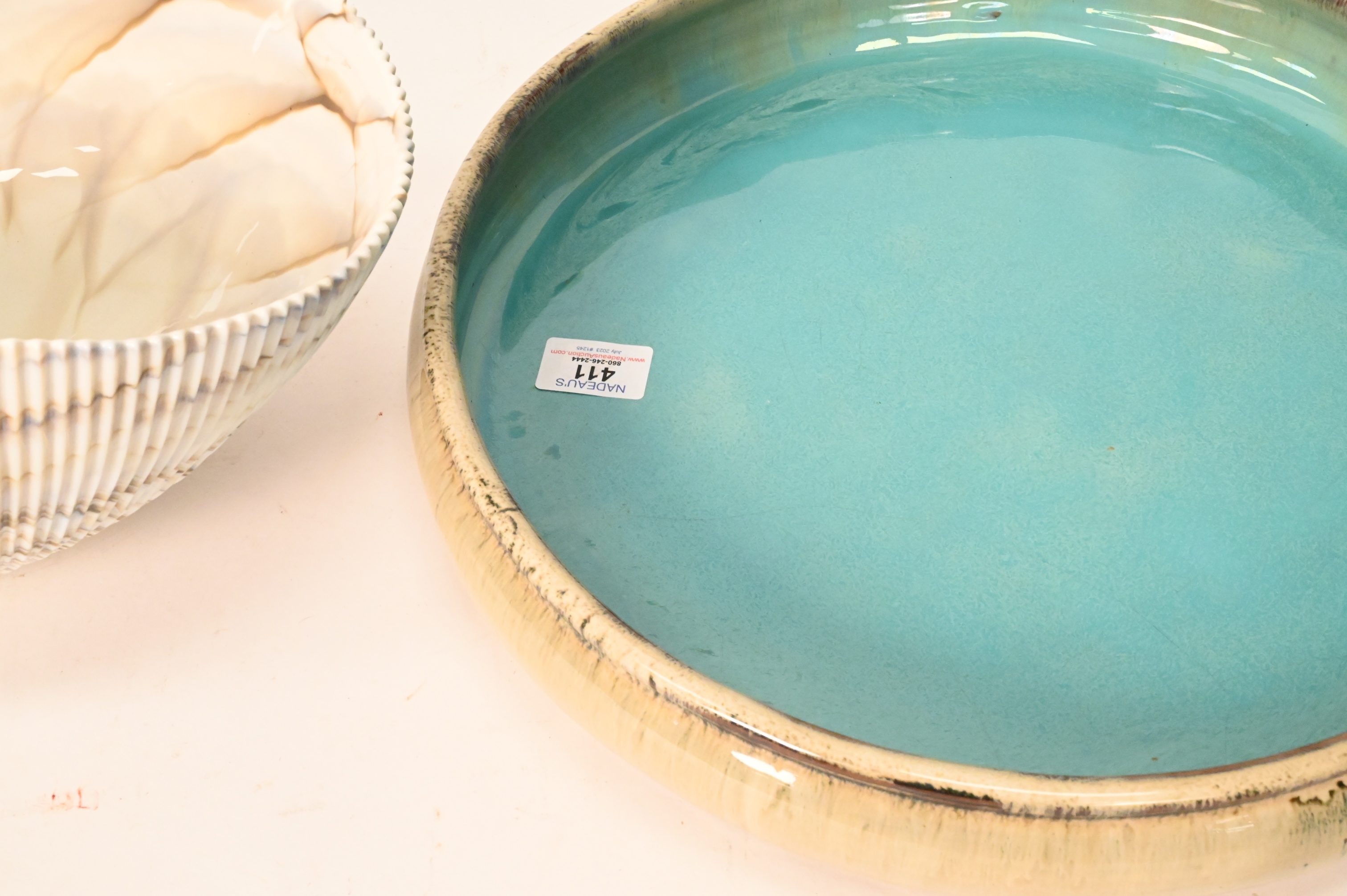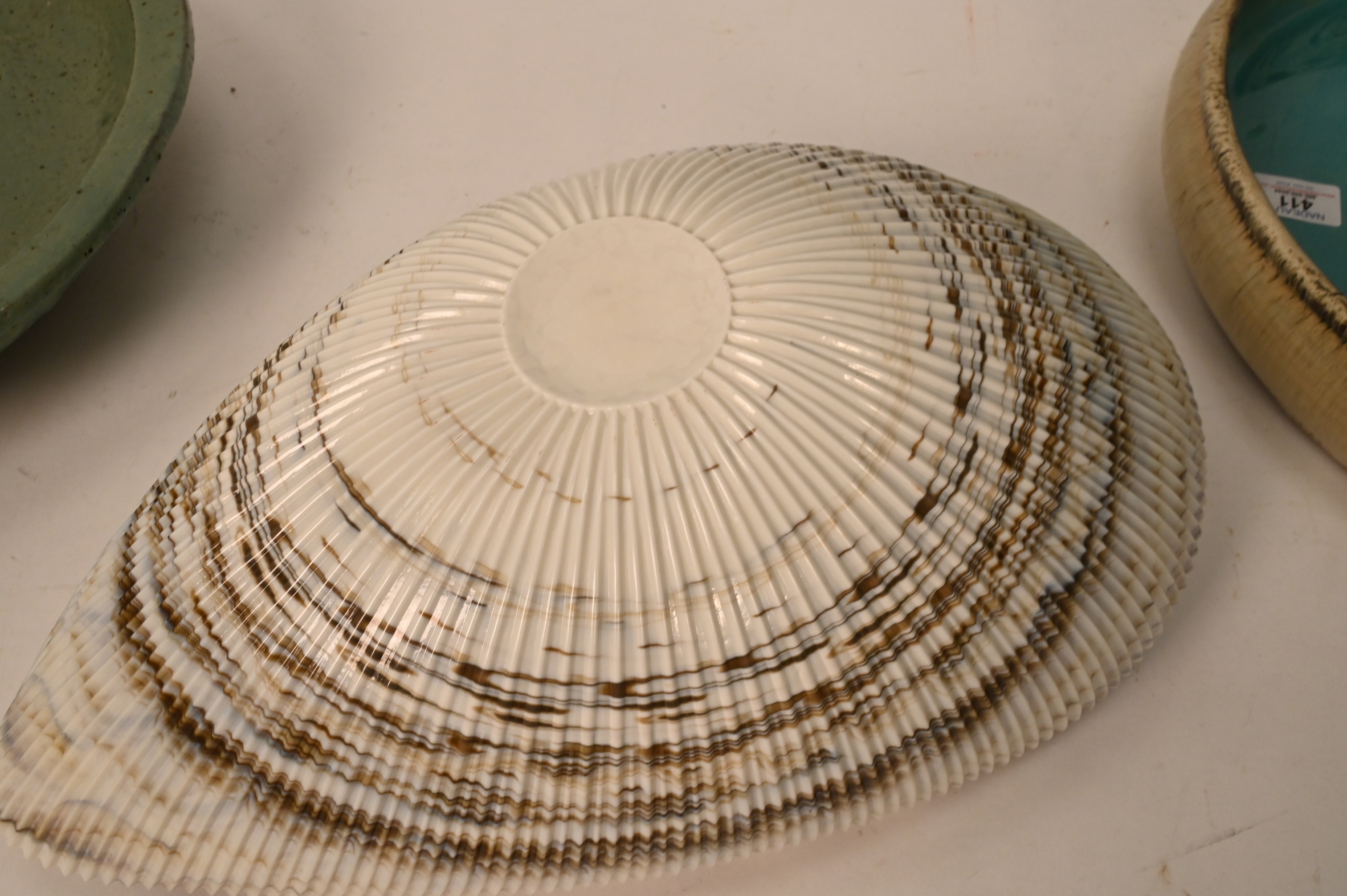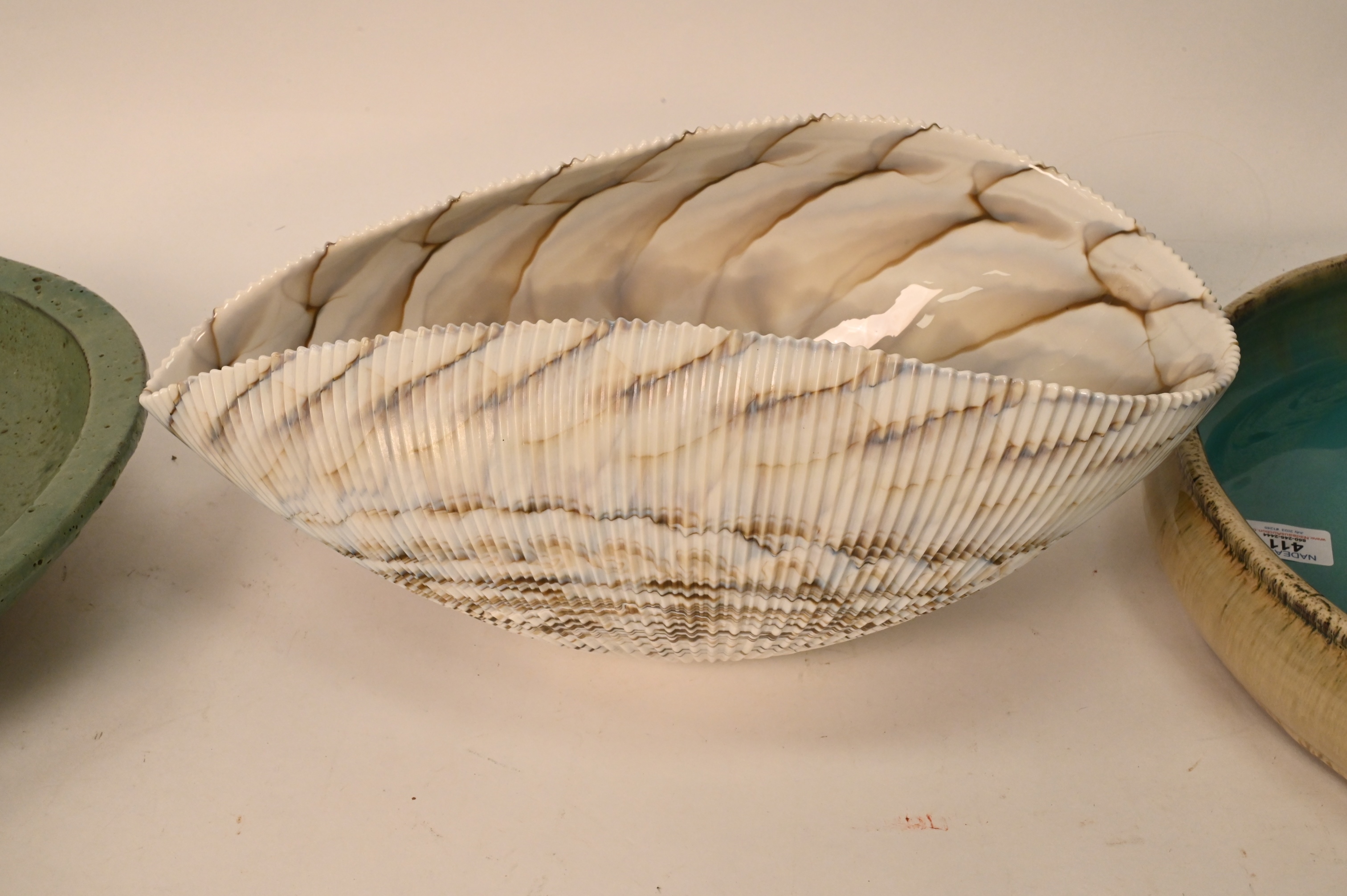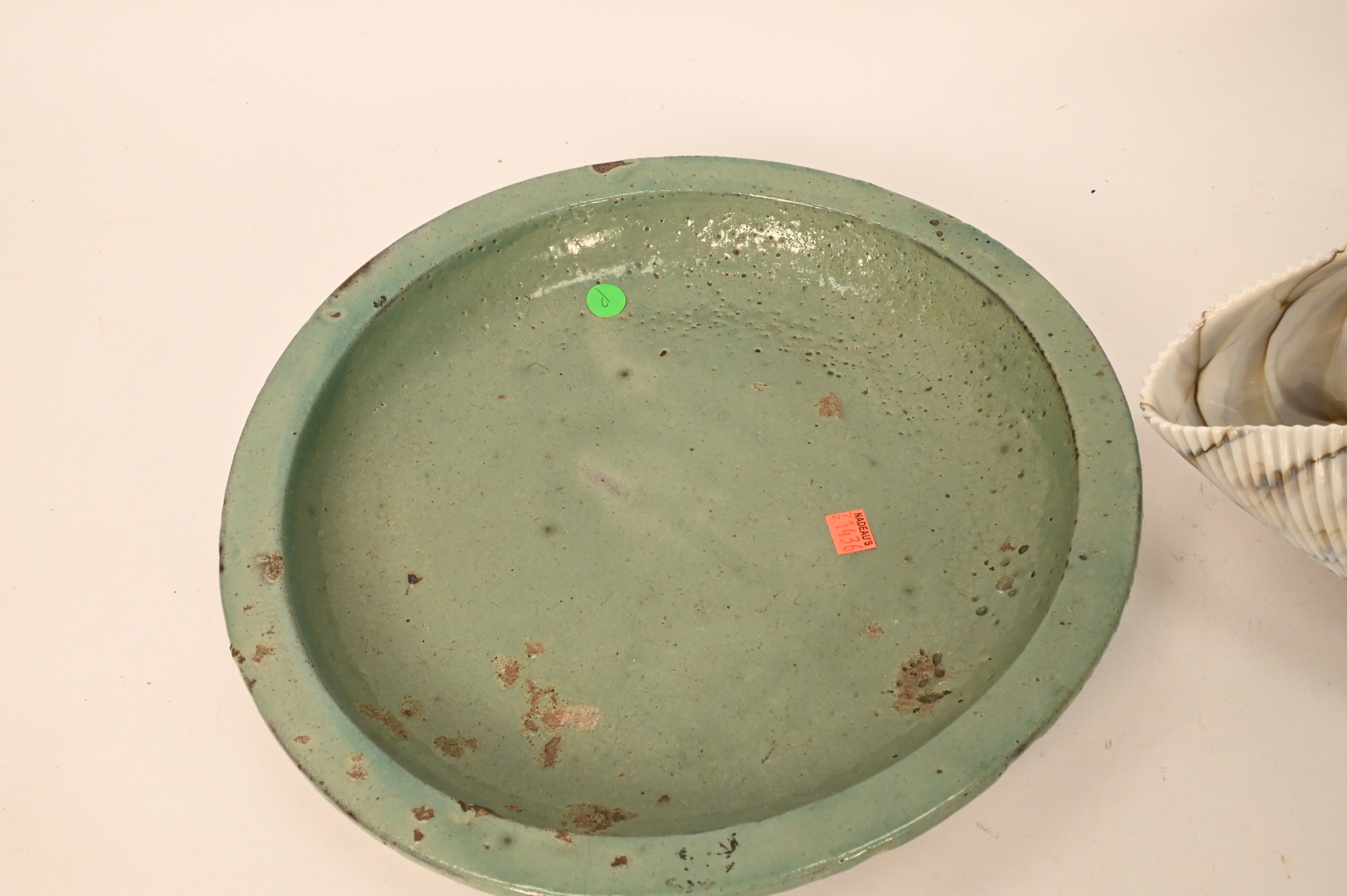 Shell Bowl and Two Japanese Pieces, to include Large Murano Glass Shell Bowl, length 12 1/2 inches, second bowl is, height 7 inches, length 17 inches, along with Two Japanese Pieces, to include a Japanese light green plate, 19th century, off irregular form, having three feet, diameter 14 inches, Provenance Naga Antiques, LTD. New York, along with a Japanese Nagano-Ware Flower arranging bowl, 19th century, inside blue-green translucent celadon glaze, diameter 15 1/2 inches, Provenance Naga Antiques, LTD, New York, 10/09/85