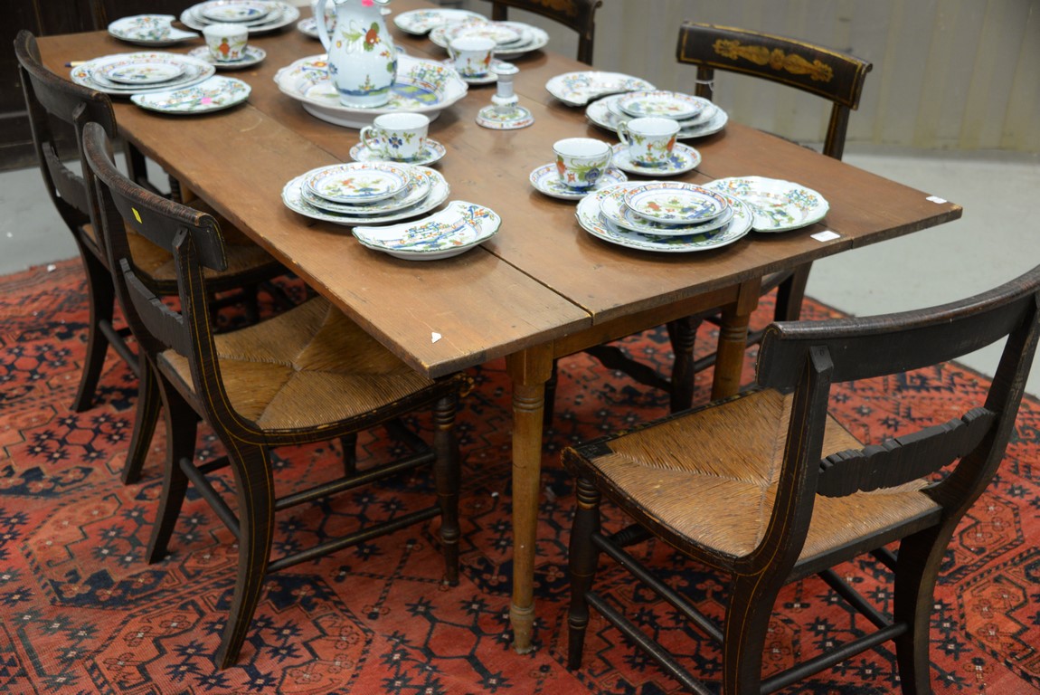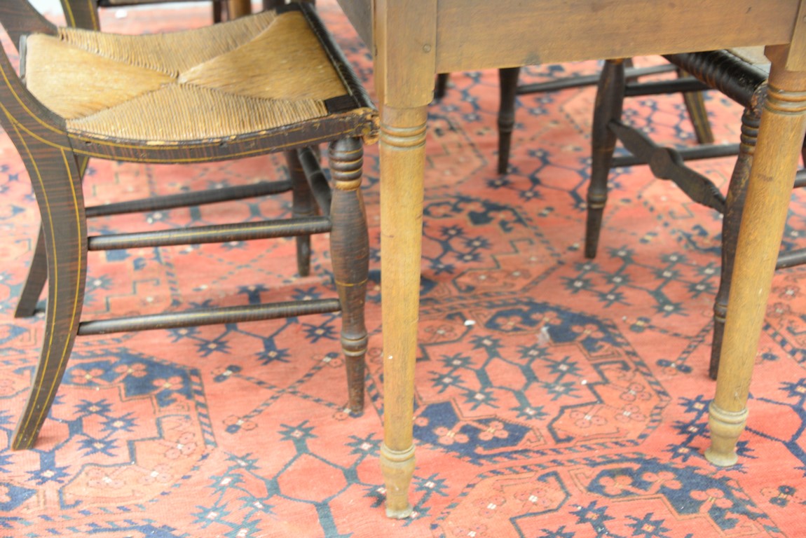 Lot 411: Sheraton style harvest drop leaf table. ht. 28 3/4 in. top closed: 19 1/4 x 70 top open: 39 1/4 x 70