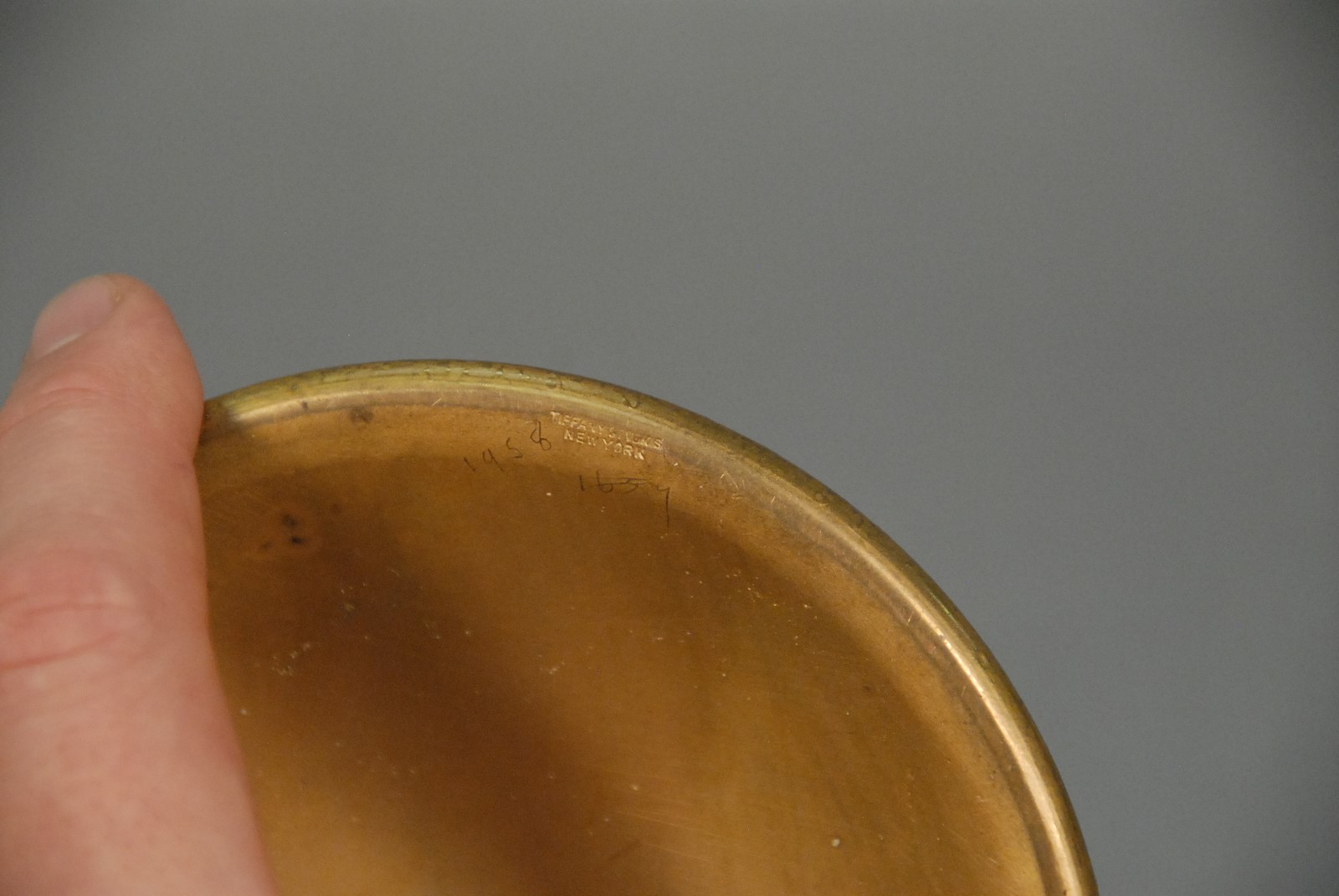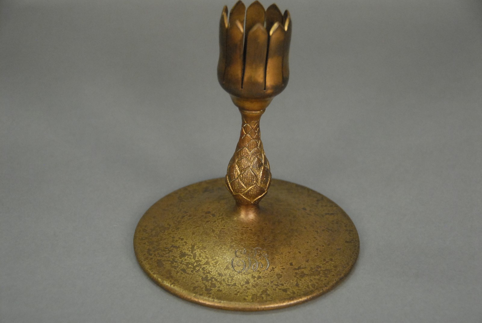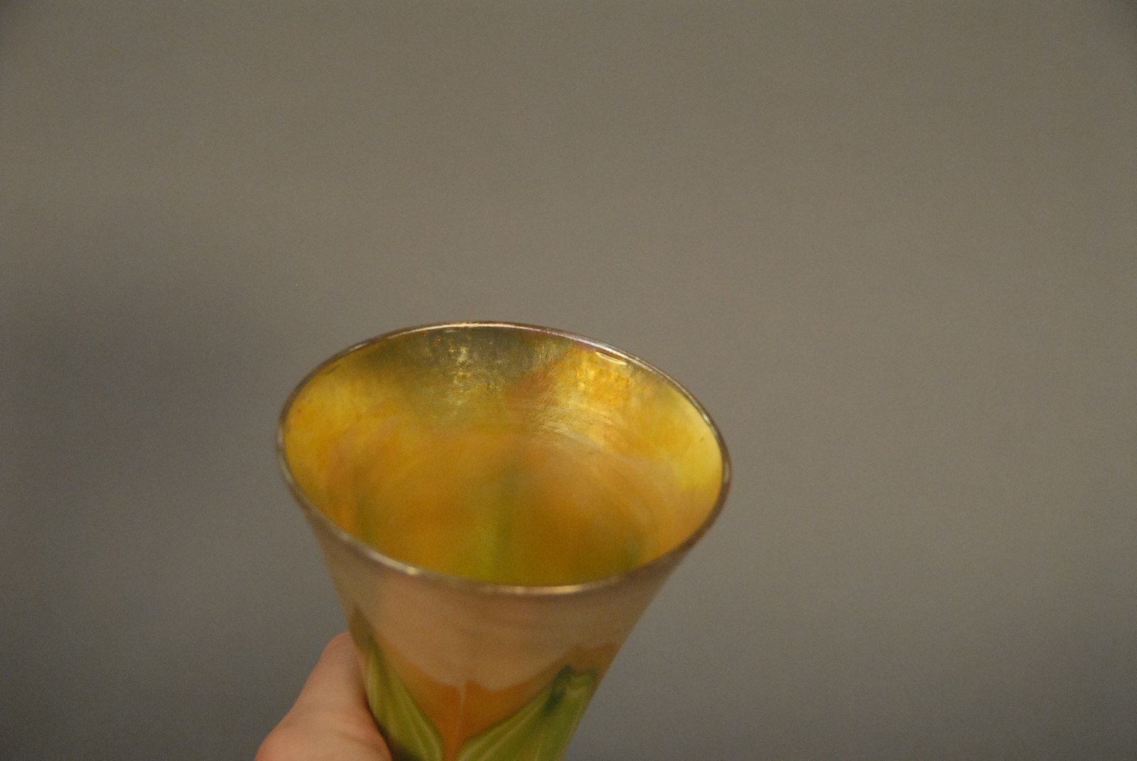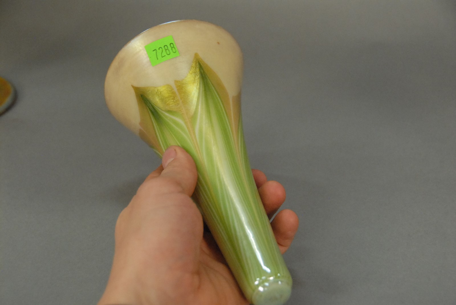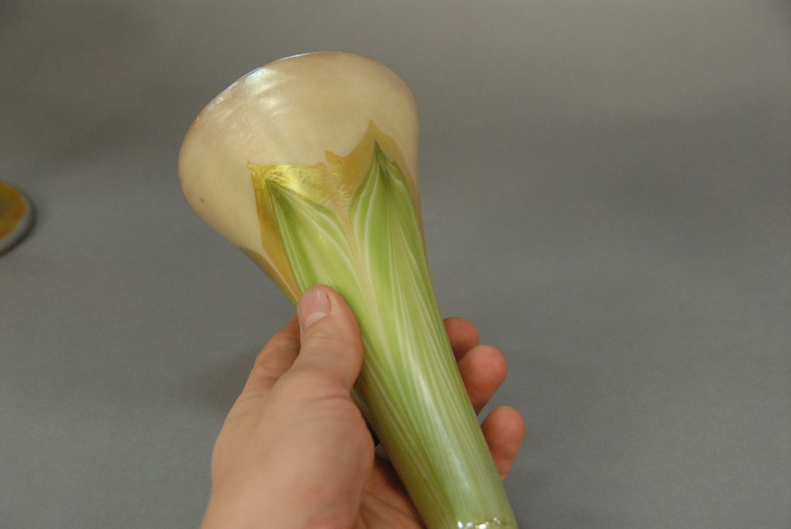 Lot 411: Tiffany studios Trumpet vase with pulled feather decoration on gold favrile body fitted in a bronze dove mount, base monogrammed, vase marked LCT, base marked Tiffany Studios New York 1048. ht. 11 5/8 in.
