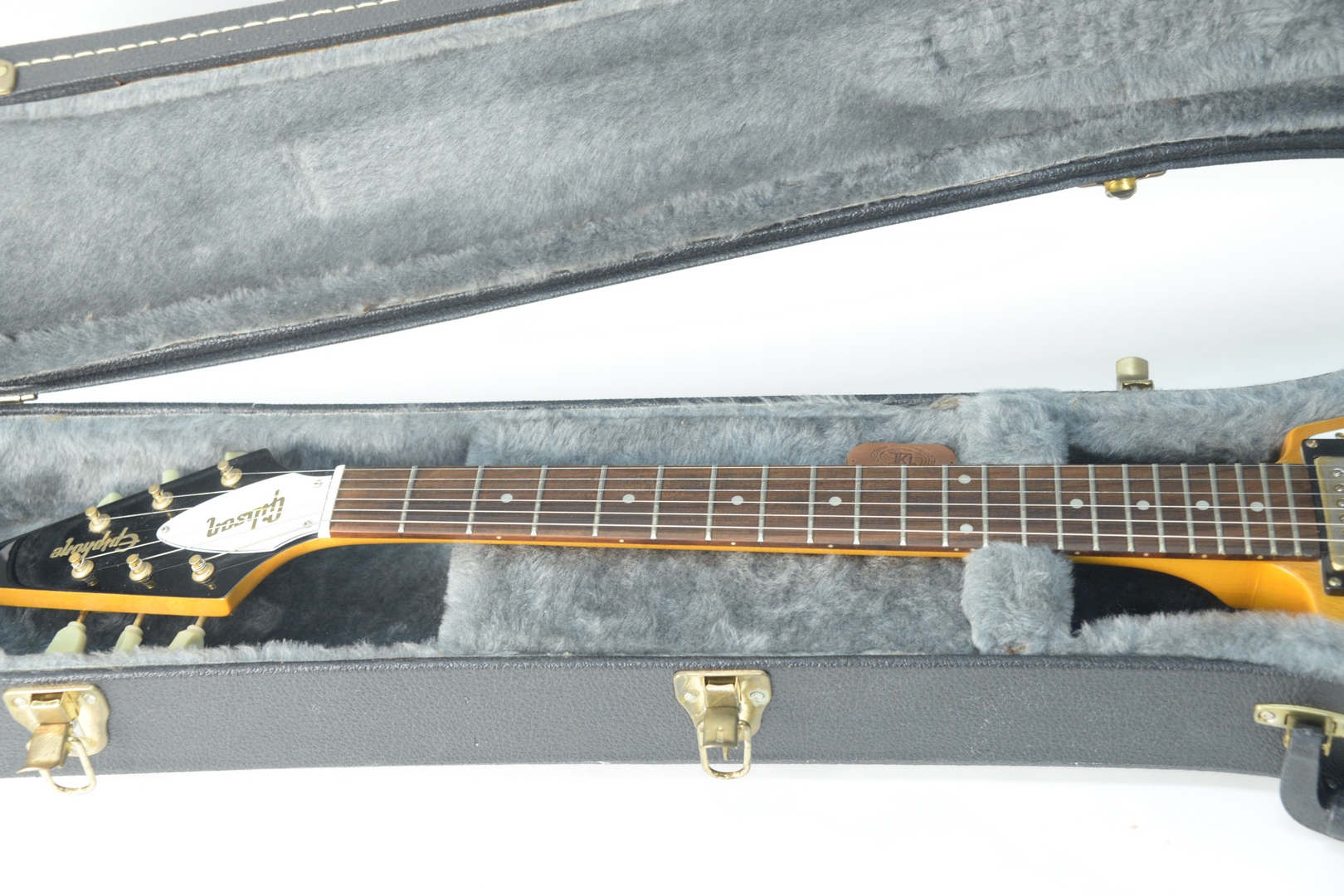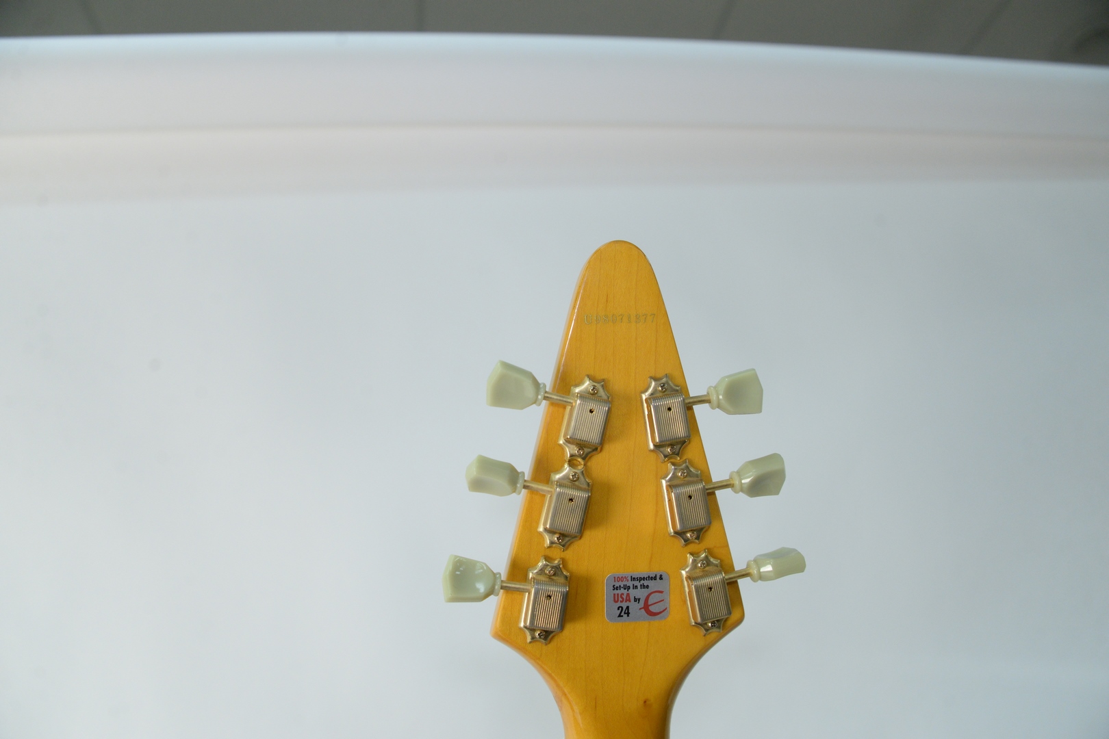 Lot 412: 1998 Epiphone ’58 Flying V Reissle Guitar, serial #U98071377, Korina Natural finish, original hard-shell case, length 45 inches.