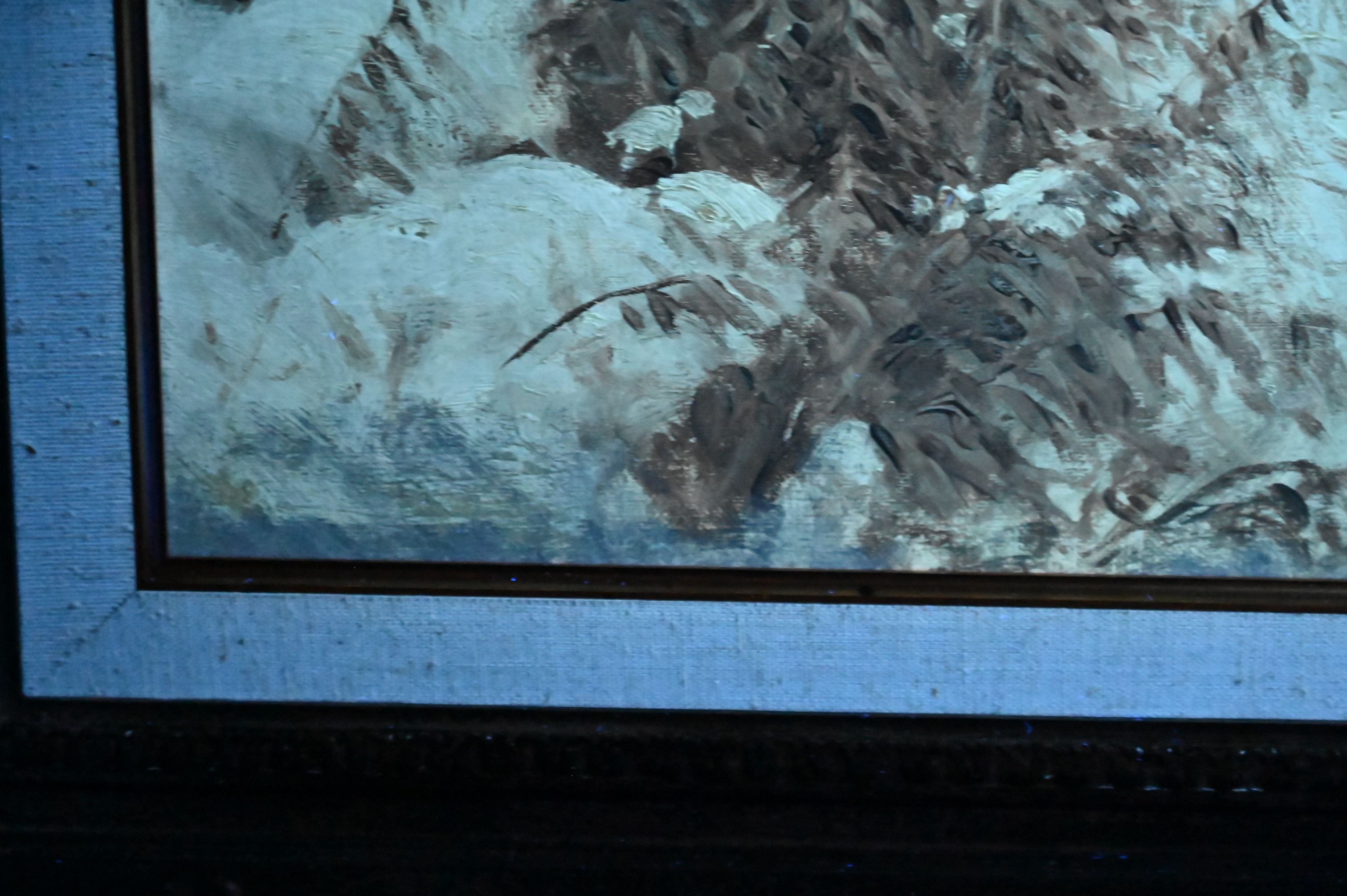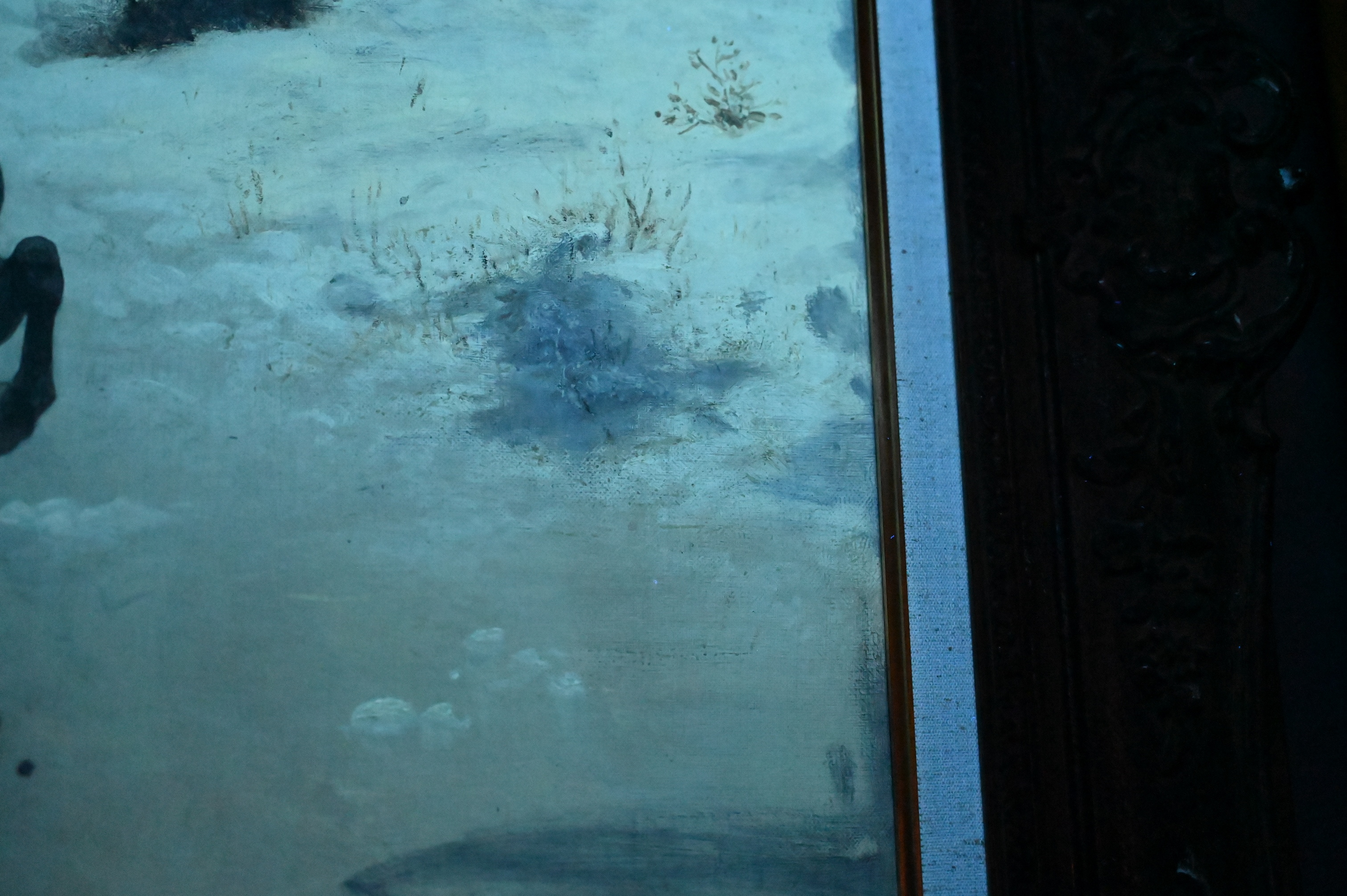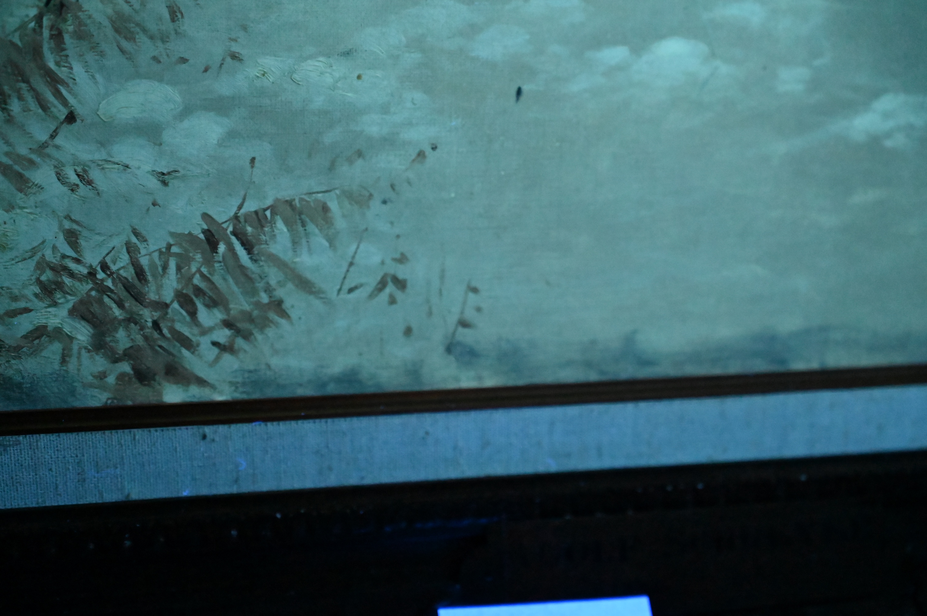 Condition: presents well, relined and restretched canvas, craquelure throughout, heavy varnish, inpainting visible under black light, inpainting concentrating along borders, heavily to sky and lower right
