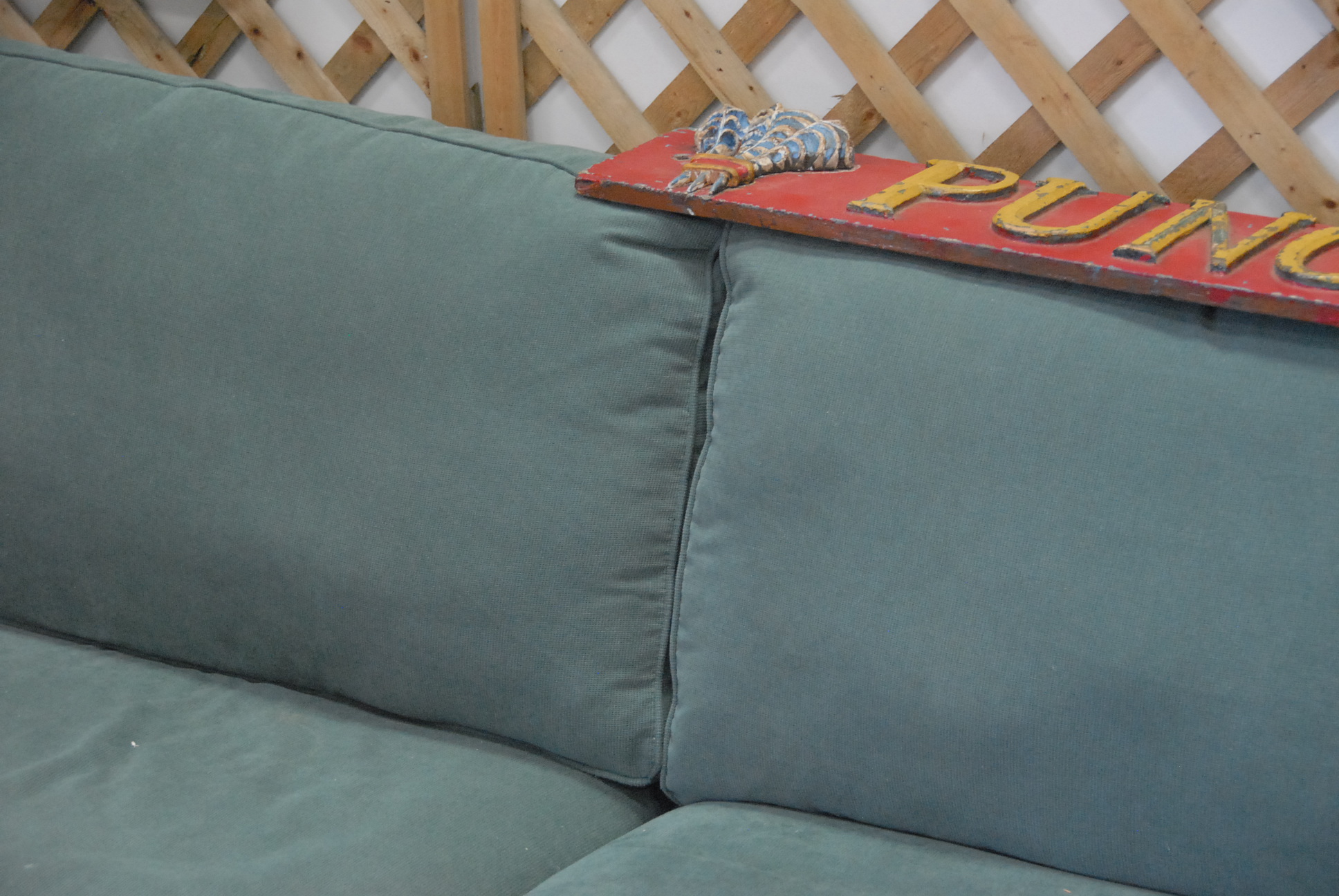 Crate & Barrel sleeper sofa with blue/gray upholstery.