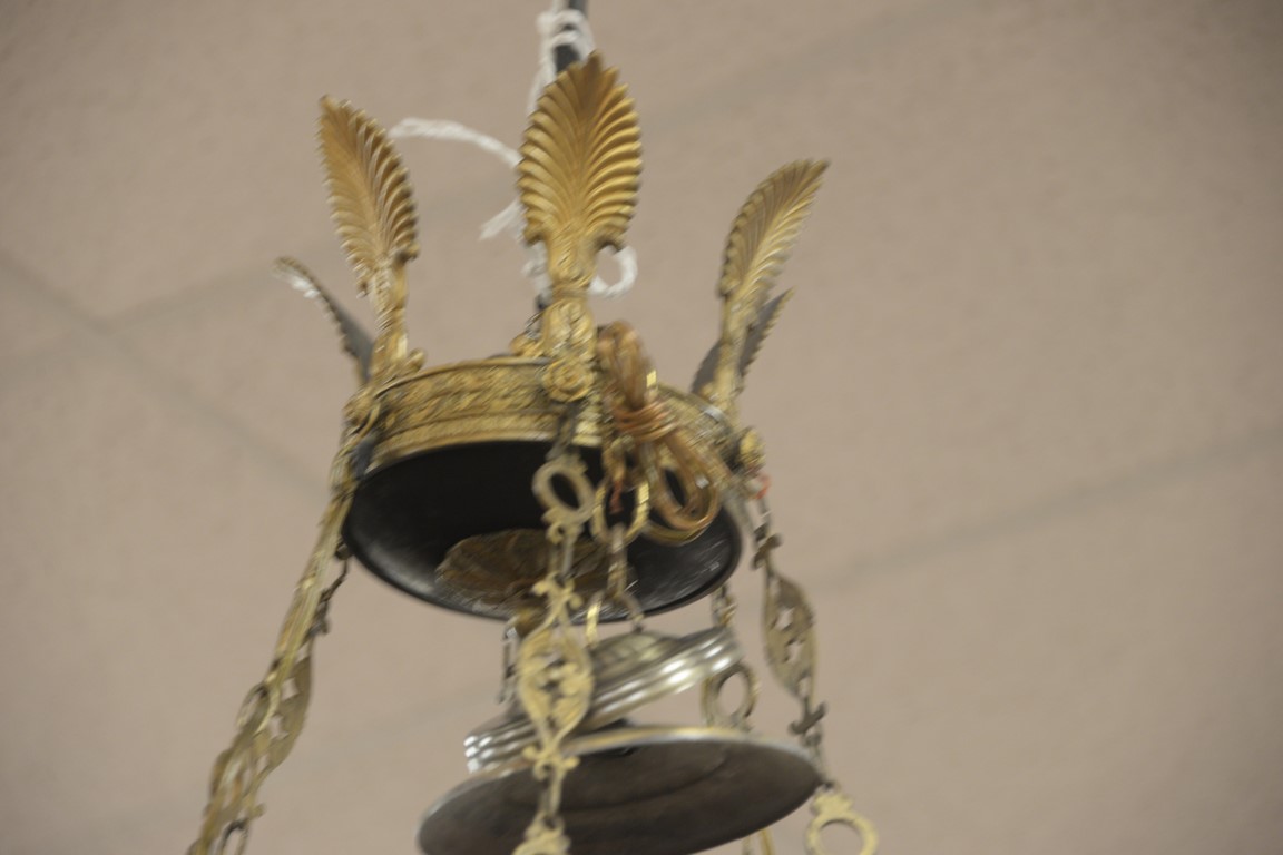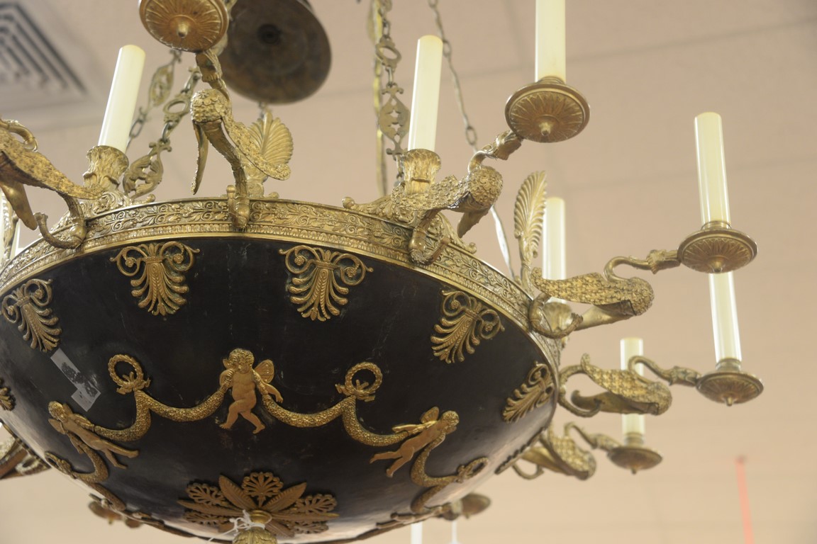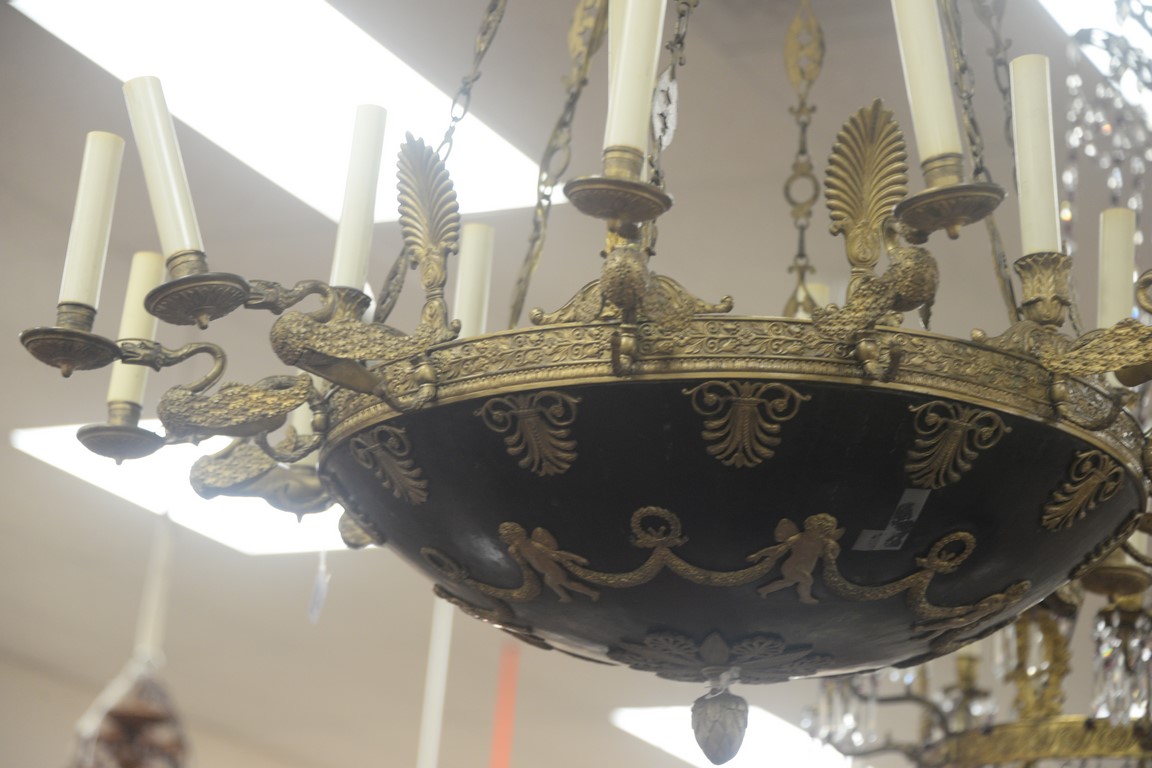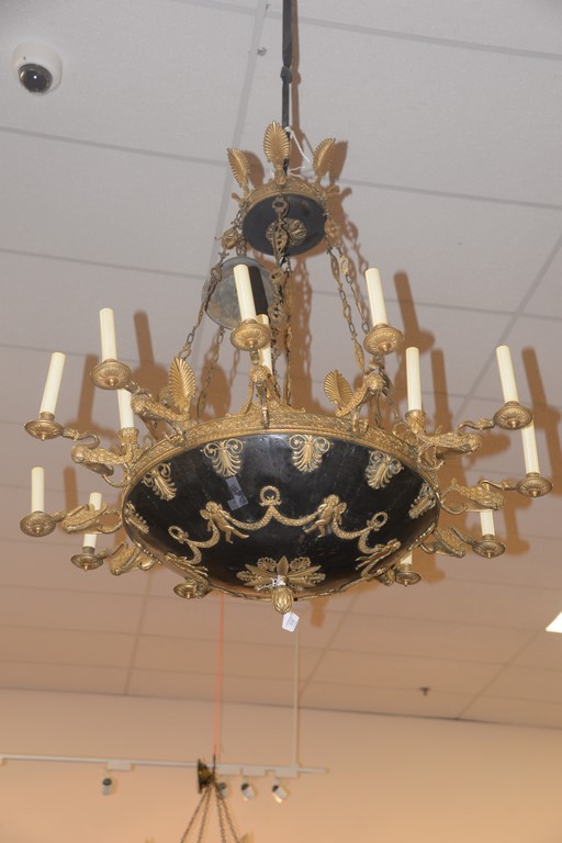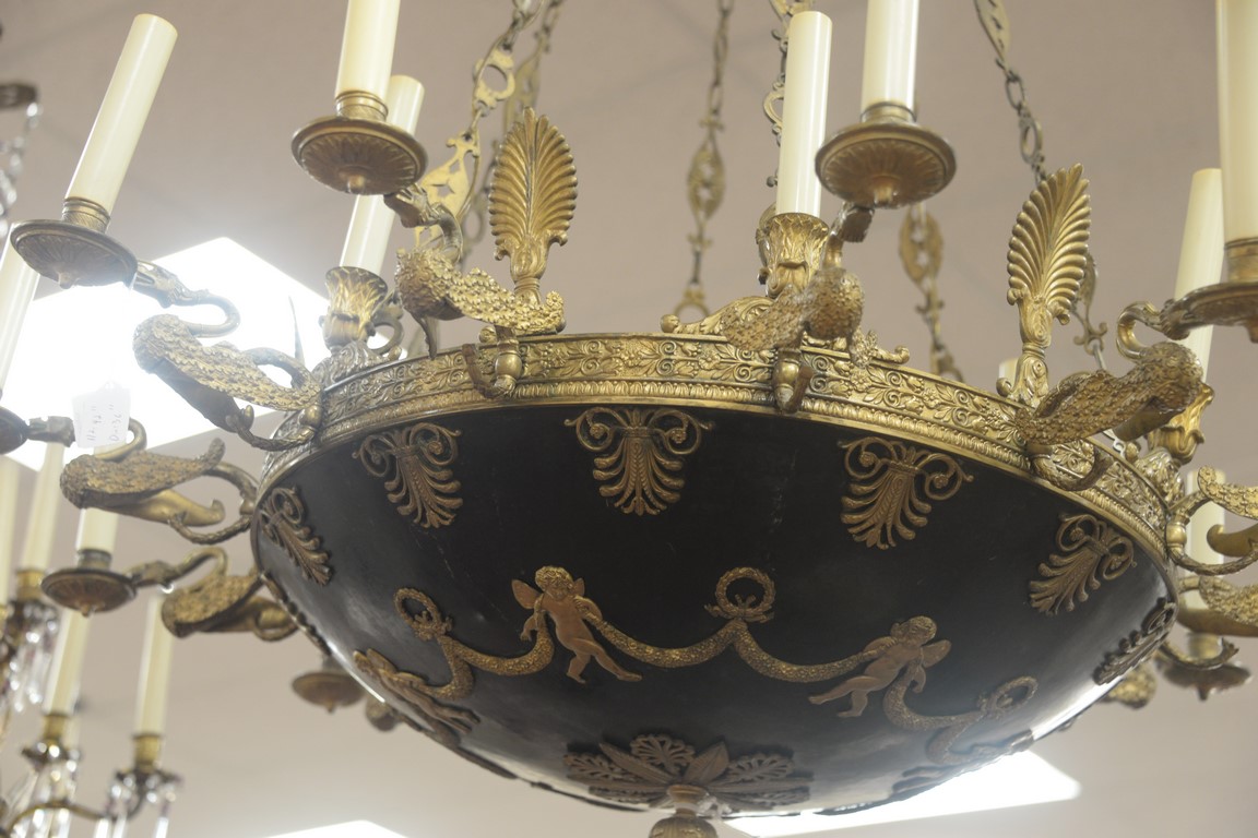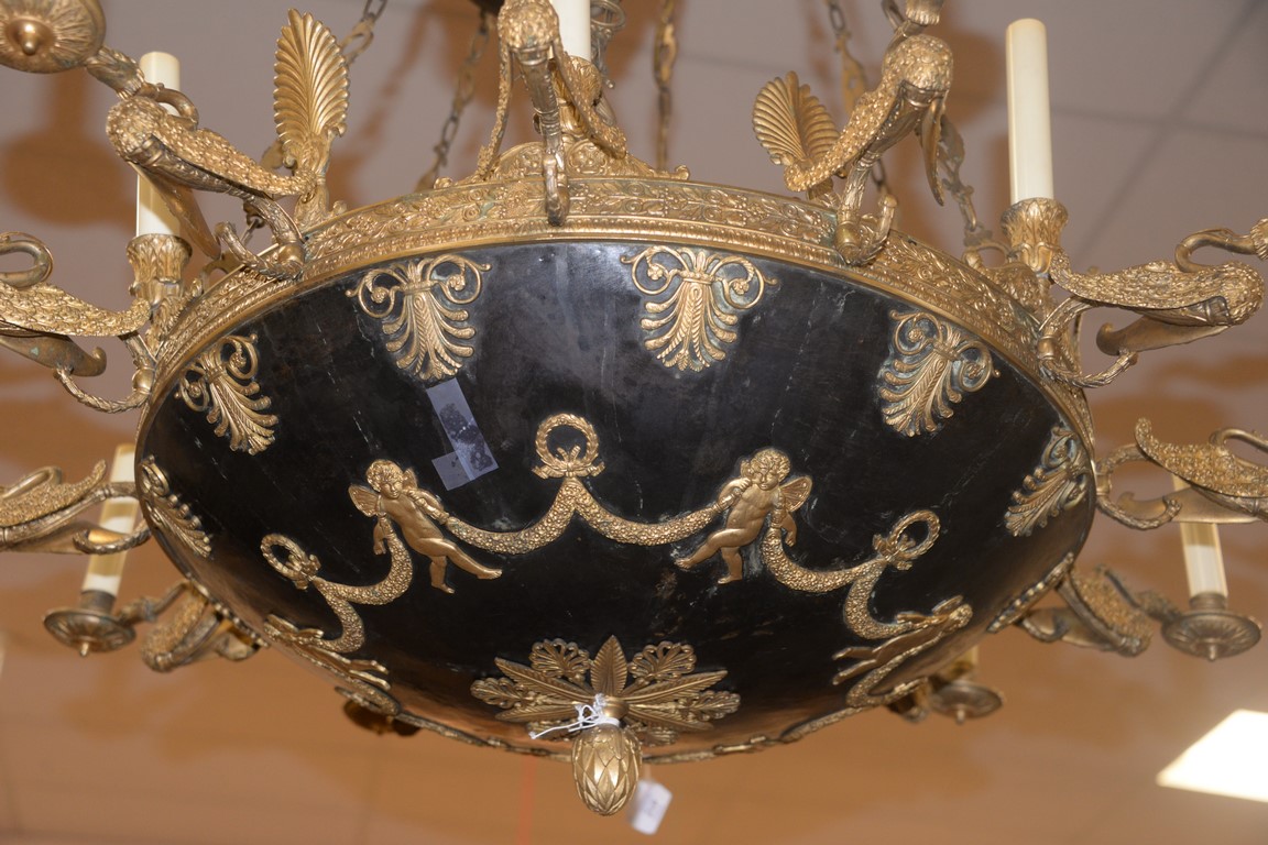 Lot 412: Empire gilt and patinated bronze chandelier, 18 light, dish form with winged putti, wreaths and swags, and anthemion, edge mounted w…