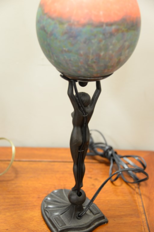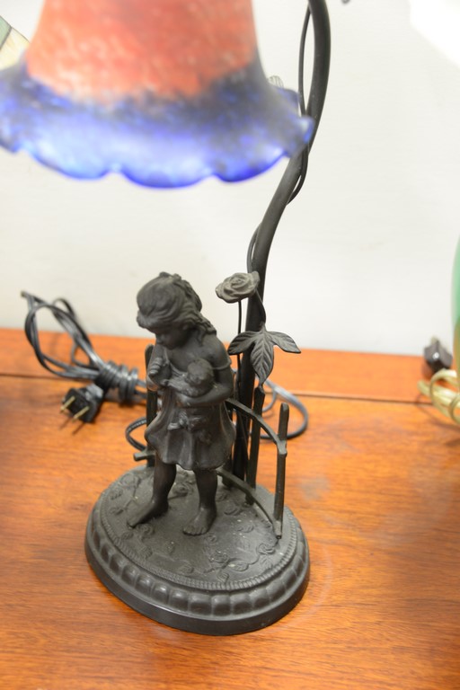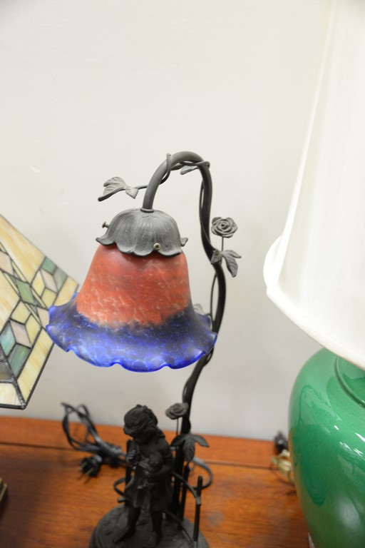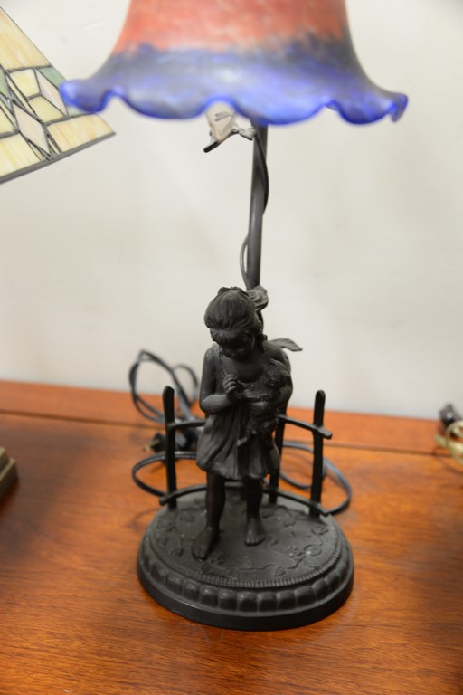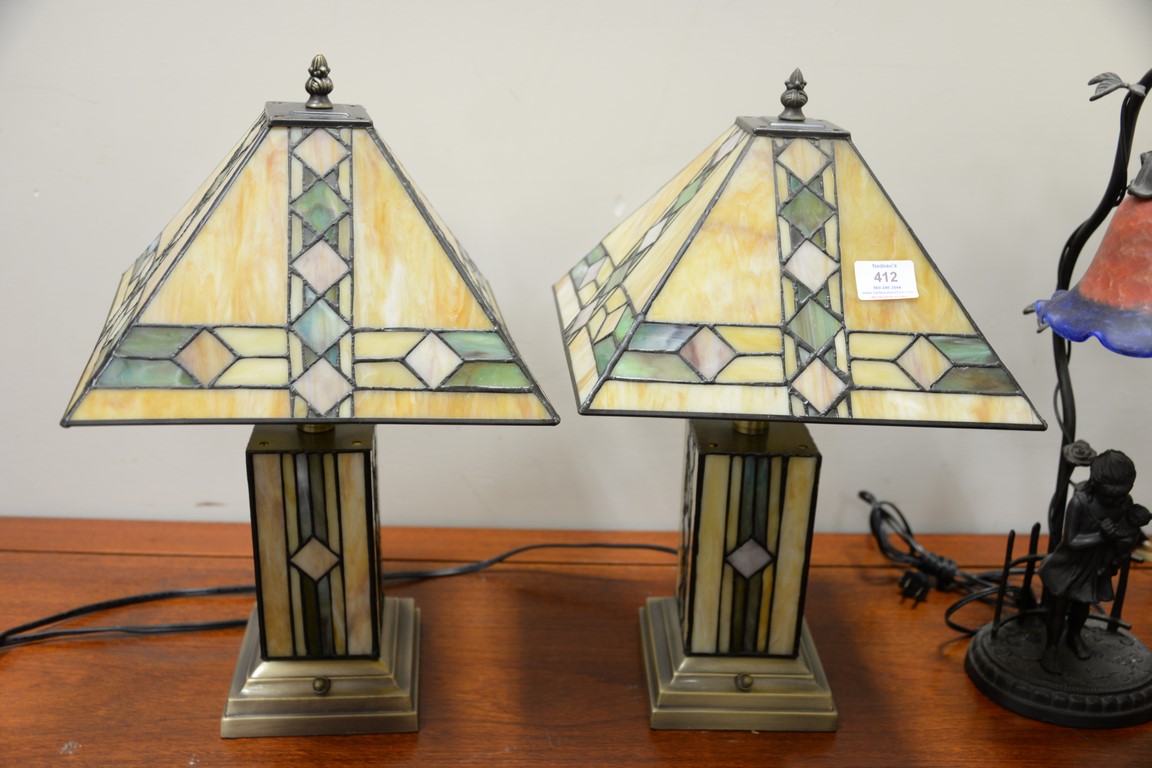 Lot 412: Five contemporary lamps including two figural lamps with art glass shades, pair of leaded glass lamps with matching shades, and a gr…