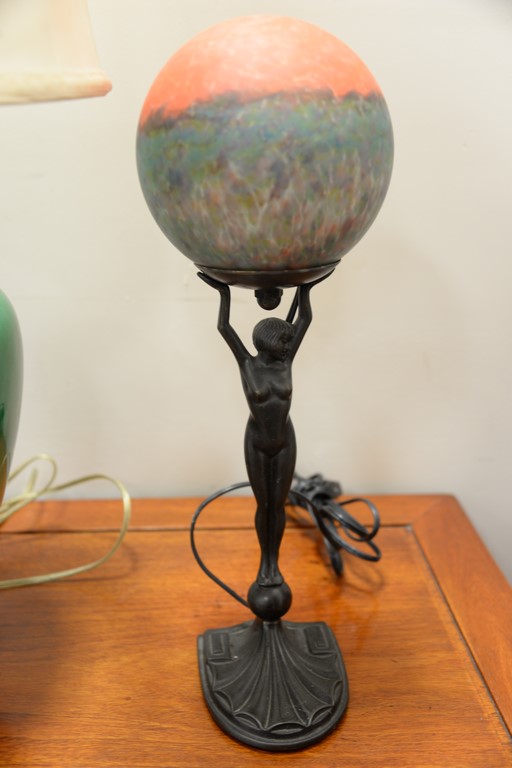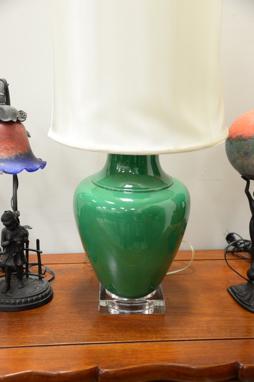 Five contemporary lamps including two figural lamps with art glass shades, pair of leaded glass lamps with matching shades, and a green glazed lamp. total ht. 16in. to 31in.