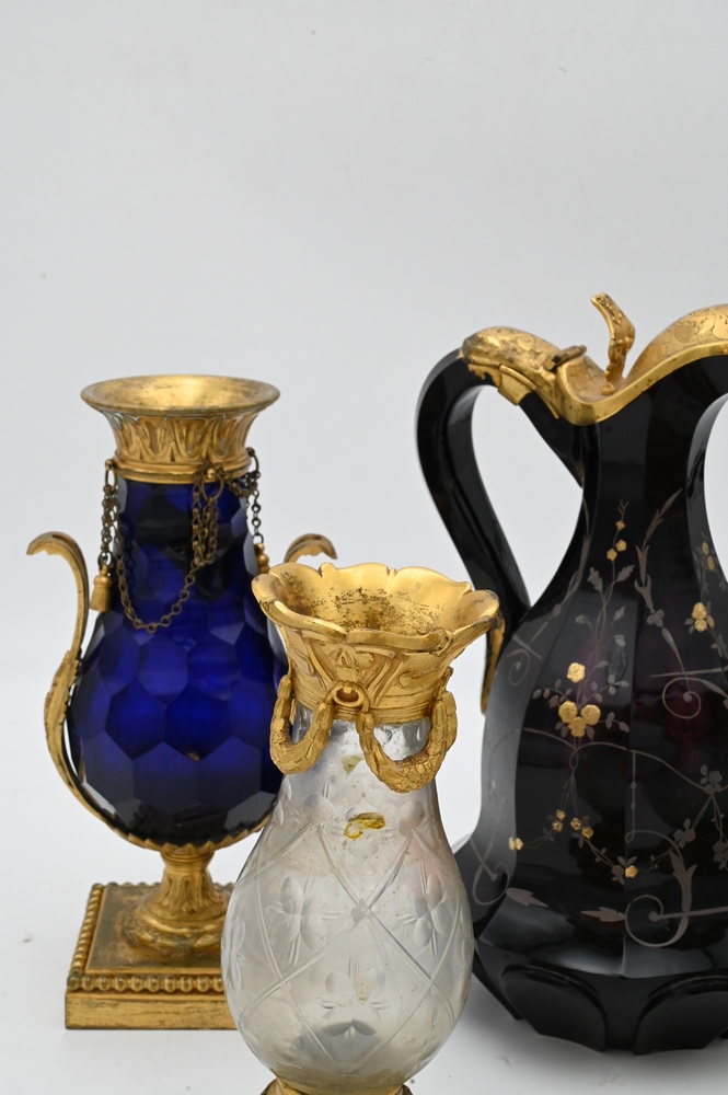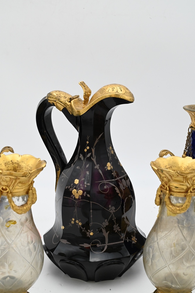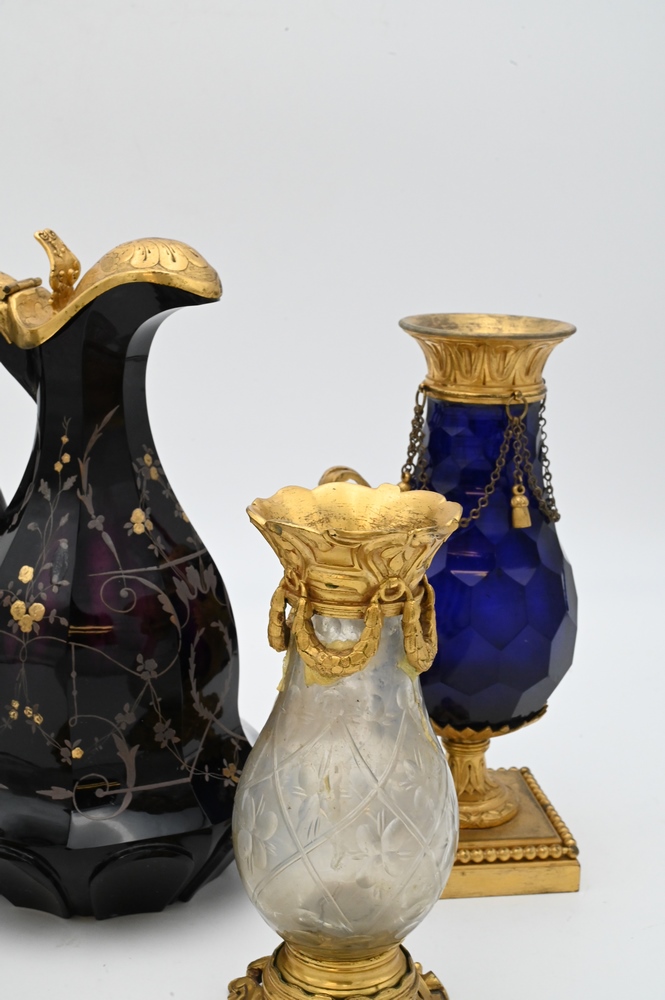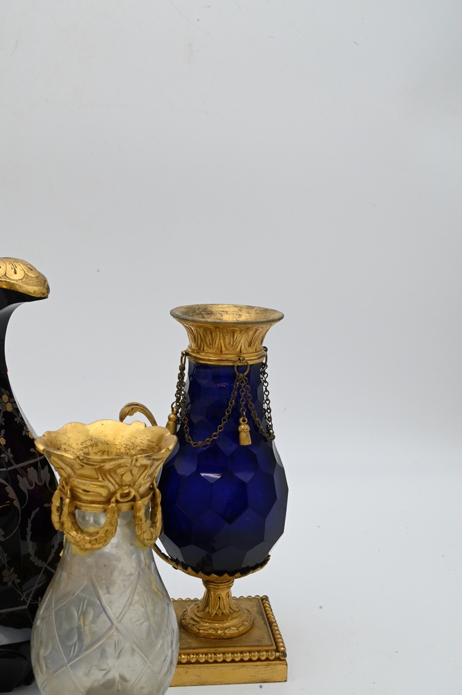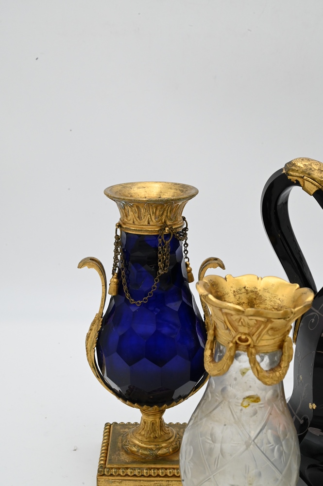 Five Piece Group, to include pair of Louis XVI gilt bronze and clear cut glass vases, pair of cobalt blue glass vases with gilt bronze mounts and a gilt enameled and amethyst glass, ewer with metal top, height 11 inches, as is.