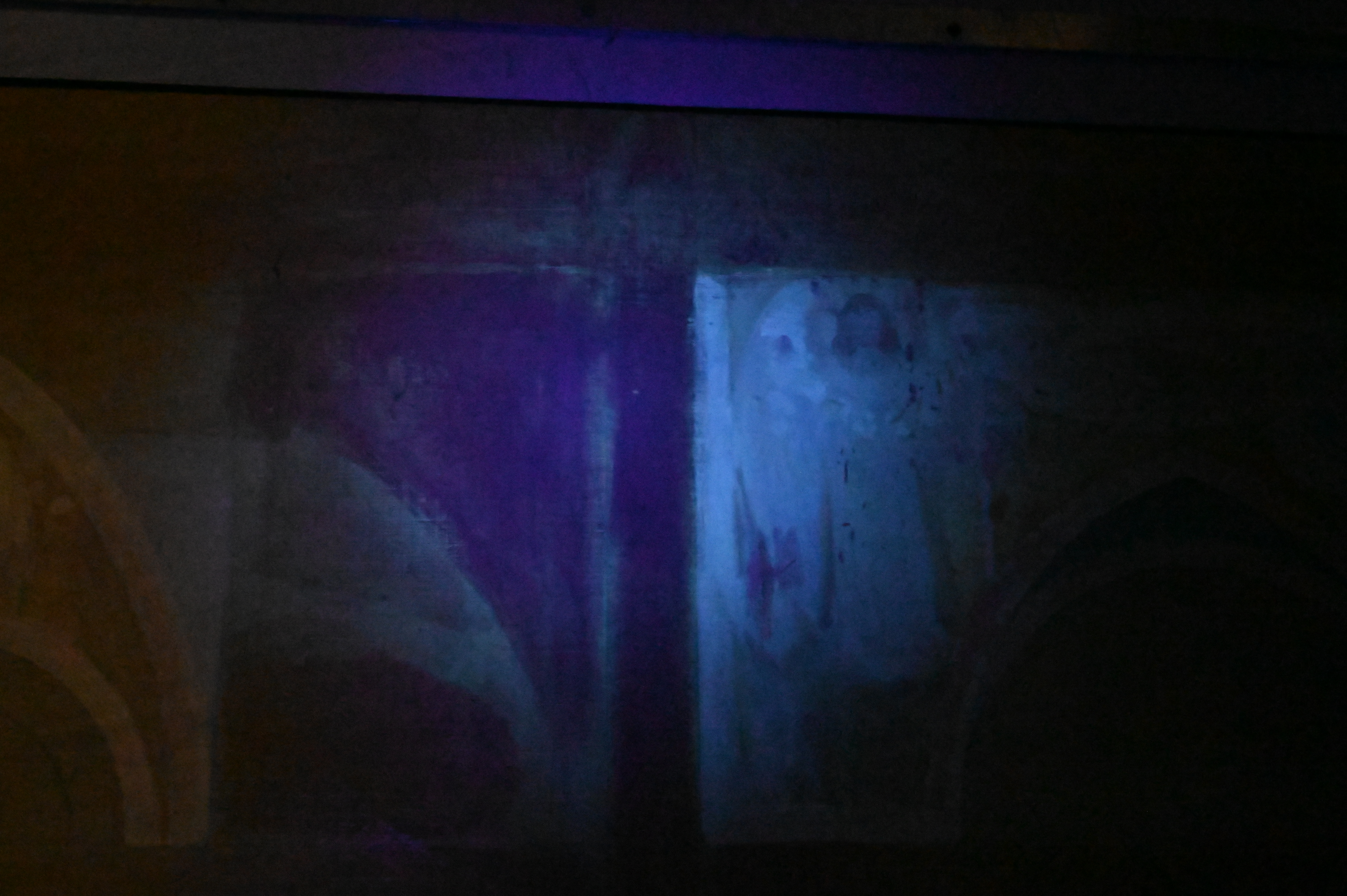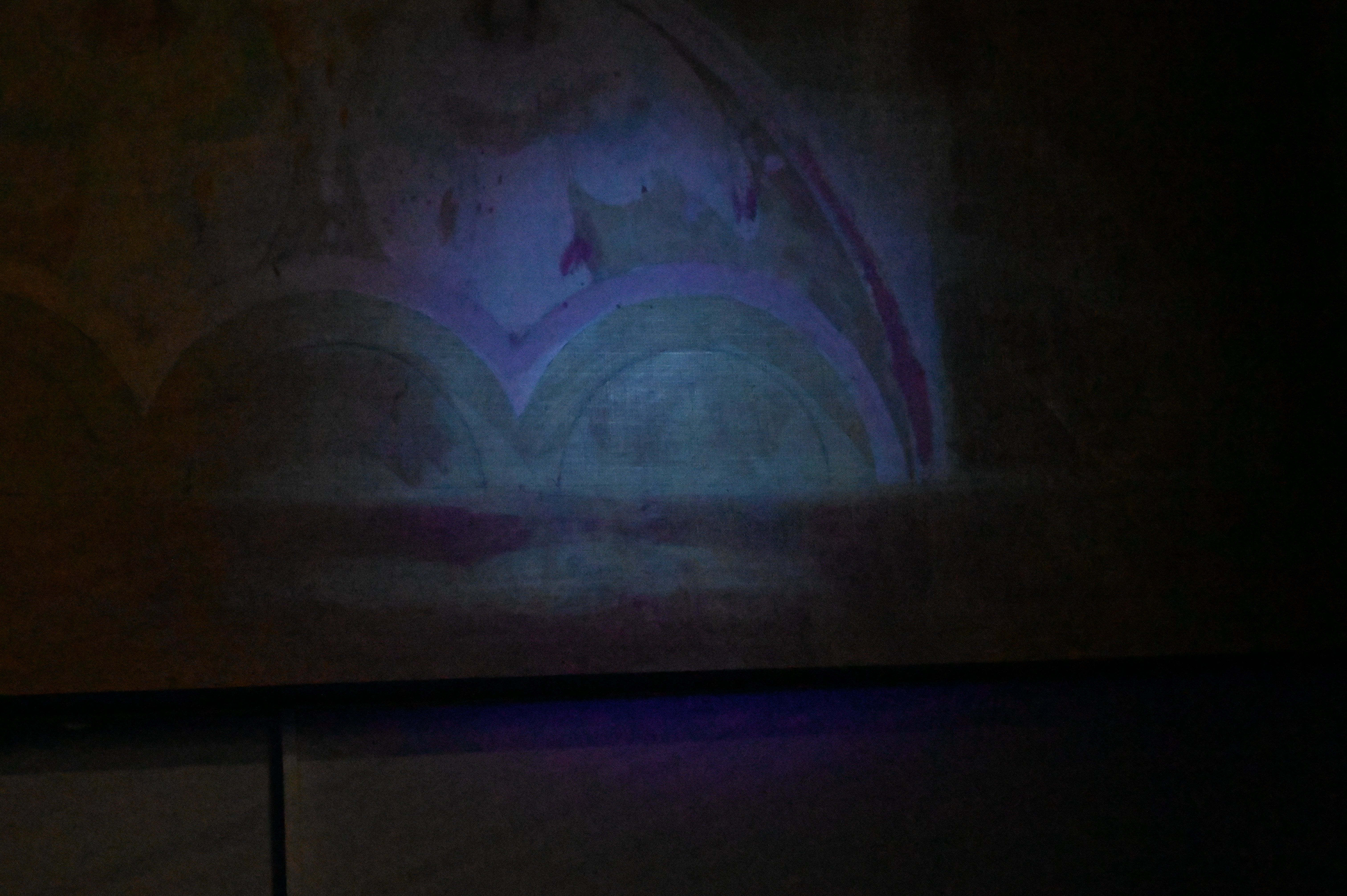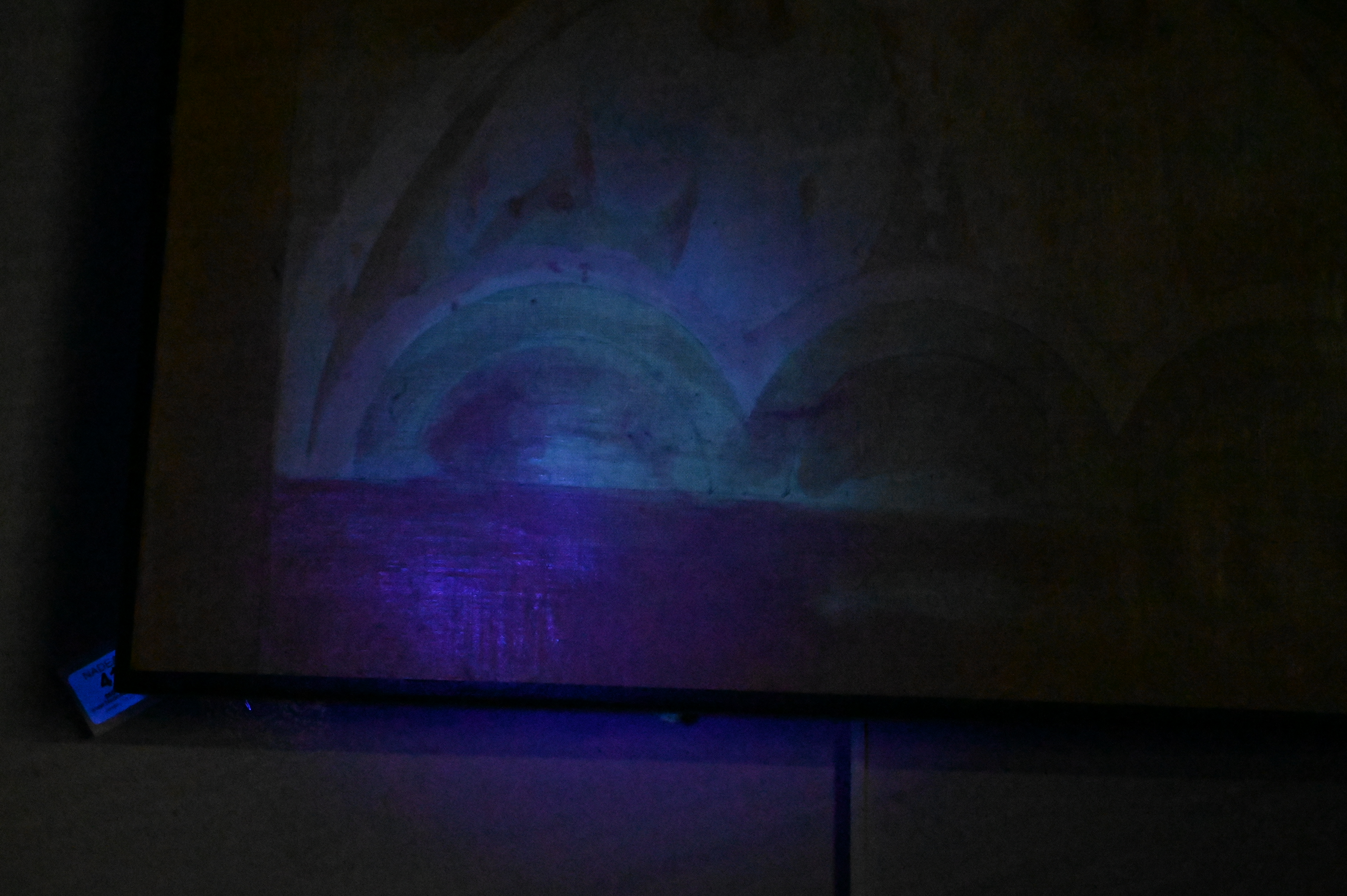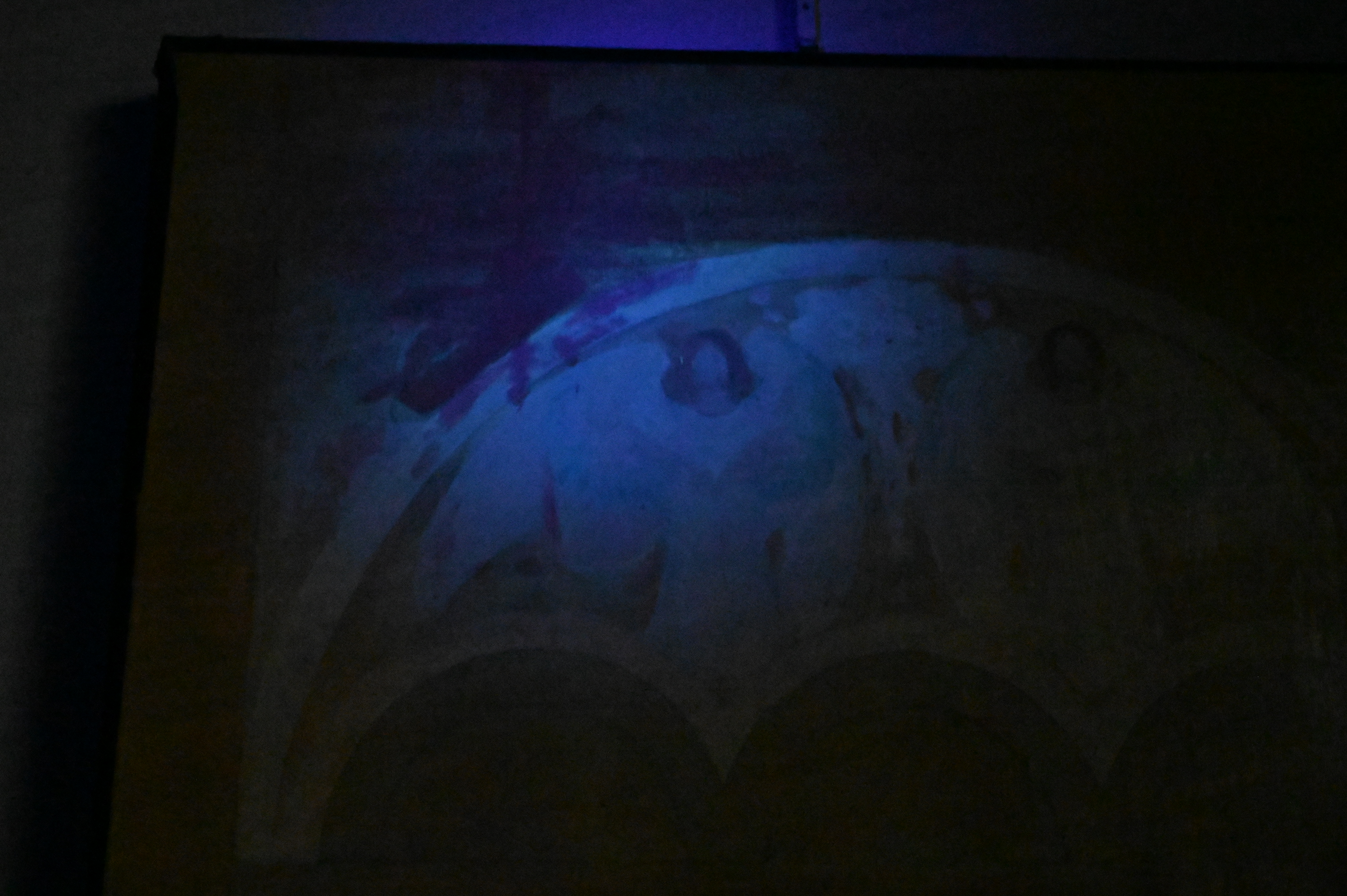 Condition: Dirty, relined, canvas seems to be indented. Black light photos attached