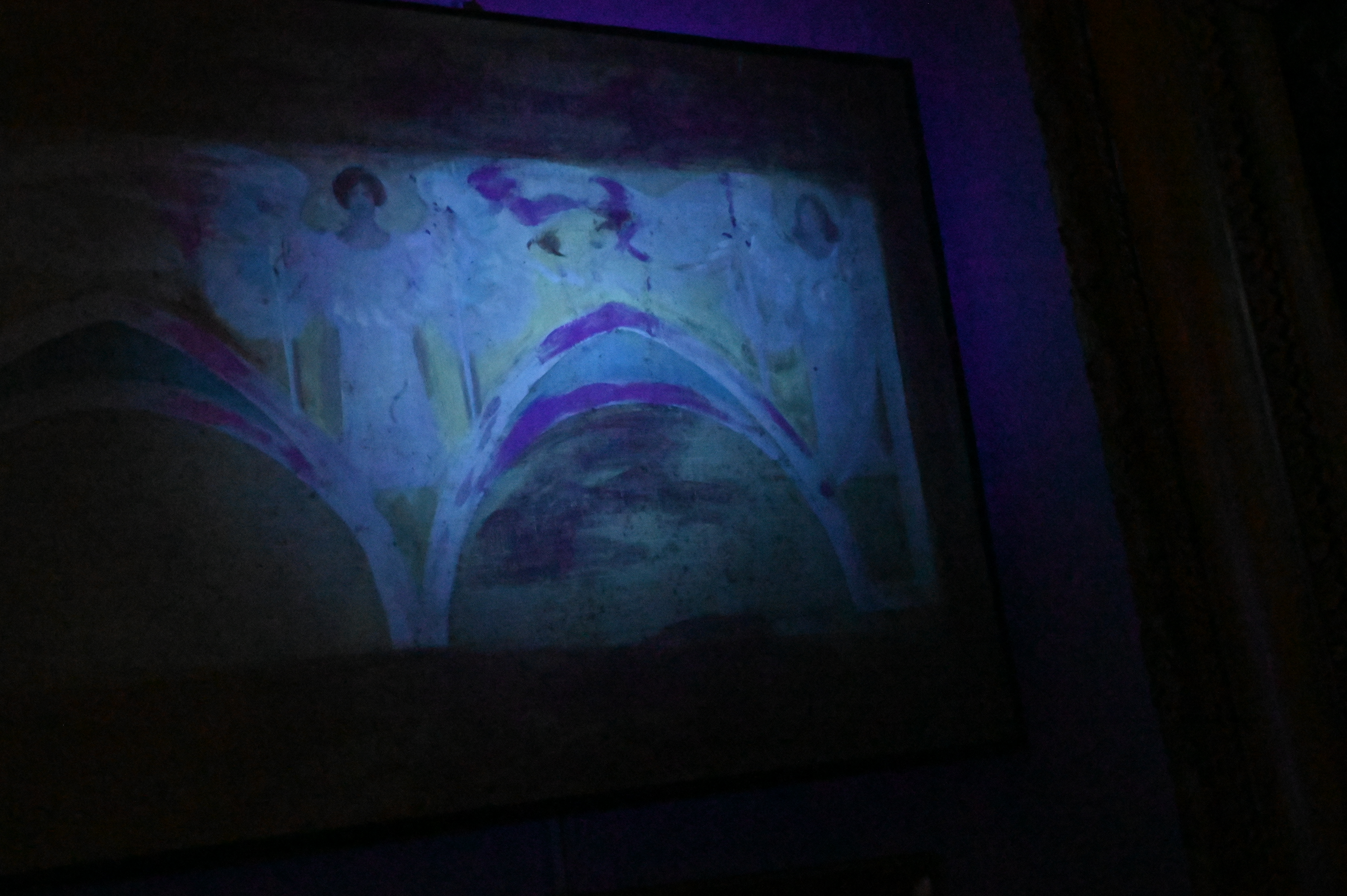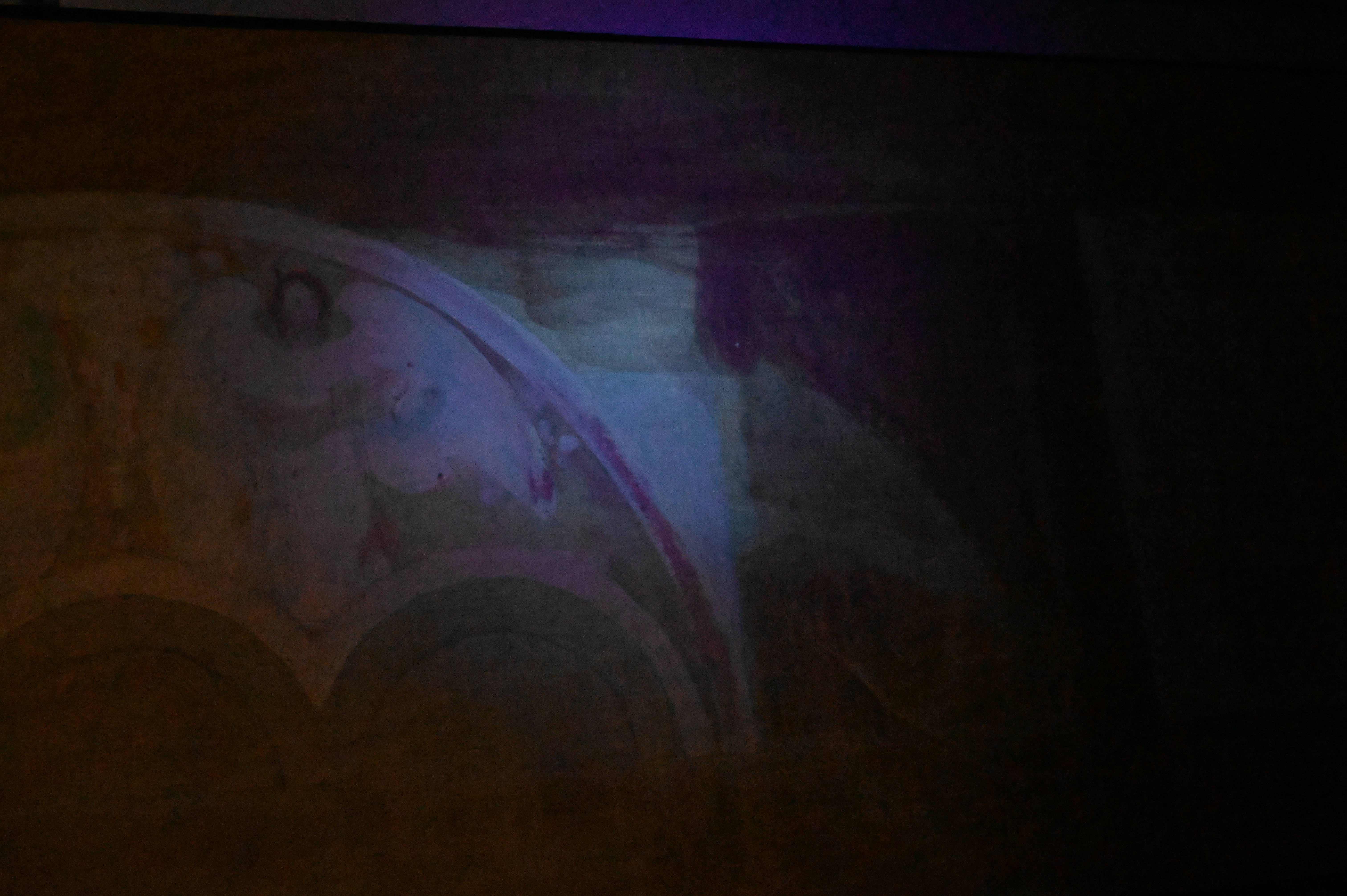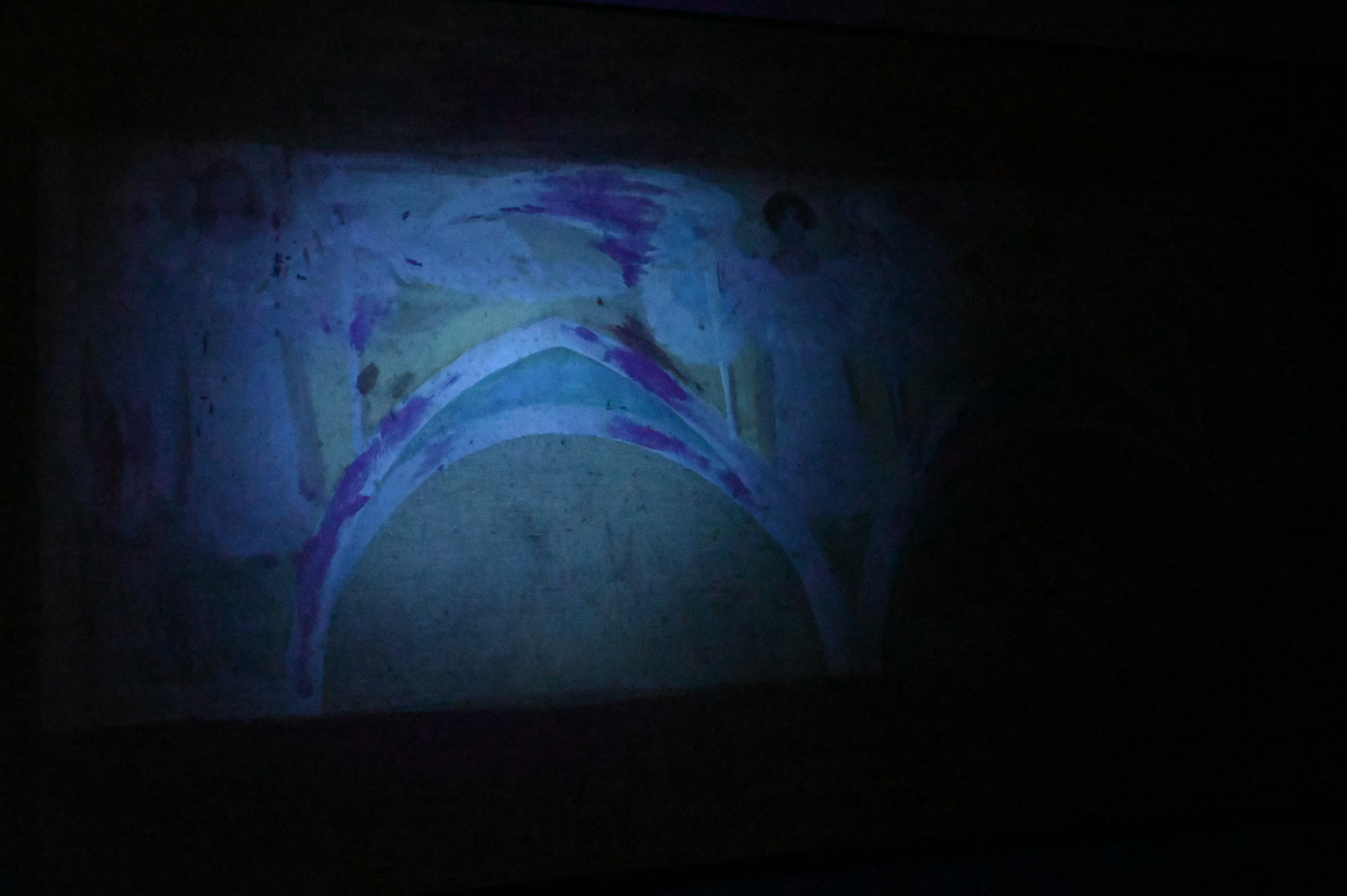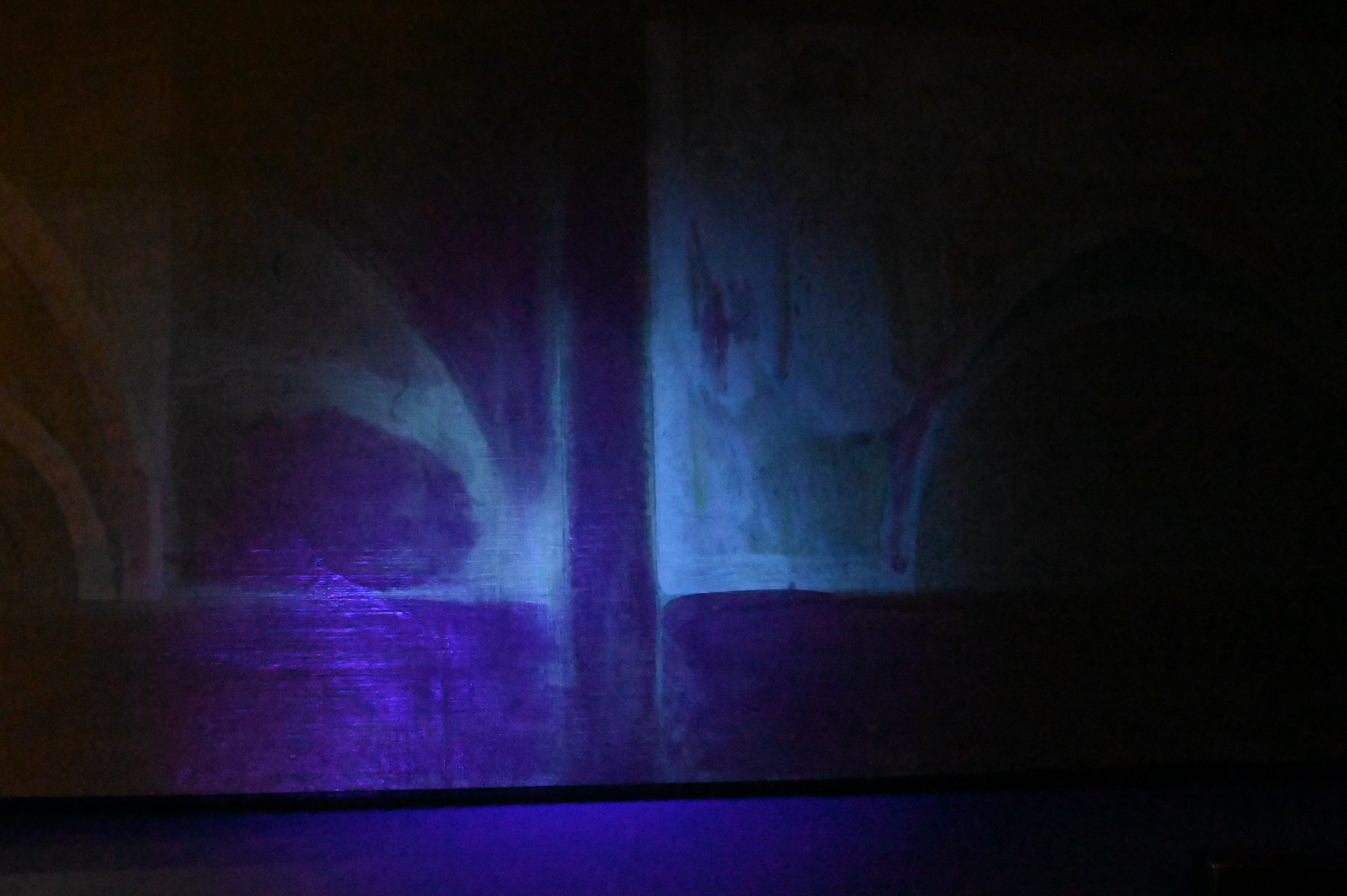 Condition: Dirty, relined, canvas seems to be indented. Black light photos attached