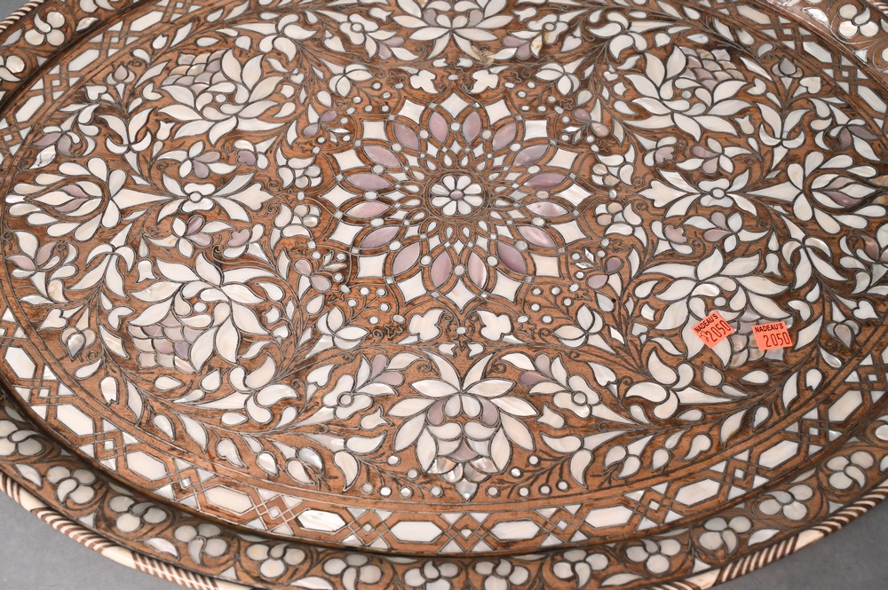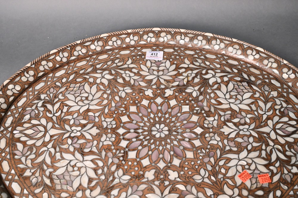 Lot 412: Mahogany Tray, having mother of pearl inlay of peonies and florets, sun faded, length 27 1/2 inches.