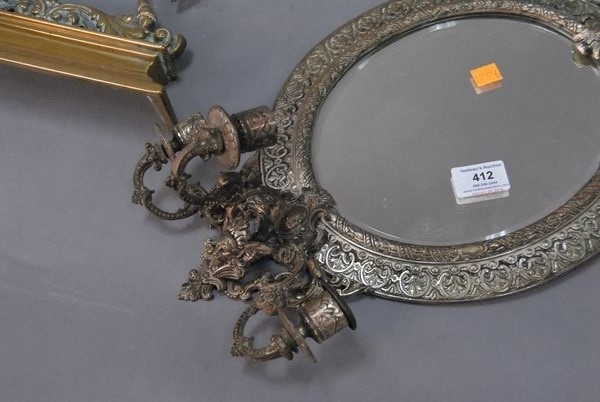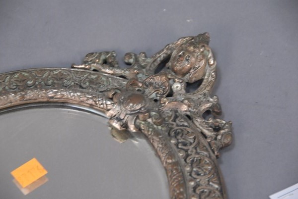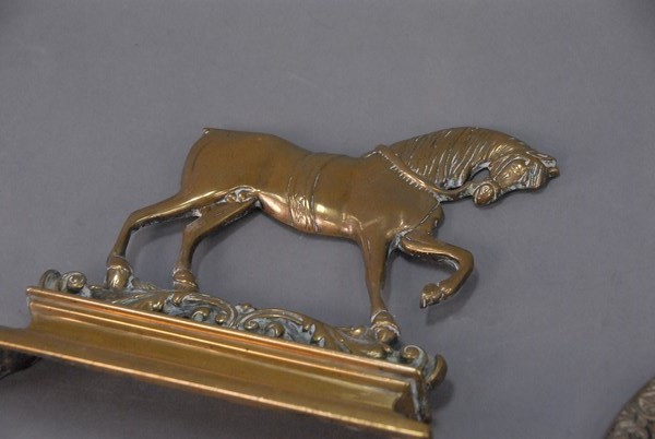 Metal framed mirror and brass horse door stop tail off.