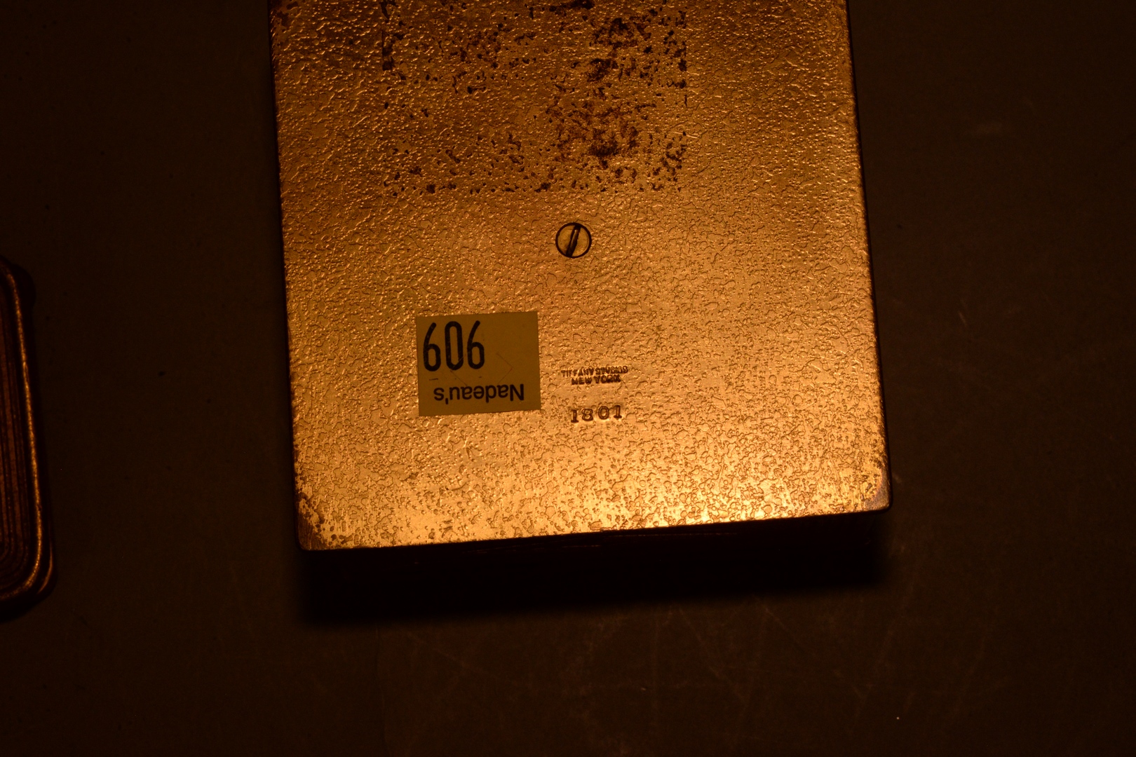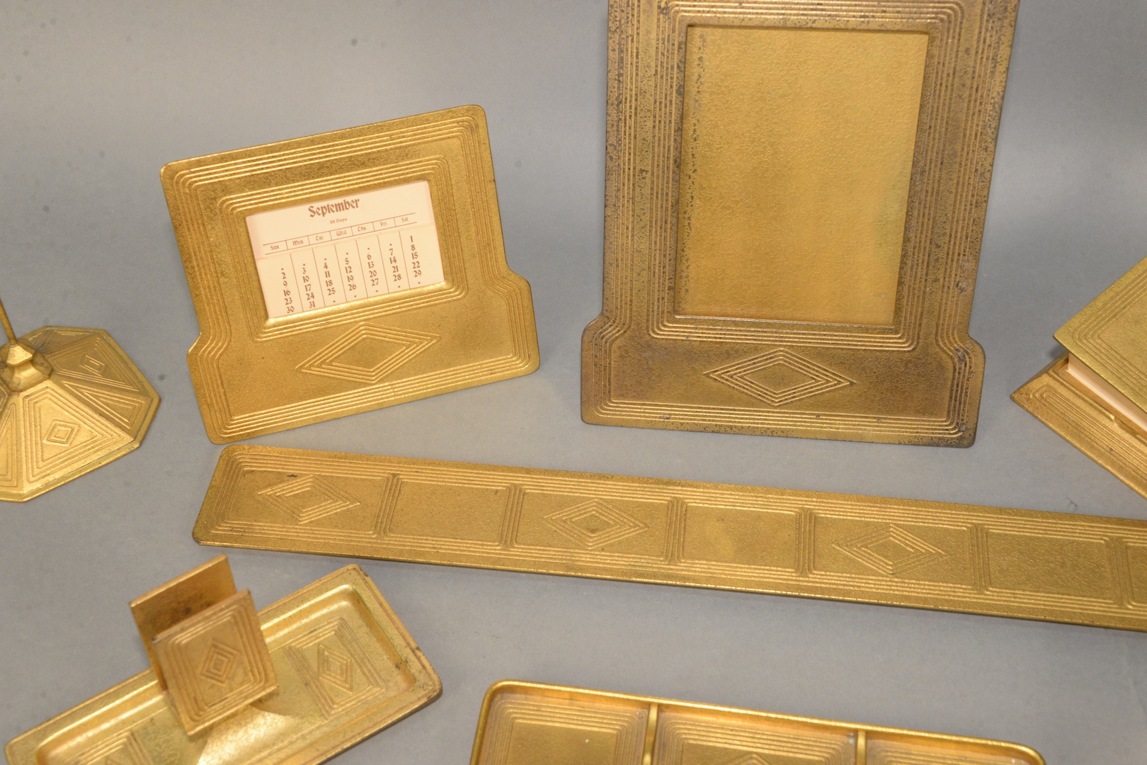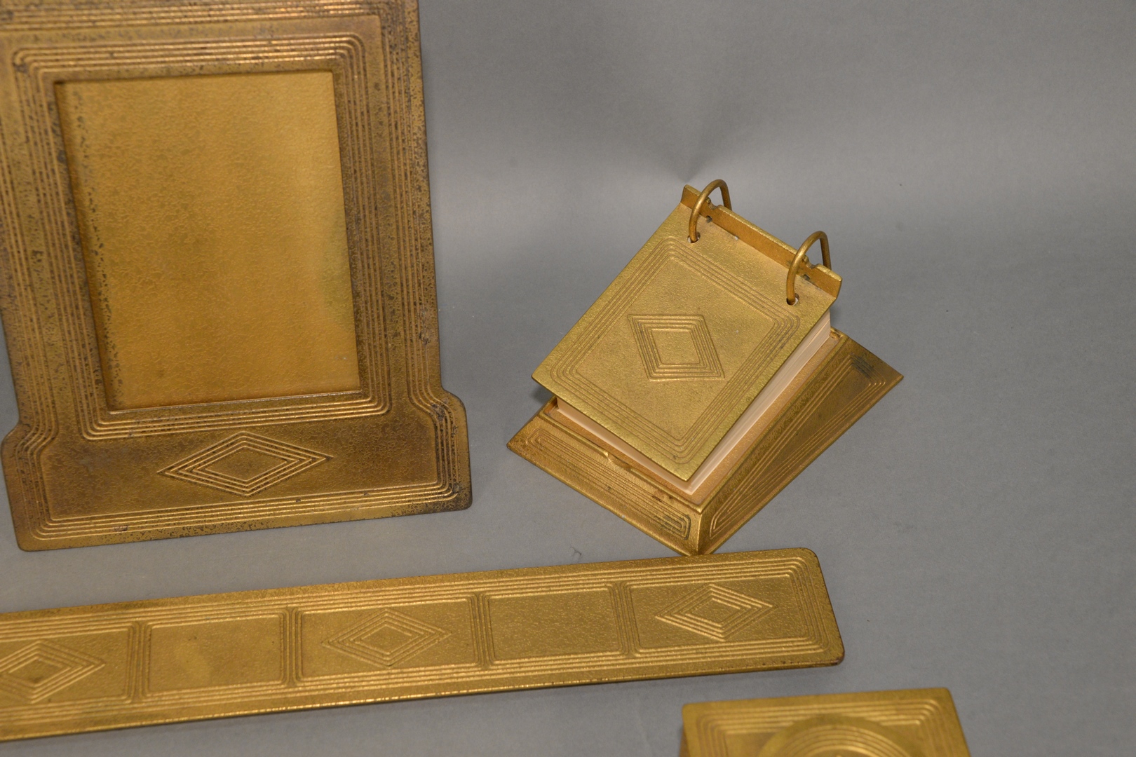Lot 412: Nine Piece Tiffany Studios Graduate Gilt Bronze Desk Set two blotter ends, 1796 desk calendar, 1804 picture frame, 1791 height 9 …