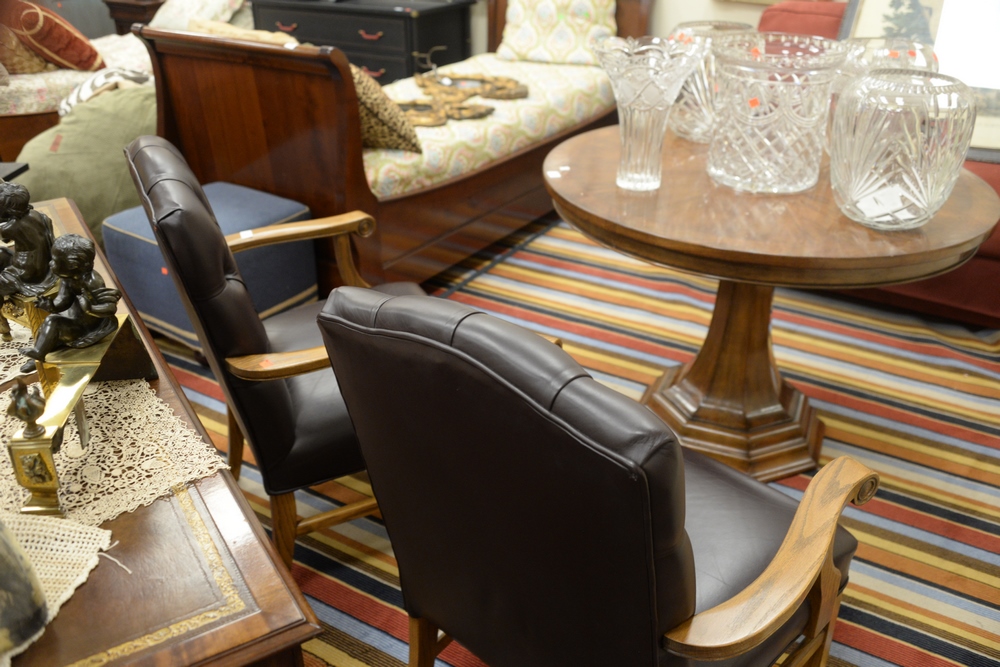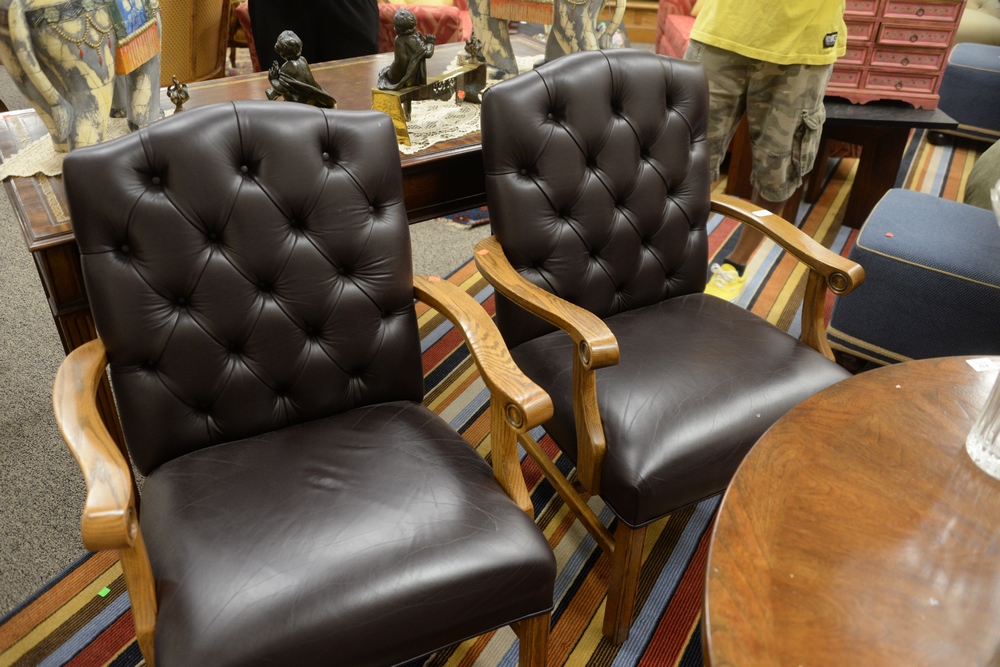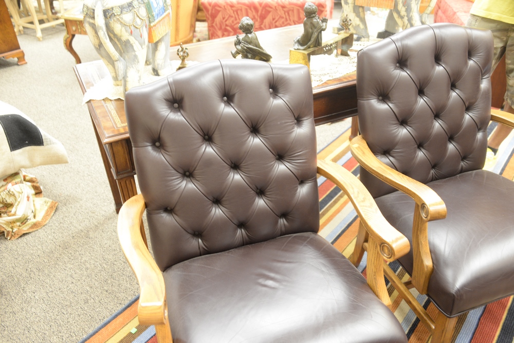 Lot 412: Pair of Oak Arm Chairs, having brown leather upholstered and tufted backs on square legs, height 38 inches, width 27 1/2 inches, dep…