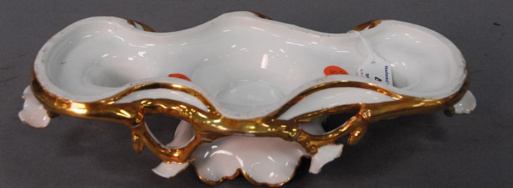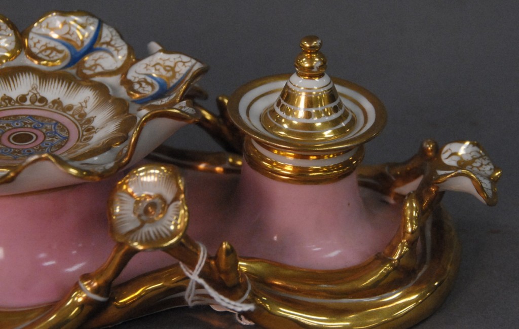 Porcelain desk set with two porcelain covered inkwells surrounded by gilt vines and flowers, 19th century French or Russian.