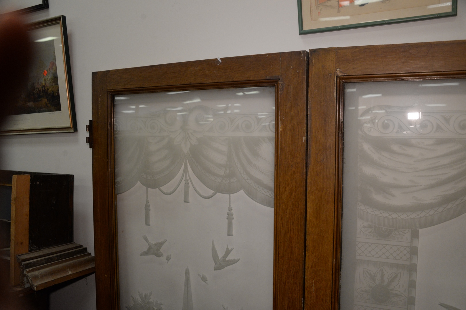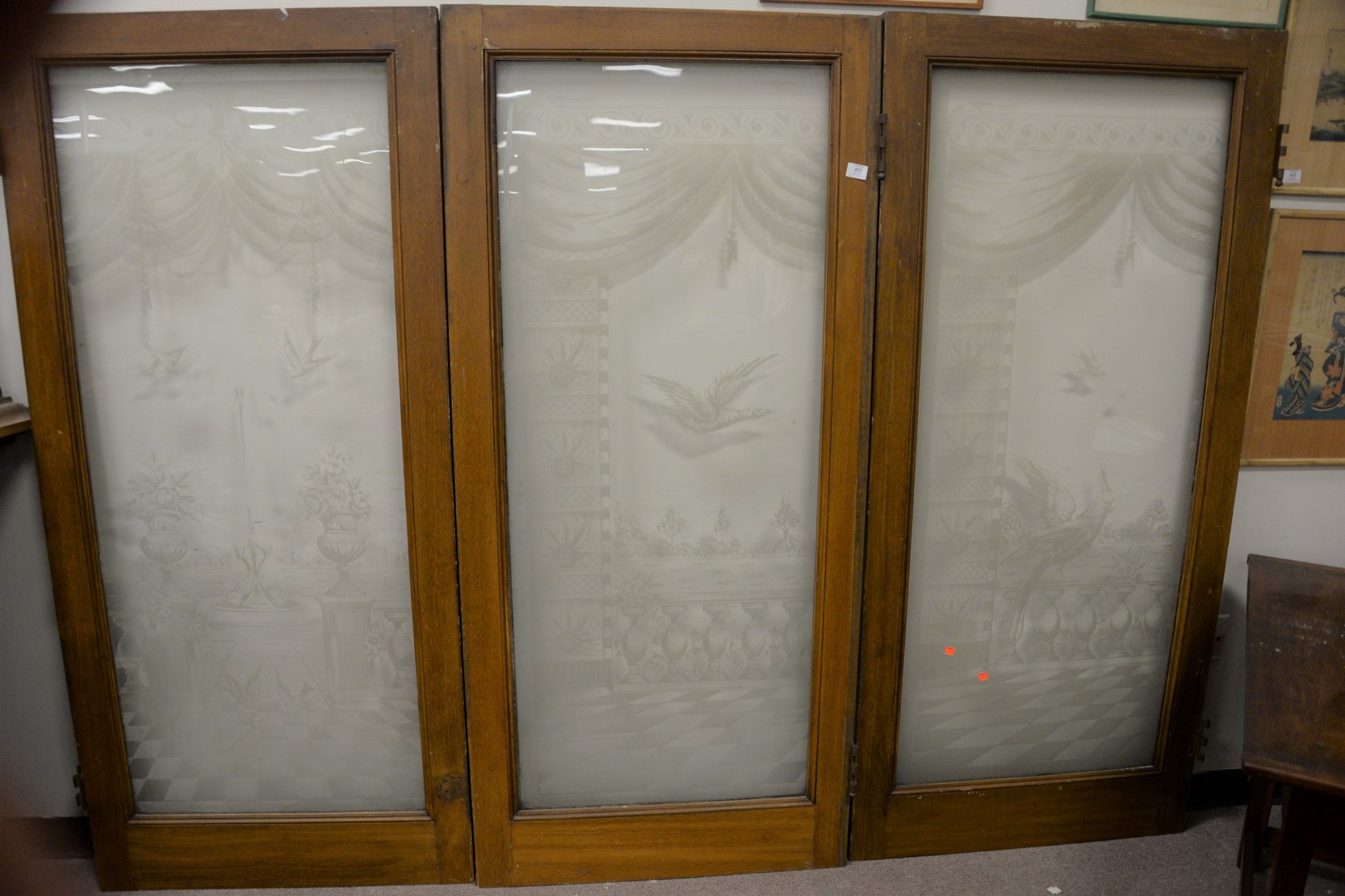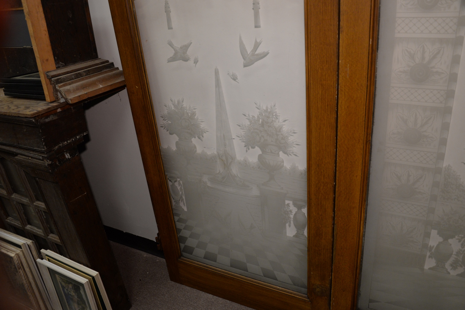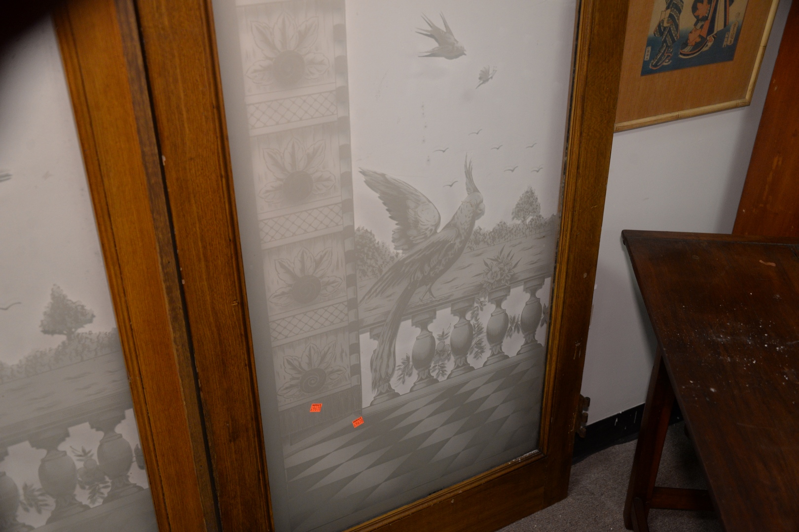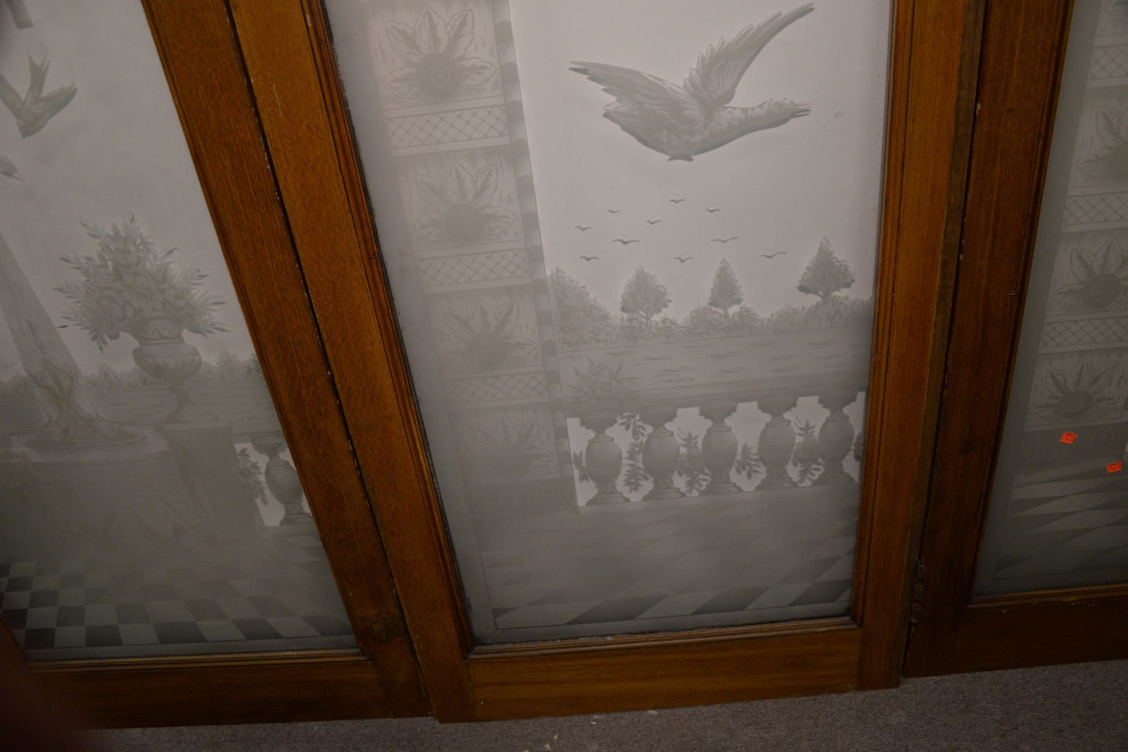 Lot 412: Set of Three Etched Glass Doors with oak frames height 49 1/4 inches, width 31 1/2 inches Provenance: The Estate of Diana Atwood Joh…
