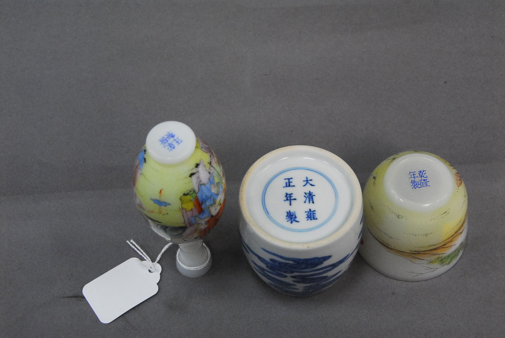 Three piece lot blue and white water coupe, ht. 2 1/2, milk glass vase, and small cup with painted landscape scene, ht. of 5 1/2, cup ht. 2 1/4, dia. 2 1/2.