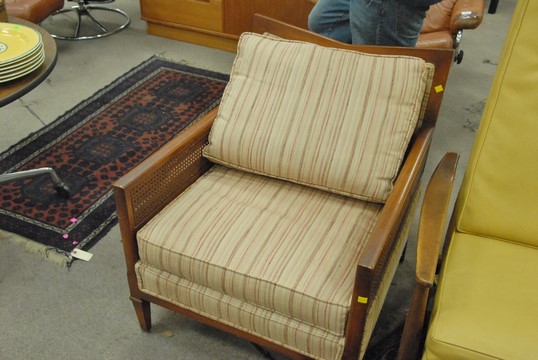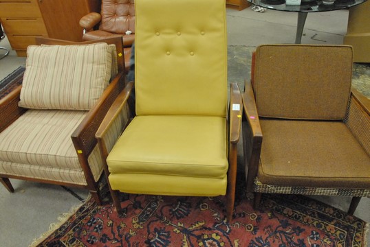 Three piece lot to include Danish Modern lounge chair and two Mid-Century chairs with caned sides.